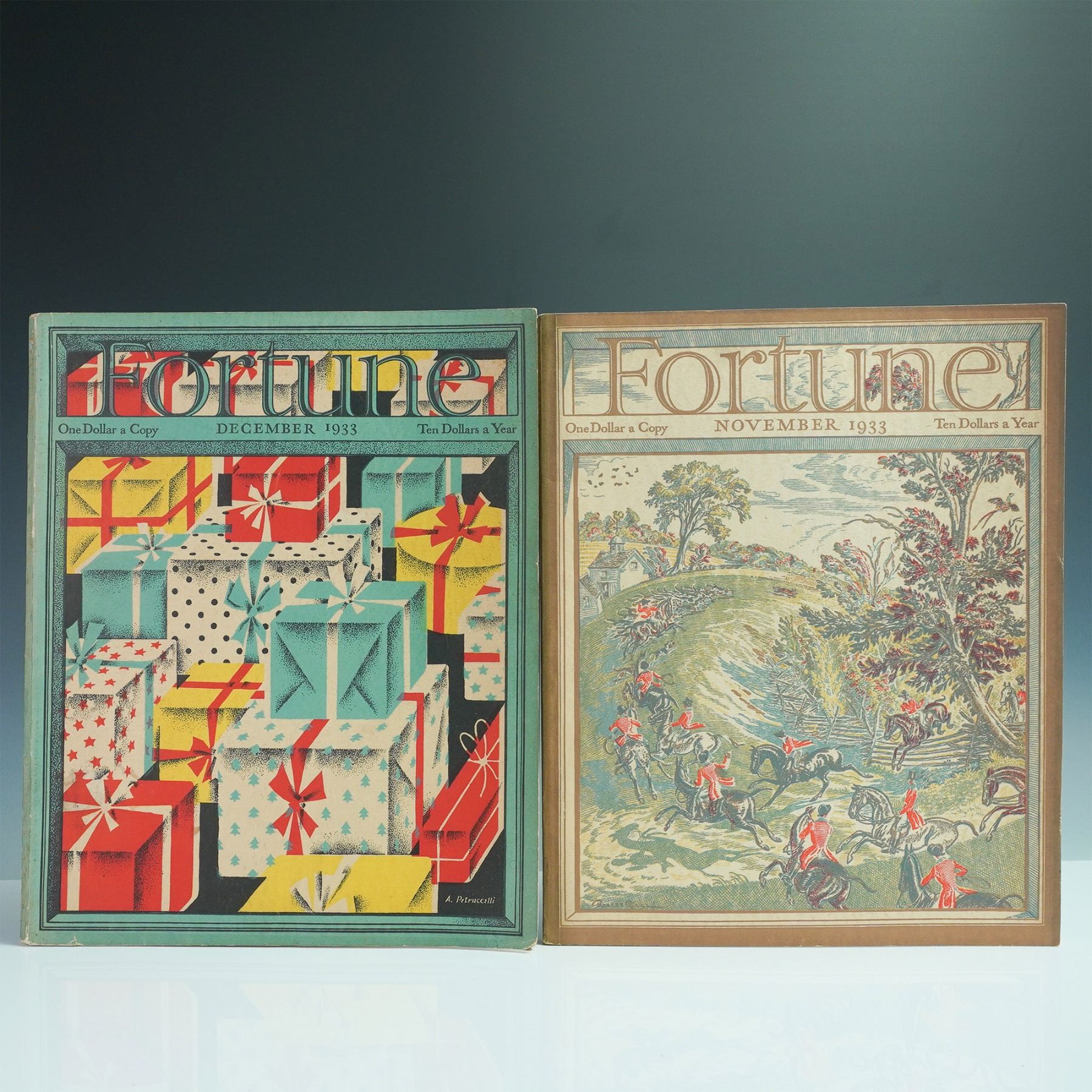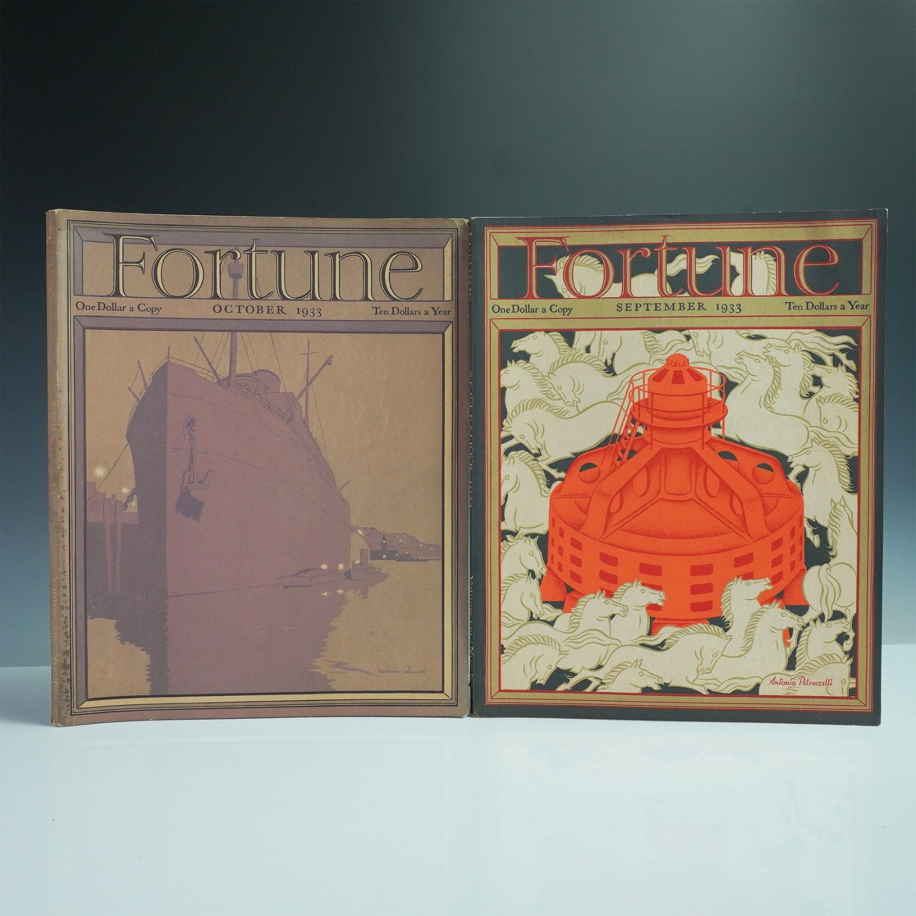 A collection of six Fortune magazines from 1933, featuring issues from July through December. These early editions capture the economic, industrial, and cultural landscape of the time through striking cover art and in-depth articles. Each magazine boasts vibrant period advertisements and detailed illustrations, reflecting the bold design and editorial excellence that made Fortune a standout publication. A remarkable set for collectors of historical periodicals and early 20th-century Americana.