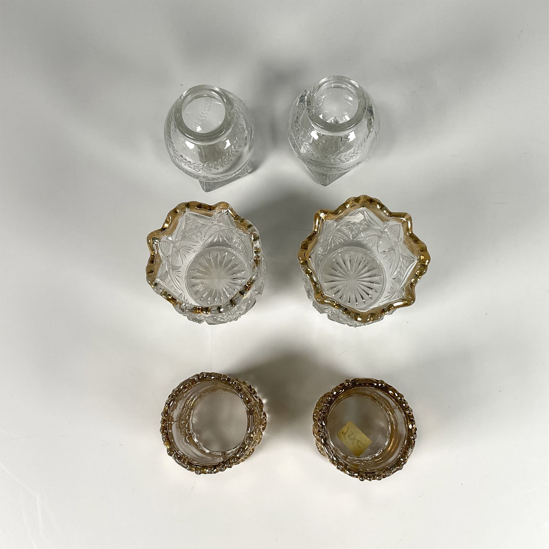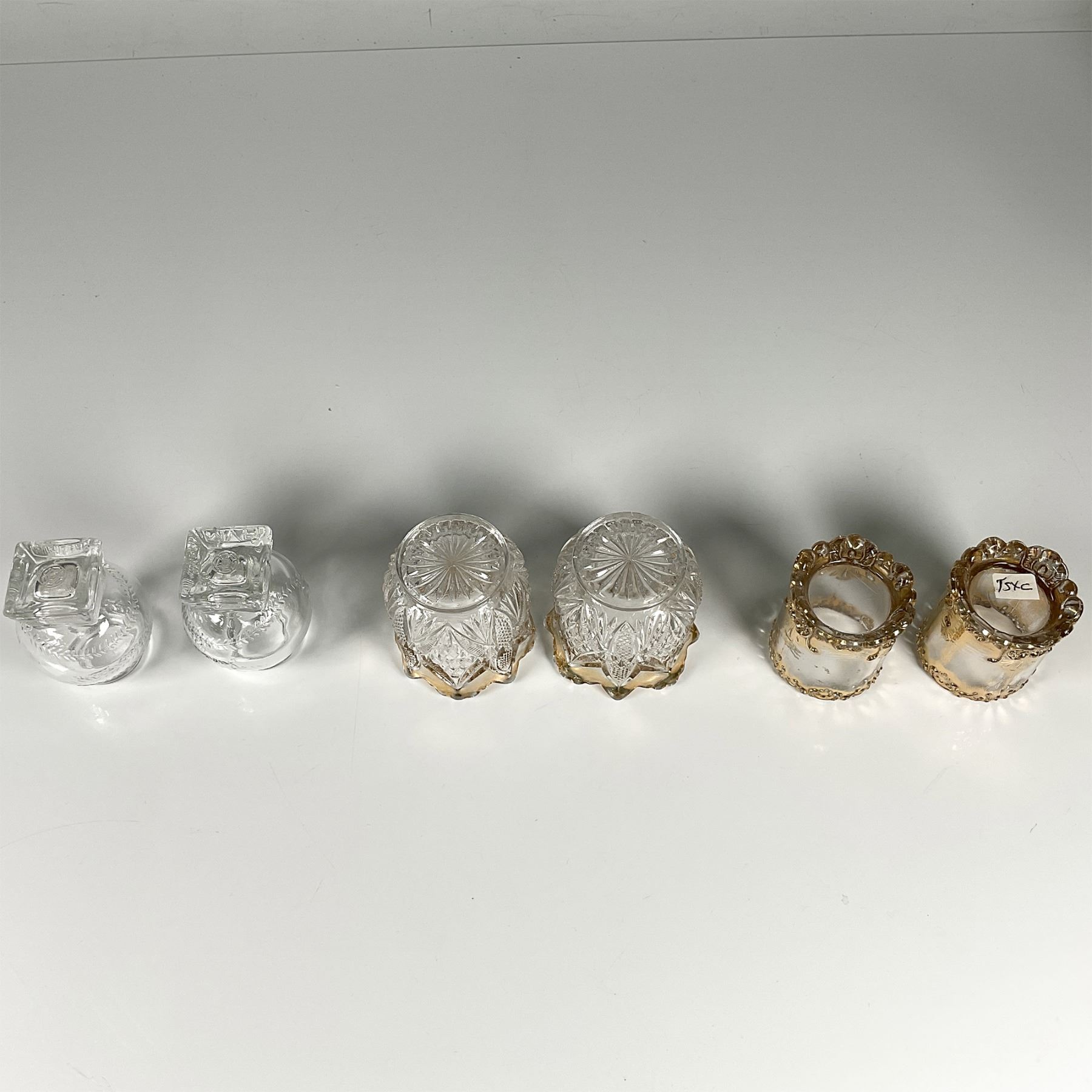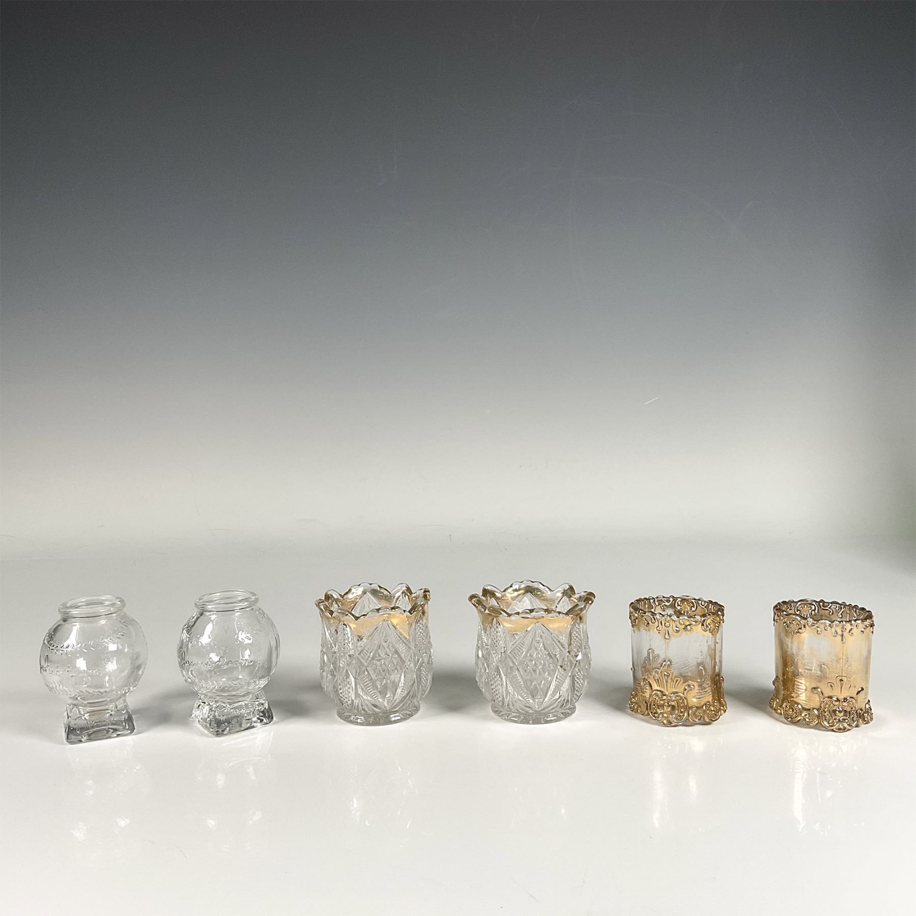 Group of six glass holders featuring two tulip shaped opening: 2.5"W x 2.5"H. Two holder adorned with intricate decorative designs along the top and bottom edges: 1.75"W x 2.25"H. Two Jim Beam baseball shaped holders: 2"W x 2.5"H.