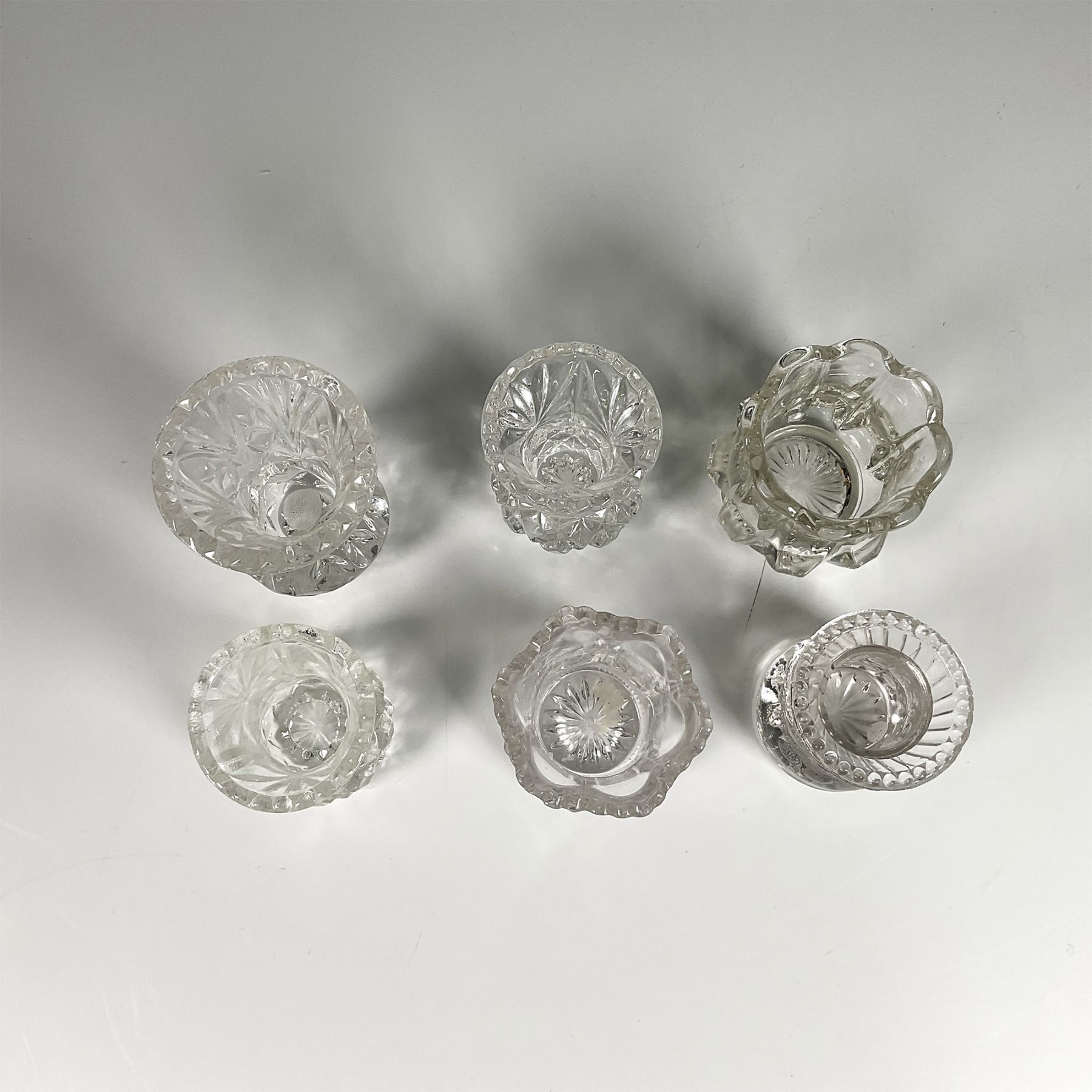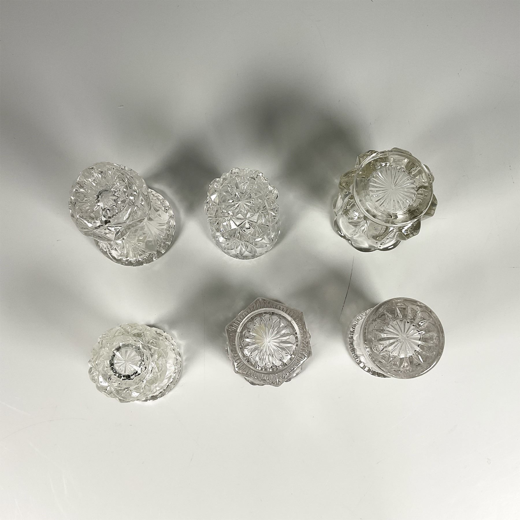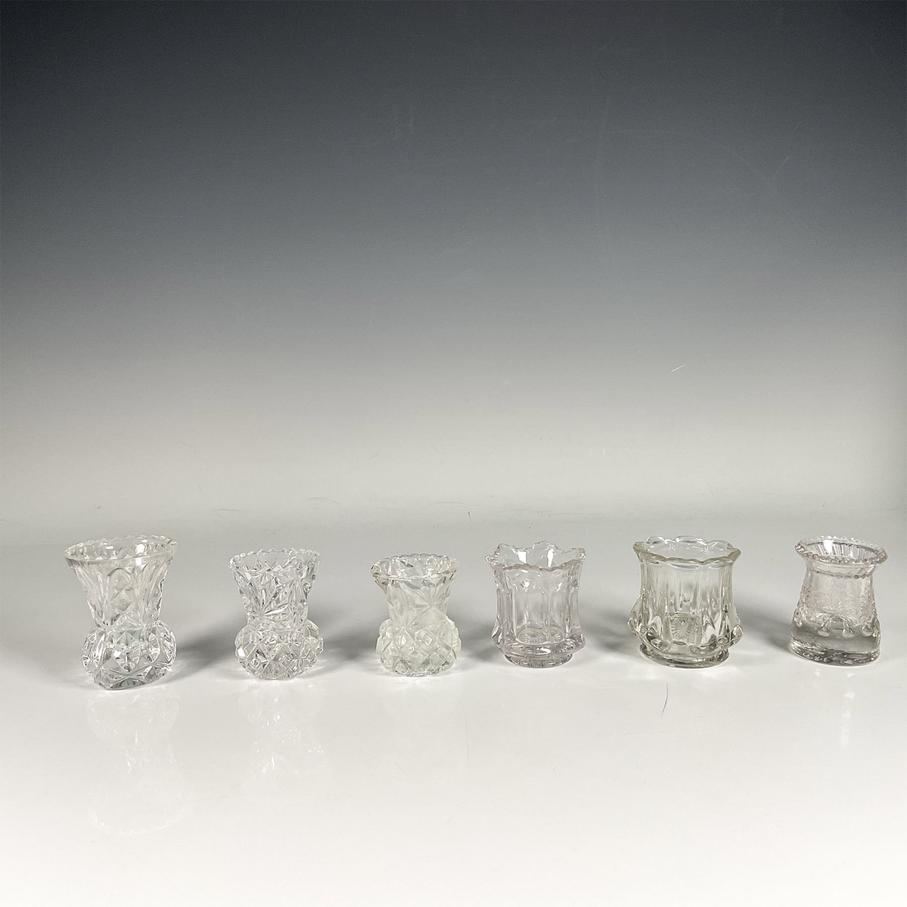 Set of six clear glass holders, featuring a slender shape and intricate glass cut designs. Dimensions of the largest item: 3"H x 2.5" dia.