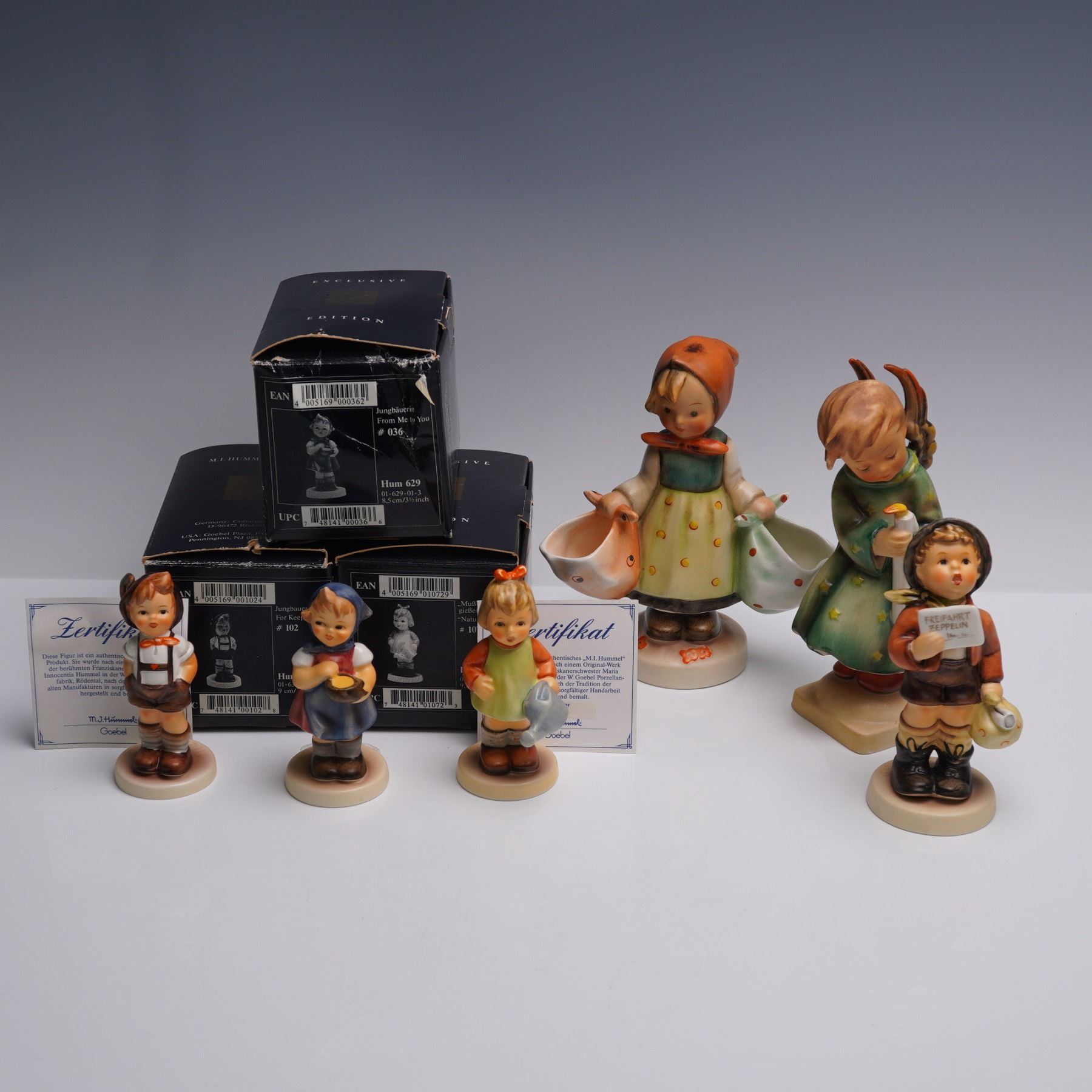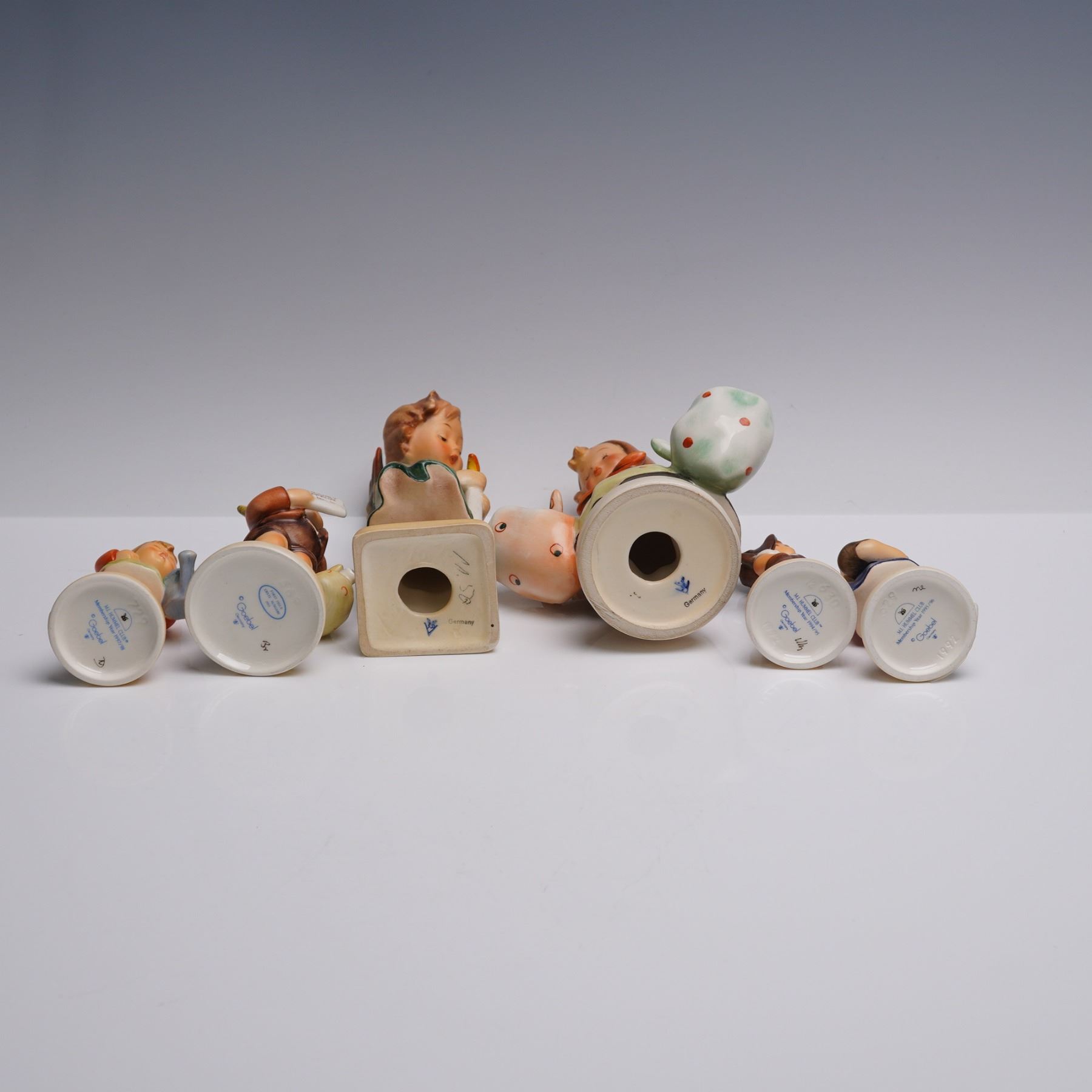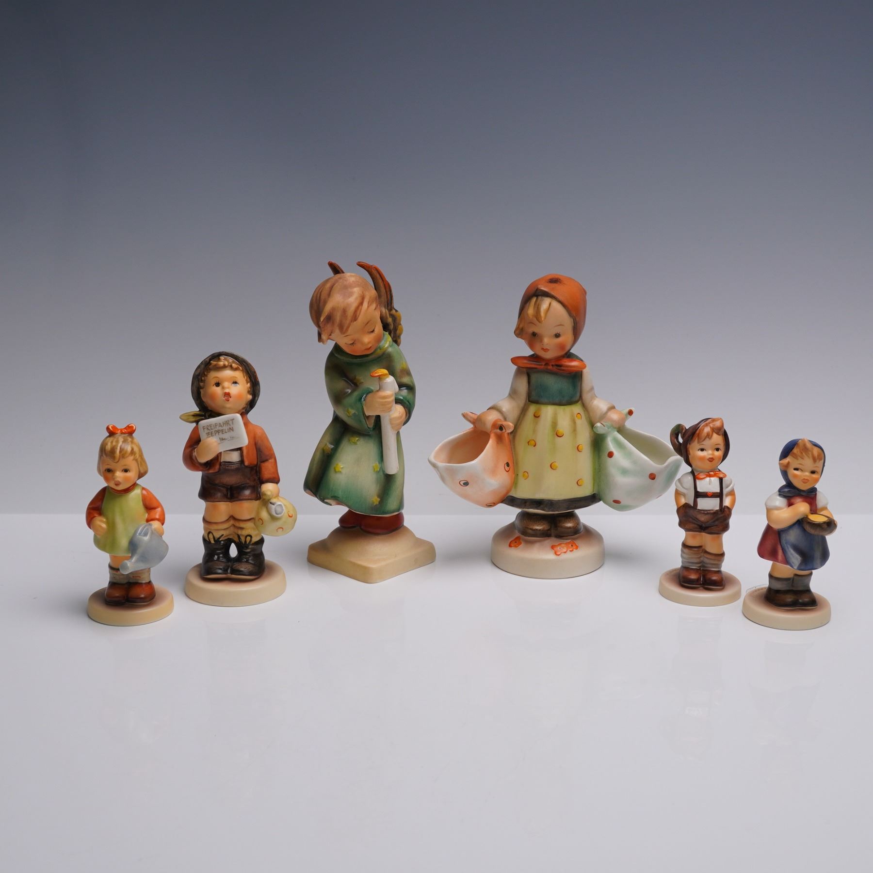Set of six Goebel Hummel figurines depicting children in various endearing poses. Includes a girl holding bags, a girl seated on a fence with flowers, a boy in a top hat singing, a girl in a dress with a basket, a seated kid playing a guitar, and a boy playing a violin. Each piece is marked Goebel W. Germany and features hand-painted details in the warm, expressive style characteristic of Hummel designs.