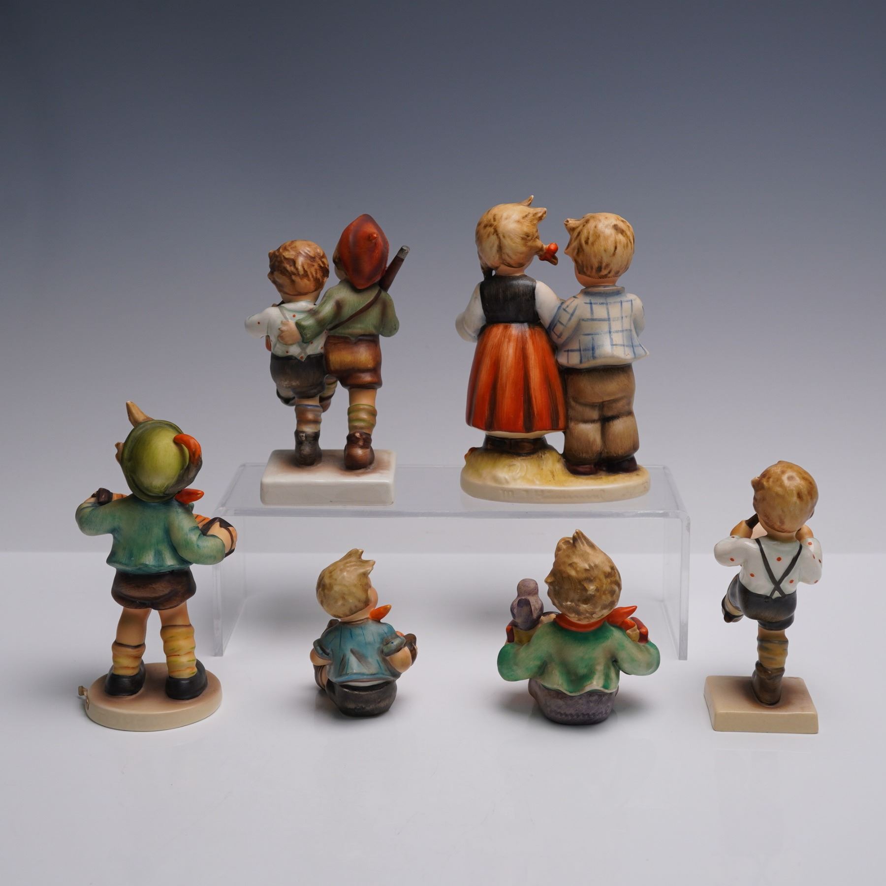Set of six Goebel Hummel porcelain figurines featuring children and angel designs, including Heavenly Angel, Forever Yours, Good Night, and Angel Serenade. Each figurine is hand painted with fine detail and bears the Goebel W. Germany backstamp on the base. The large girl with doll figurine includes its original Goebel Collectors Club box marked Special Edition No. 7. Figurines measure from 3"H to 5.25"H, and the original box measures approx. 7.5"L x 4.5"H.