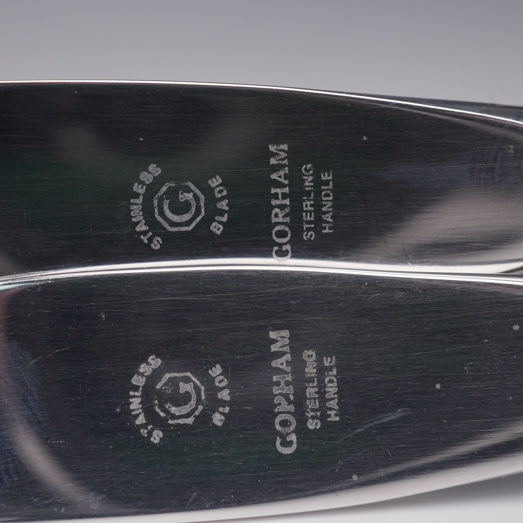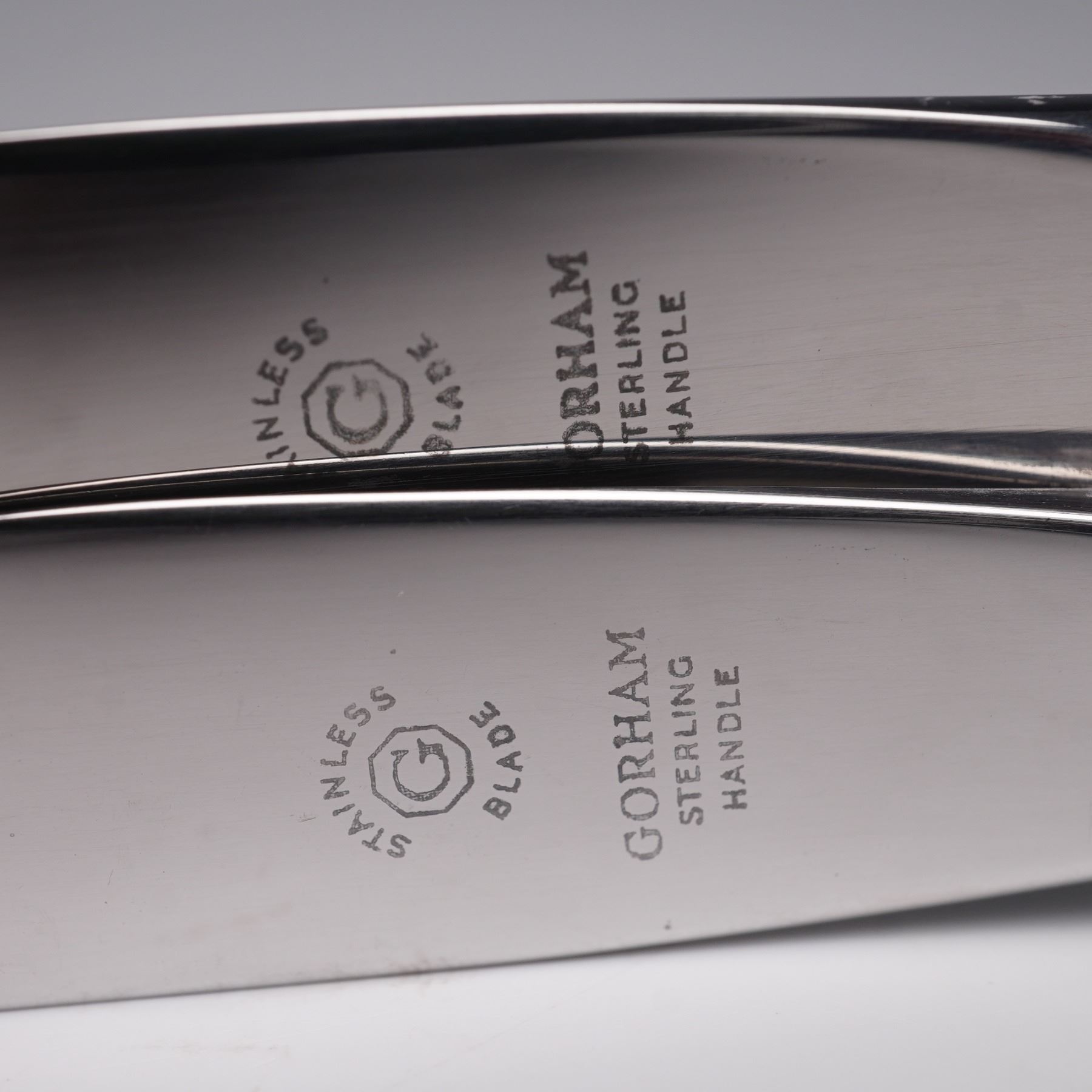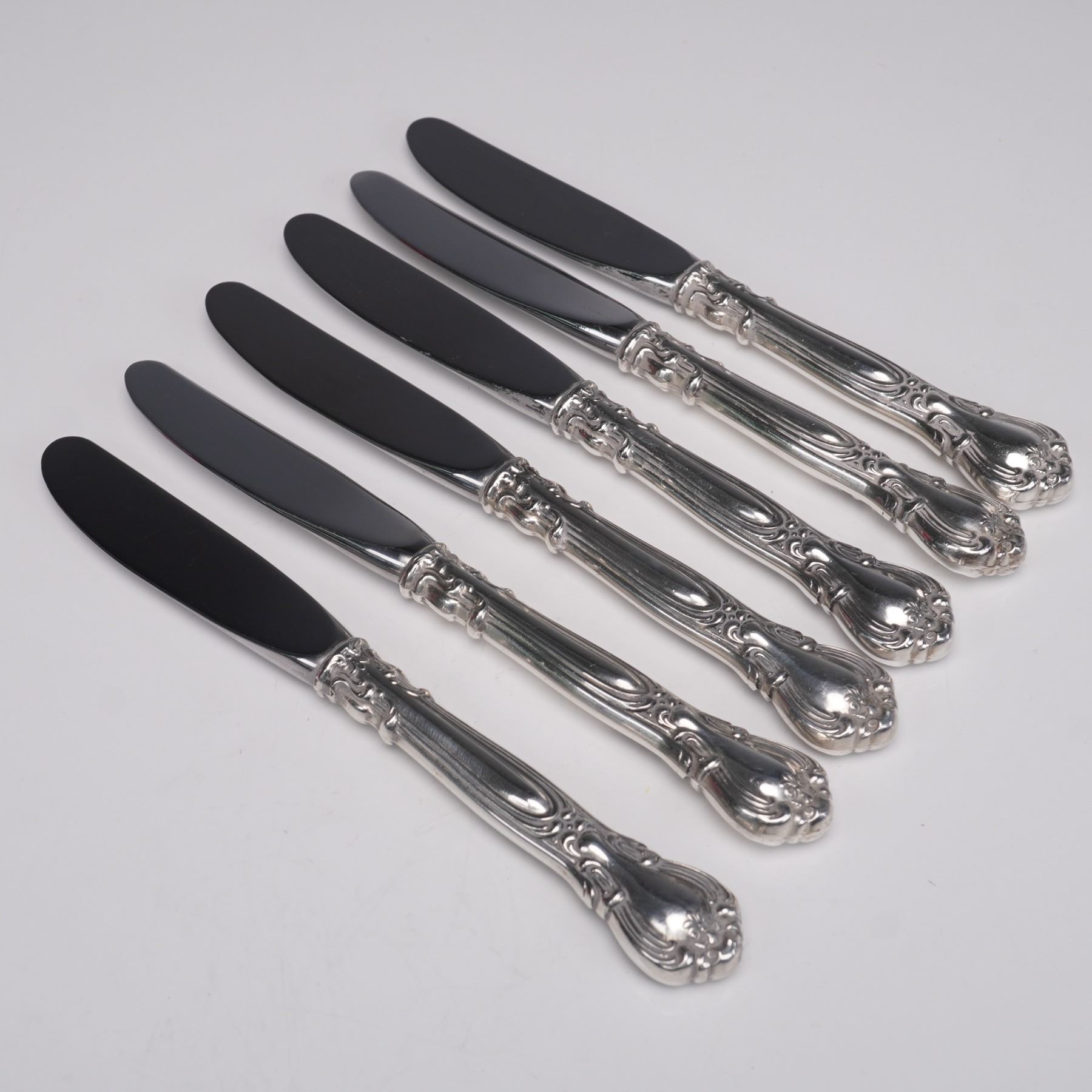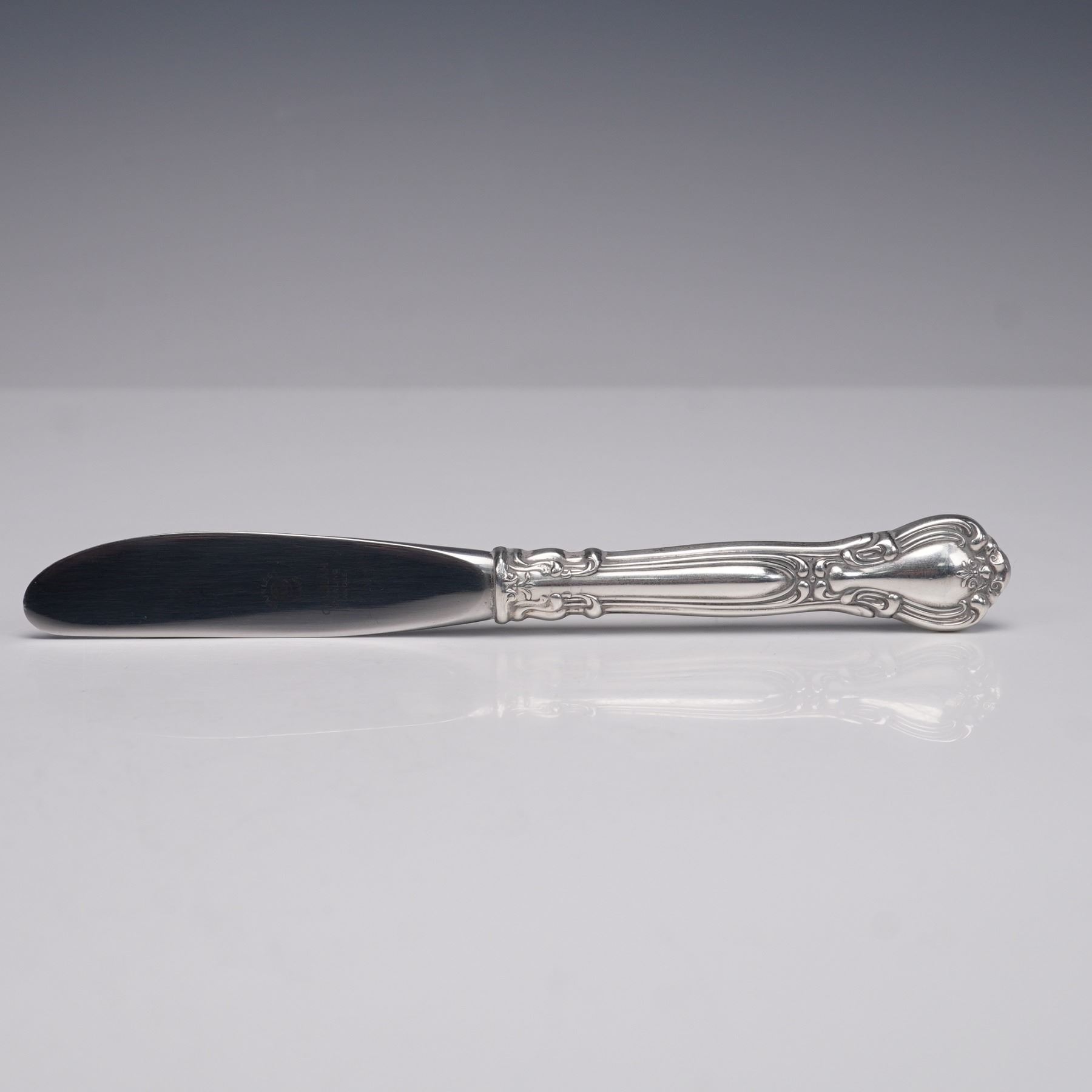 Set of six Gorham butter spreaders featuring sterling silver handles in the elegant Chantilly pattern, first introduced in 1895 and designed by William C. Codman. The handles display the classic scroll and shell motif for which the pattern is renowned, paired with stainless steel blades marked Gorham Sterling Handle and Stainless Blade. These versatile spreaders are ideal for butter, soft cheeses, or spreads, and bring timeless sophistication to the table. Total weight 8.38 oz.