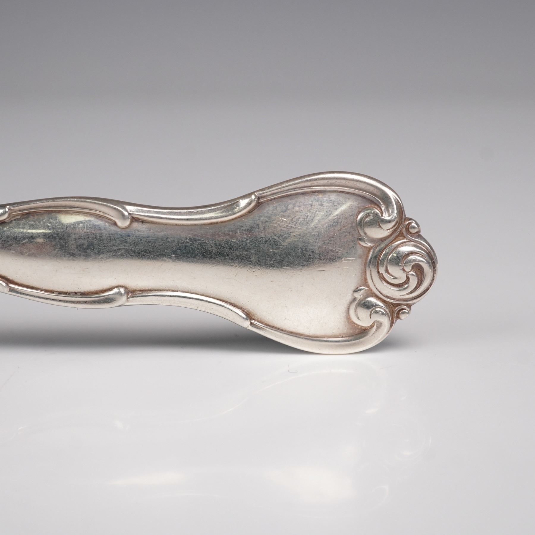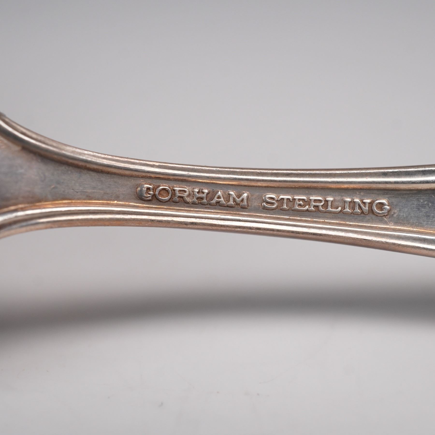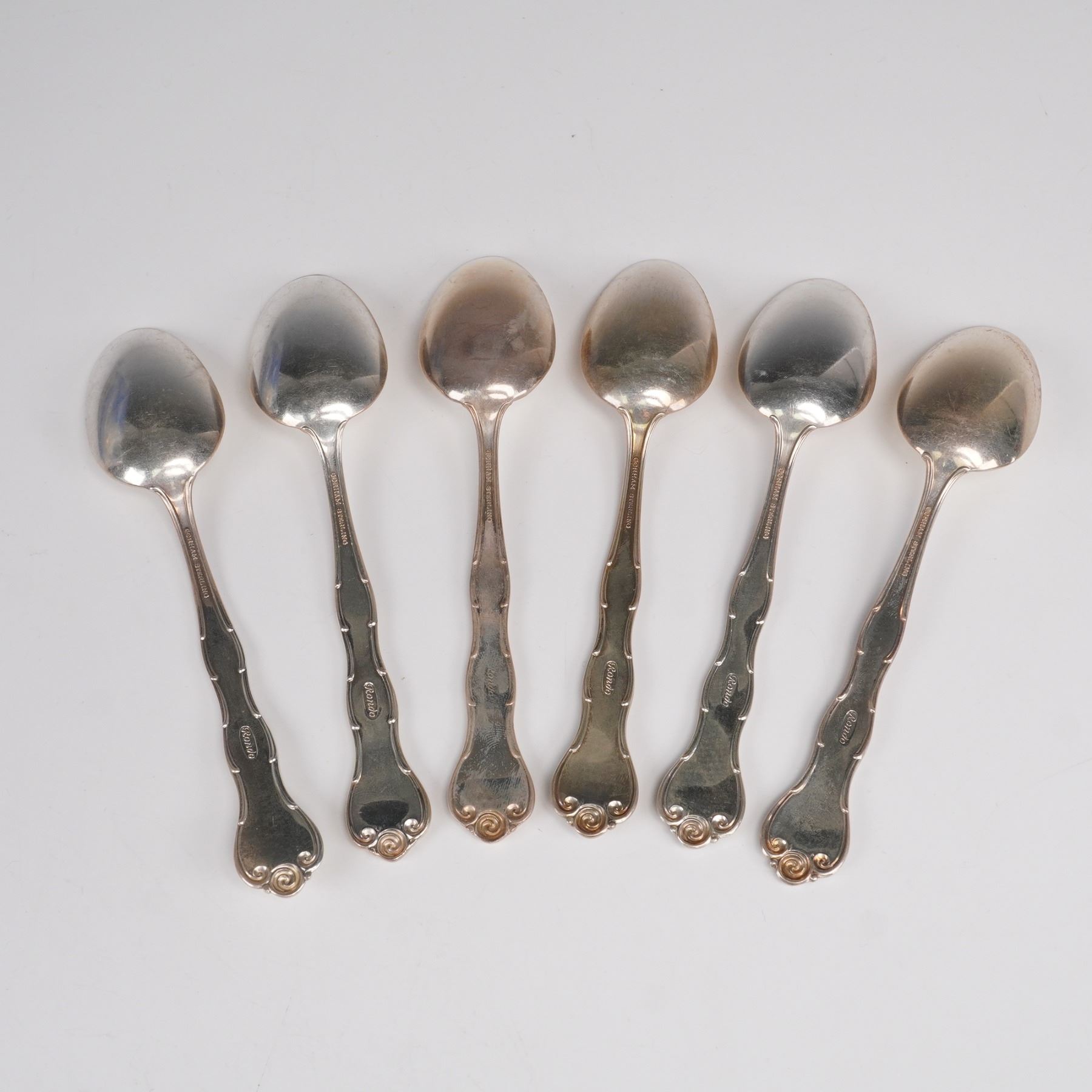 A set of 6 Gorham sterling silver teaspoons in the Rondo pattern, designed with softly scalloped handles ending in stylized scroll motifs that reflect mid century style. Each spoon is stamped on the reverse with Gorham Sterling and the Rondo pattern mark, confirming the maker and silver content. Combined Net Silver 5.5 troy oz.