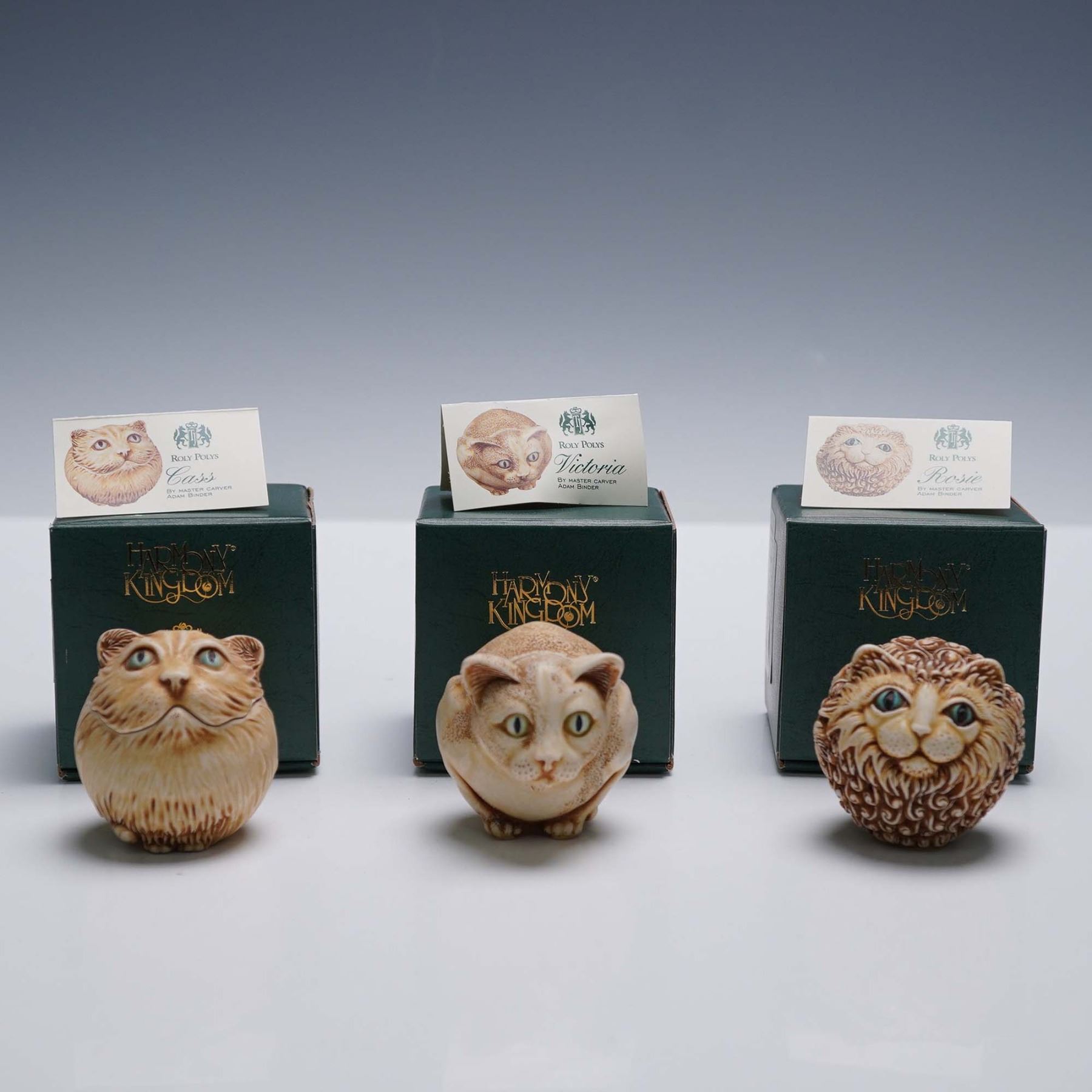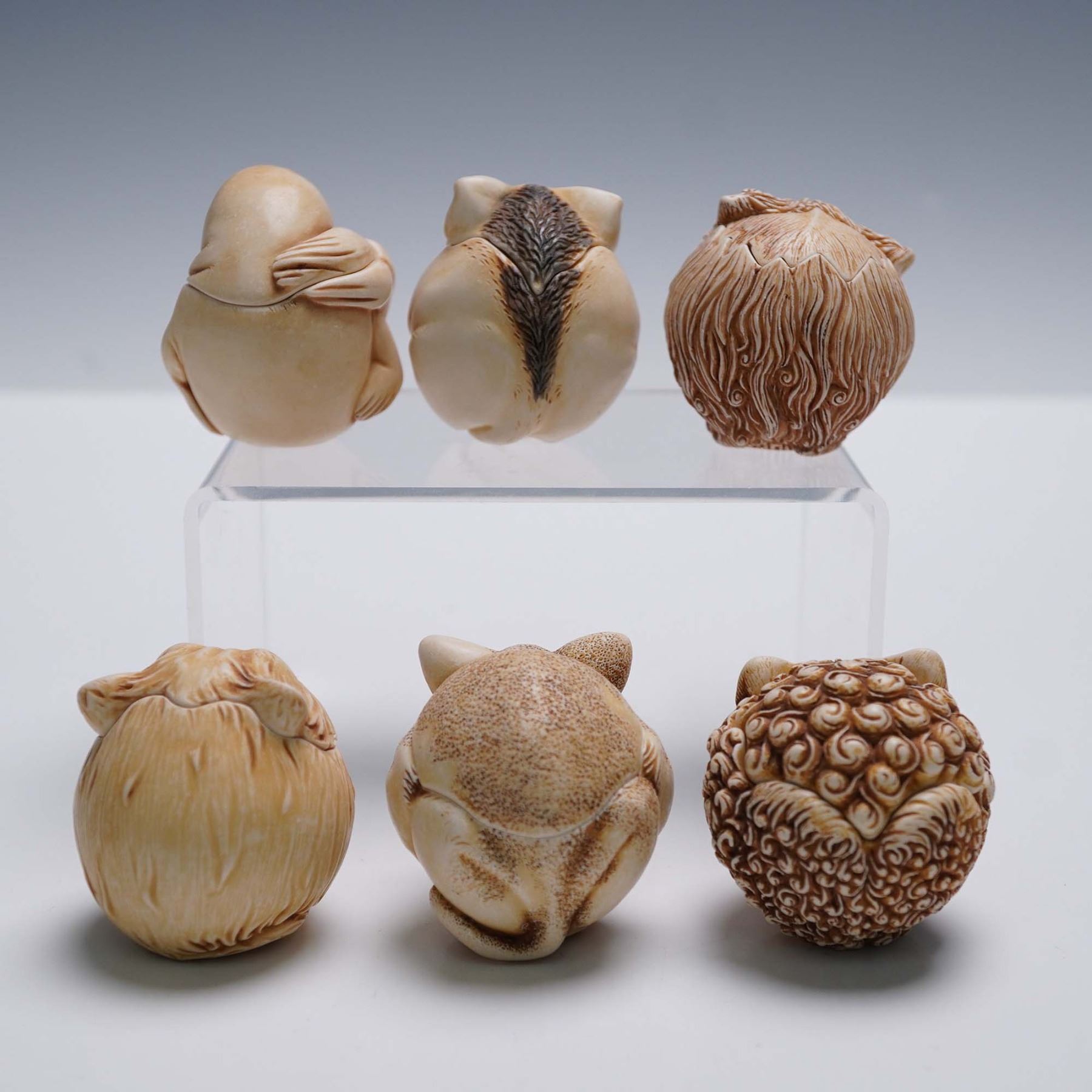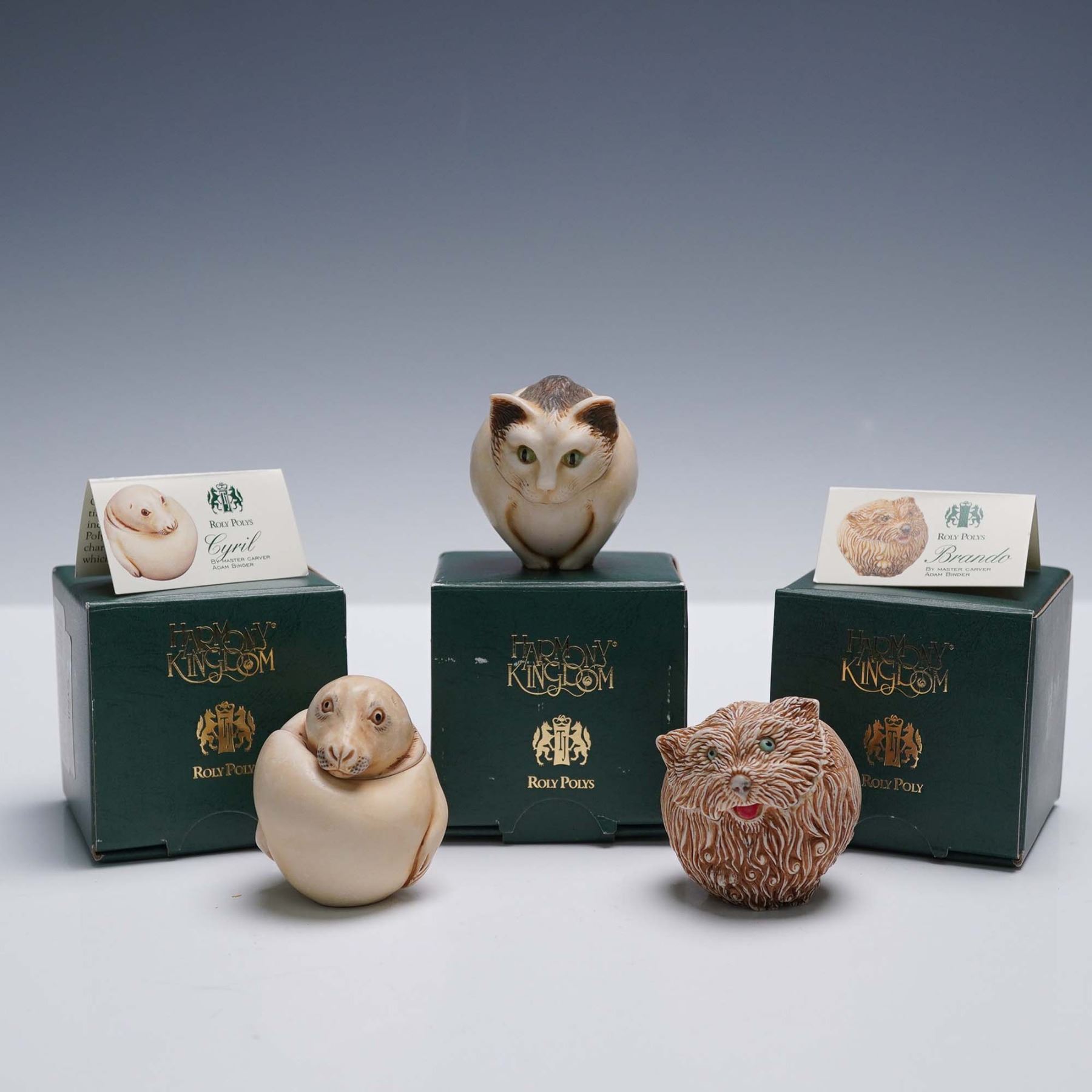 Group of six opening figurine boxes from the Harmony Kingdom Roly Polys series, designed by British sculptor Adam Binder. Each piece is handcrafted in the English Cotswolds from crushed marble and resin, featuring humorous and rotund animal forms with lids. Figures include Cyril (seal), Victoria (cat), Brando (dog), and three additional feline-themed characters. Some interiors are adorned with carved details, while others are unadorned. These collectible figural boxes highlight the signature charm and intricate detailing for which Harmony Kingdom is known. Backstamps present on all pieces. Includes original boxes.