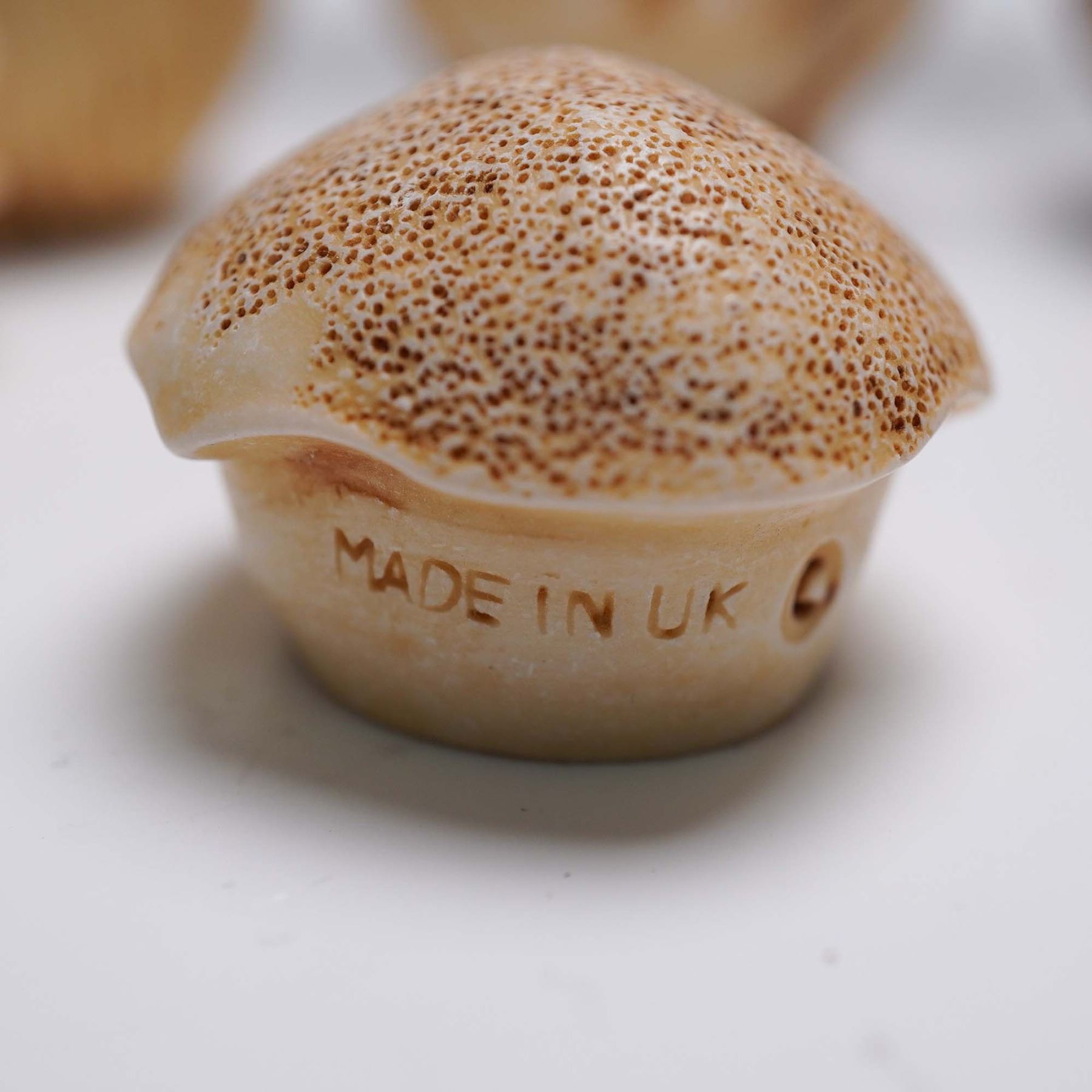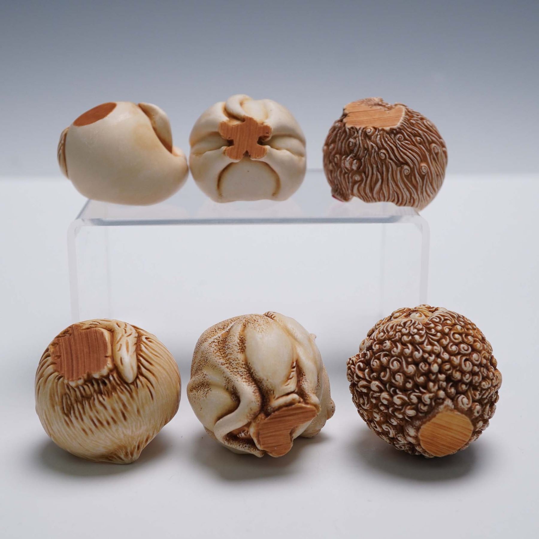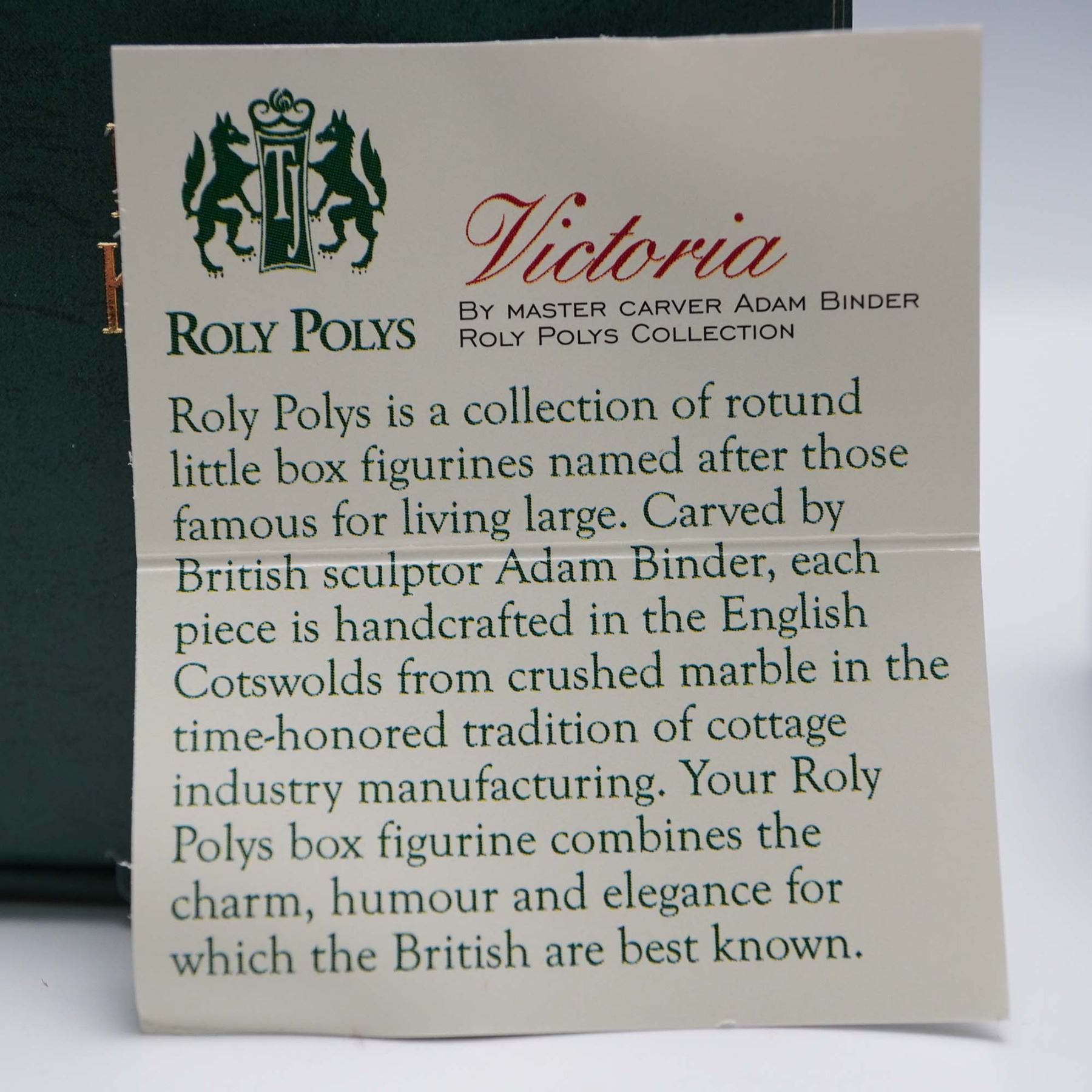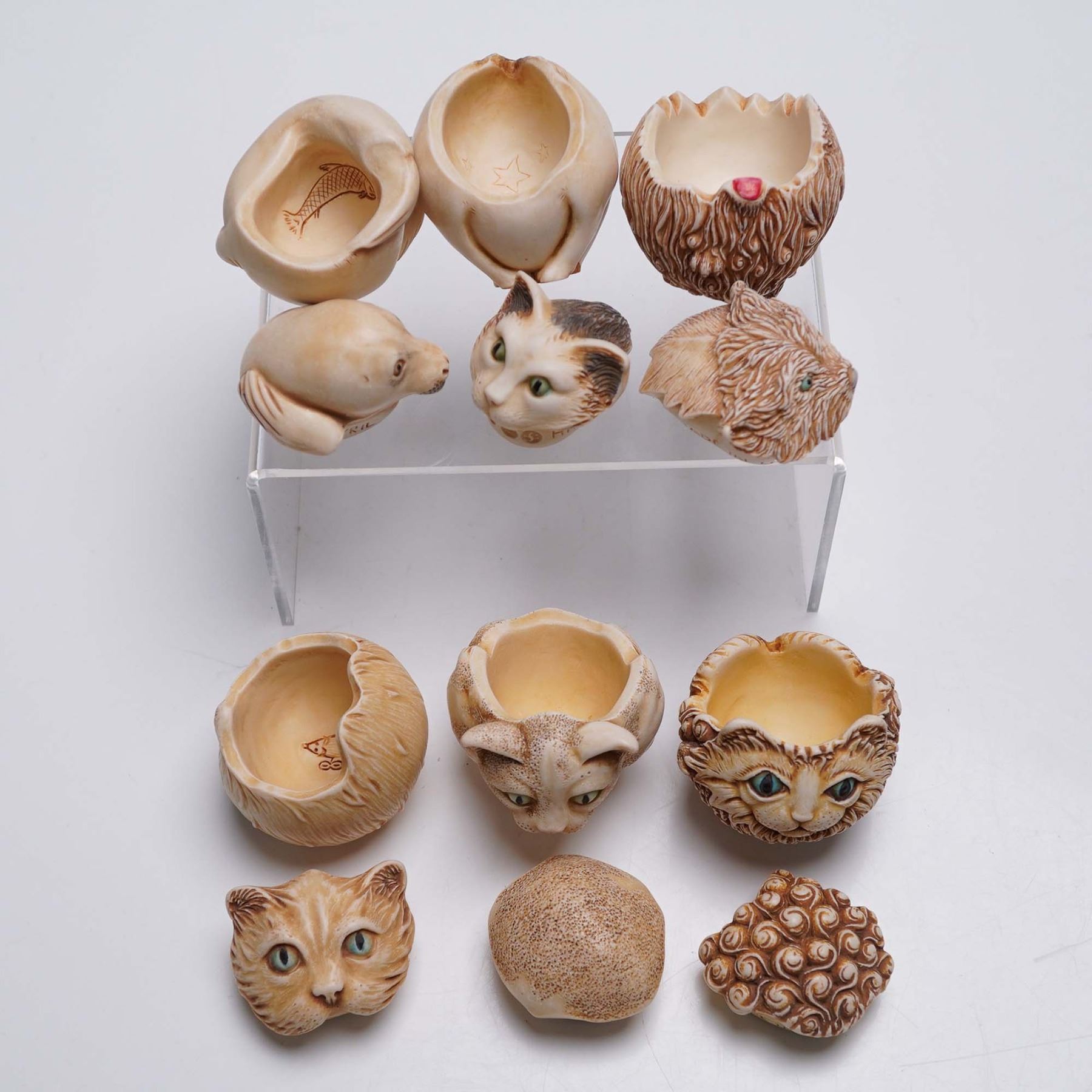 Group of six opening figurine boxes from the Harmony Kingdom Roly Polys series, designed by British sculptor Adam Binder. Each piece is handcrafted in the English Cotswolds from crushed marble and resin, featuring humorous and rotund animal forms with lids. Figures include Cyril (seal), Victoria (cat), Brando (dog), and three additional feline-themed characters. Some interiors are adorned with carved details, while others are unadorned. These collectible figural boxes highlight the signature charm and intricate detailing for which Harmony Kingdom is known. Backstamps present on all pieces. Includes original boxes.