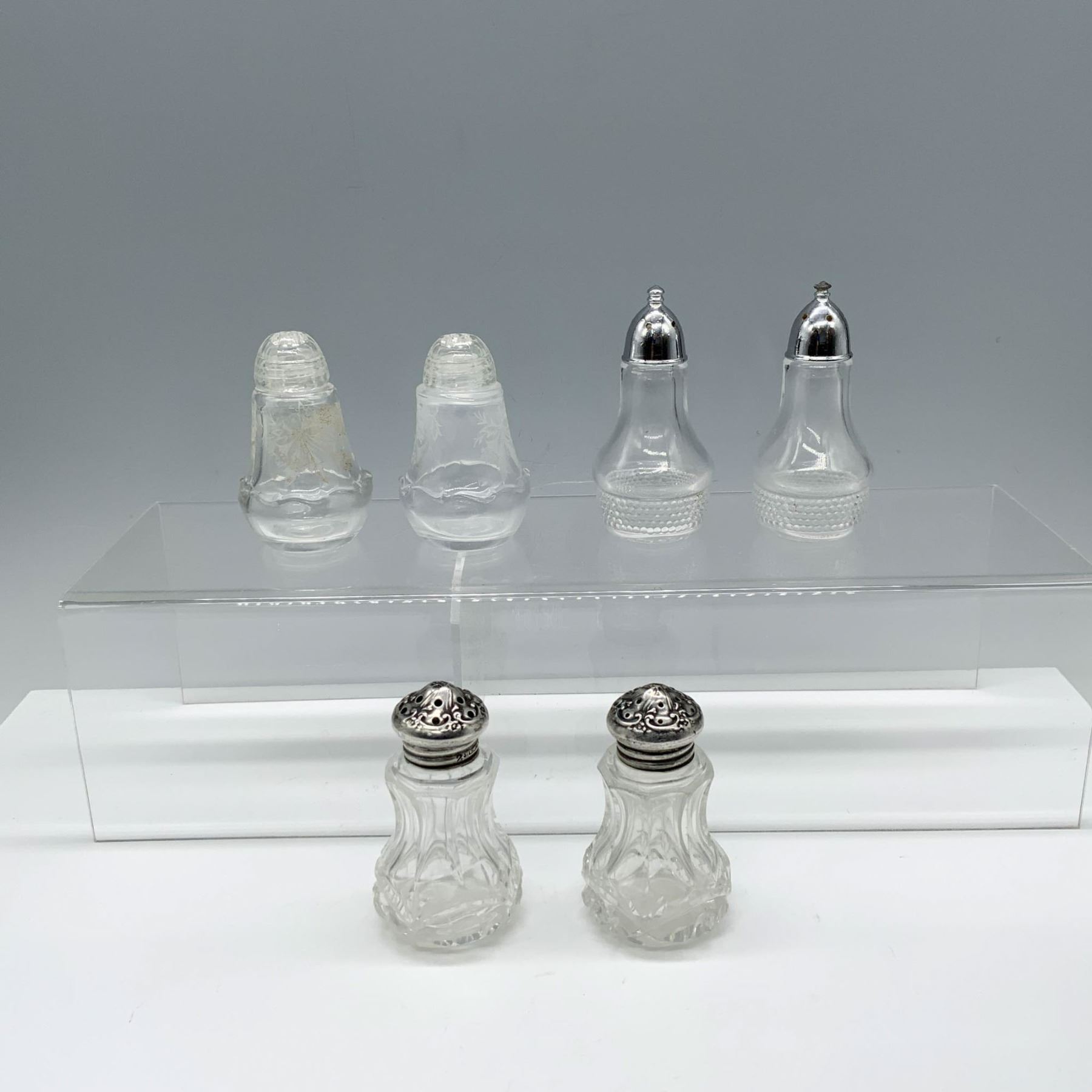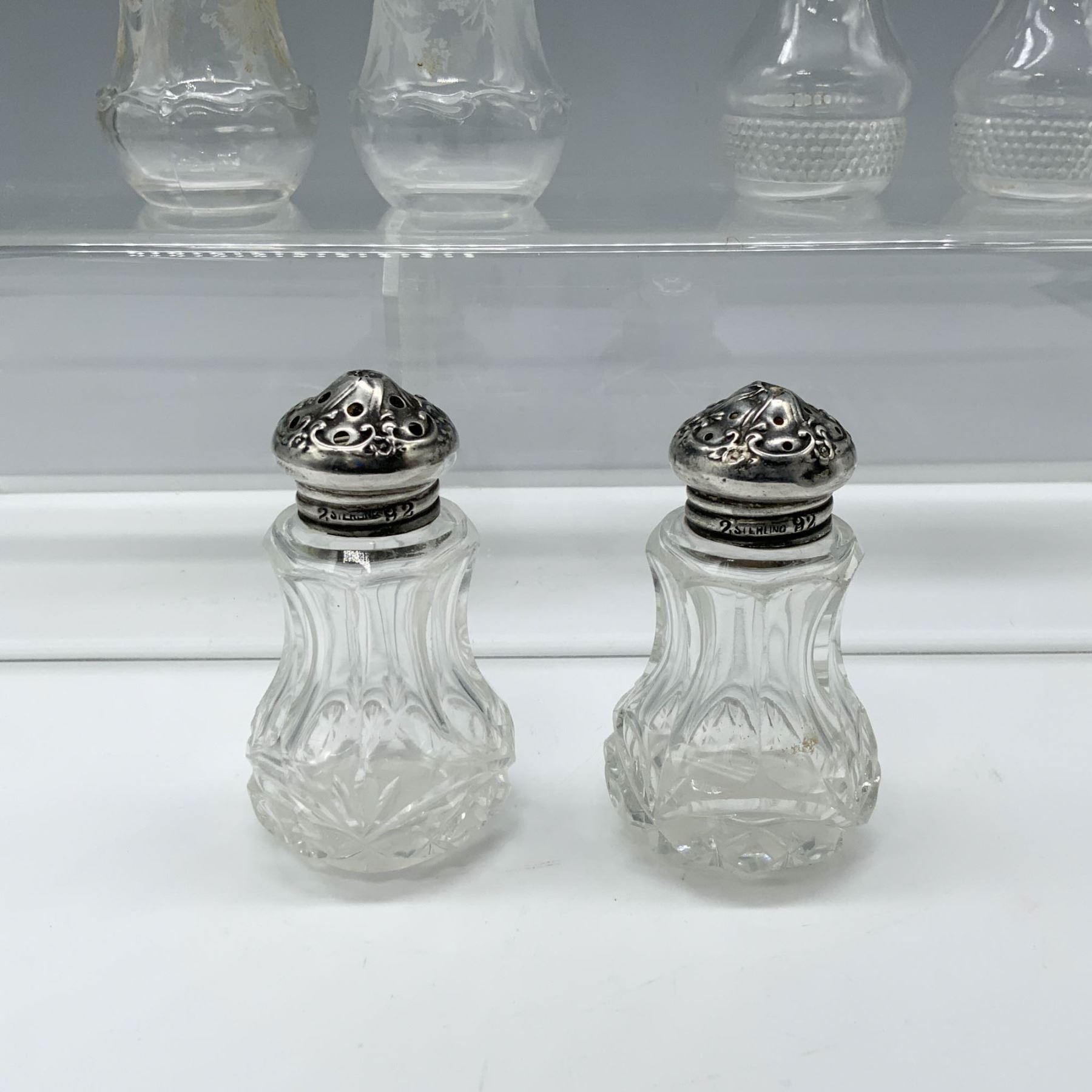 Splendid collection of three different pairs of salt and peppers shakers that includes a sterling silver lidded 10g duo backstamped 2 Sterling 92, a Duncan and Miller Teardrop duo, and a Heather etched floral duo. Largest item measures 3.5"H x 1.75" dia.