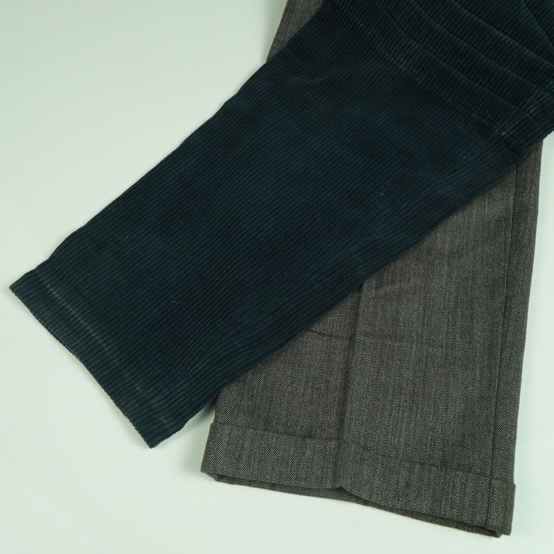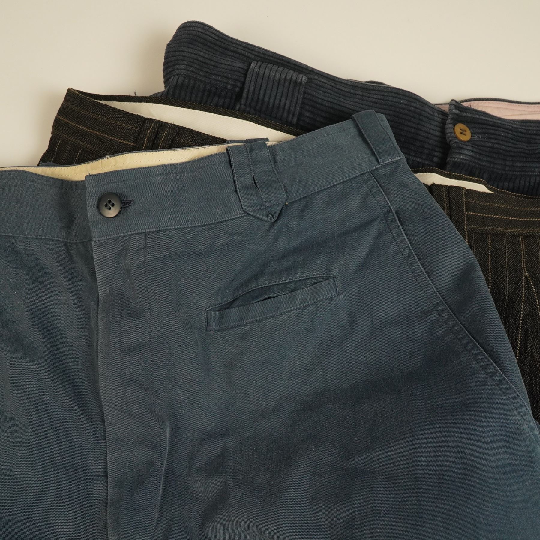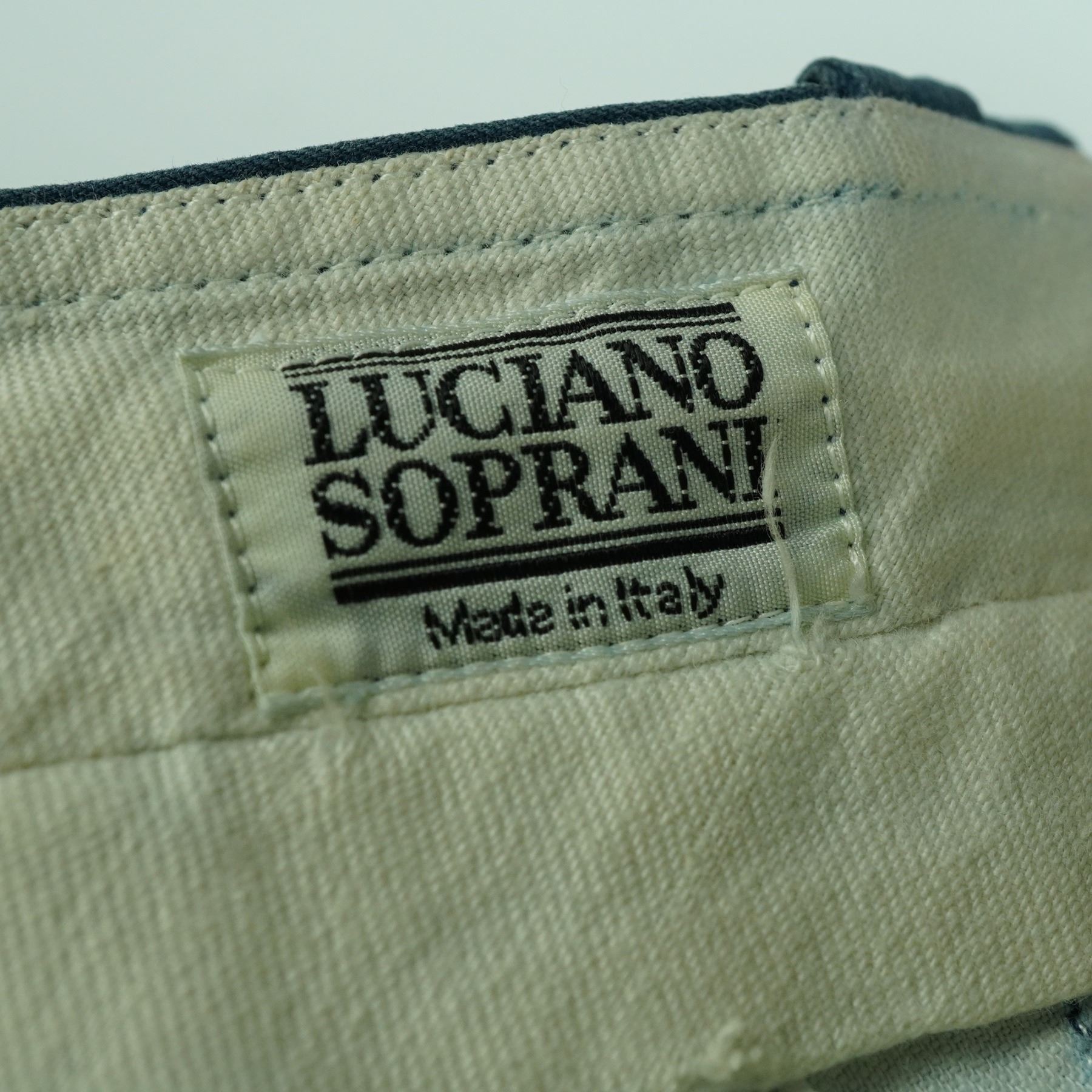 A stylish assortment of six pairs of men's trousers, all made in Italy and Spain by renowned European designers. This collection includes finely tailored pieces from Luciano Soprani, Sergio Girombelli, Gianni Versace, and Armand Basi, showcasing a refined mix of materials and finishes. The lot features a variety of styles including pinstripes, herringbone, corduroy, and garment-washed cotton cargos, rendered in classic tones of navy, grey, charcoal, and muted blue. Ideal for collectors, stylists, or resellers seeking authentic continental menswear with a mix of vintage and contemporary appeal. Size 48.