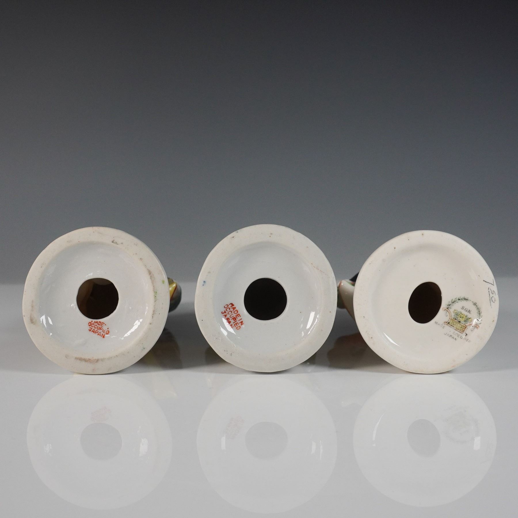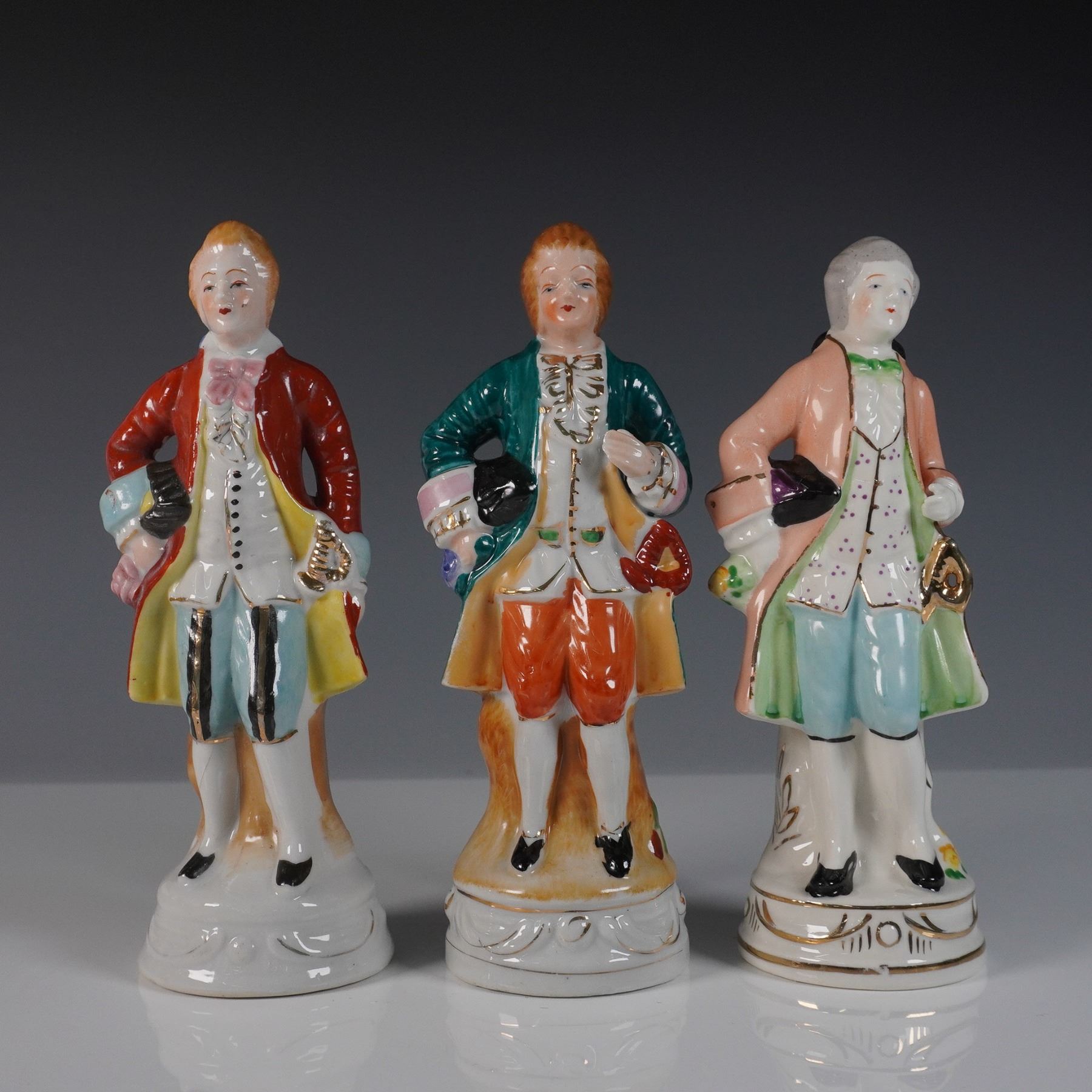 This 6pc set of Japanese porcelain figurines features finely detailed colonial-style gentlemen dressed in 18th-century attire. Each figure varies slightly in design, with hand-painted coats, waistcoats, and accessories accented with gold detailing. The tallest figurine stands at 7.75"H. Made in Japan and Occupied Japan, these charming pieces highlight the craftsmanship of mid-20th-century Japanese ceramics. Perfect for collectors of vintage porcelain or those seeking a touch of historic elegance.