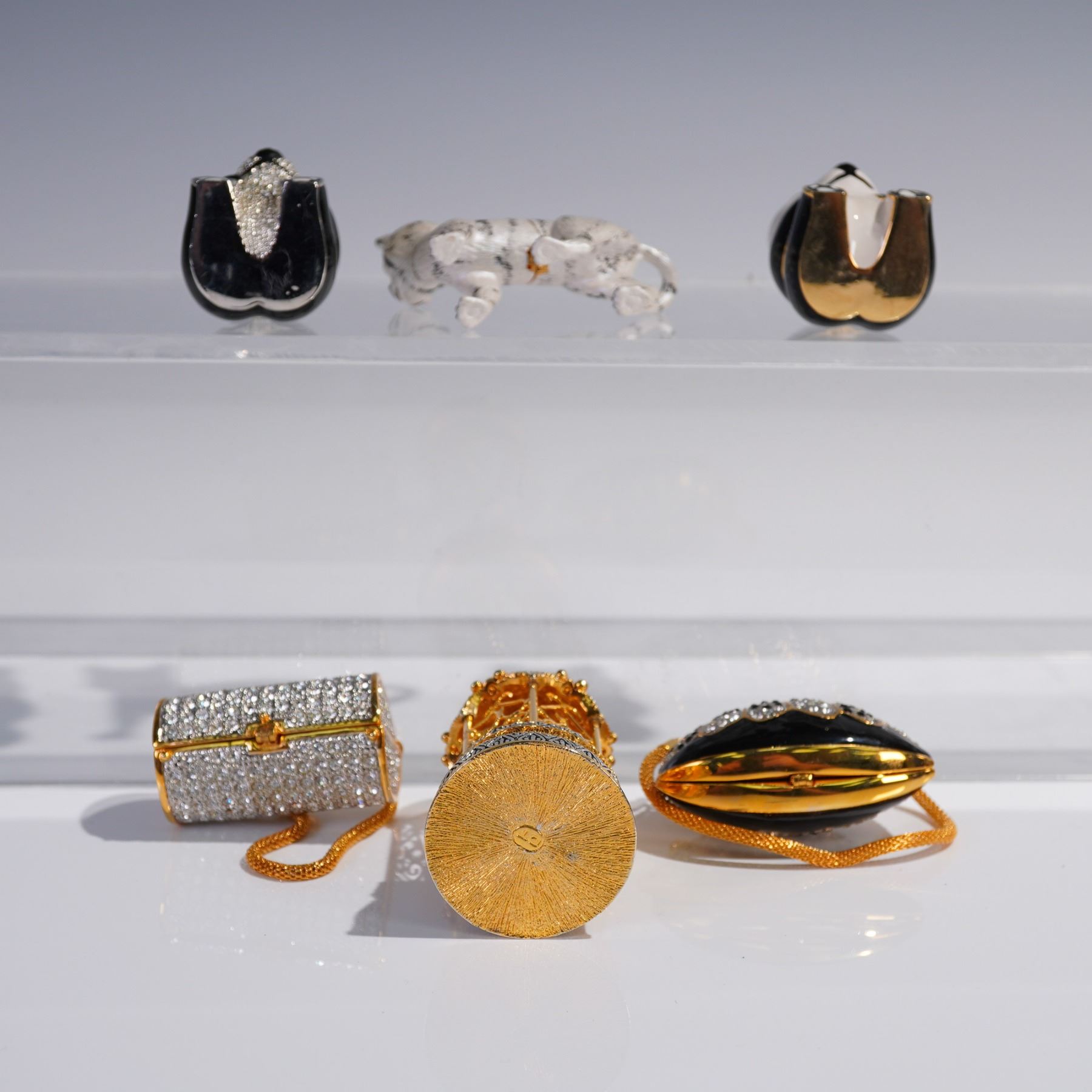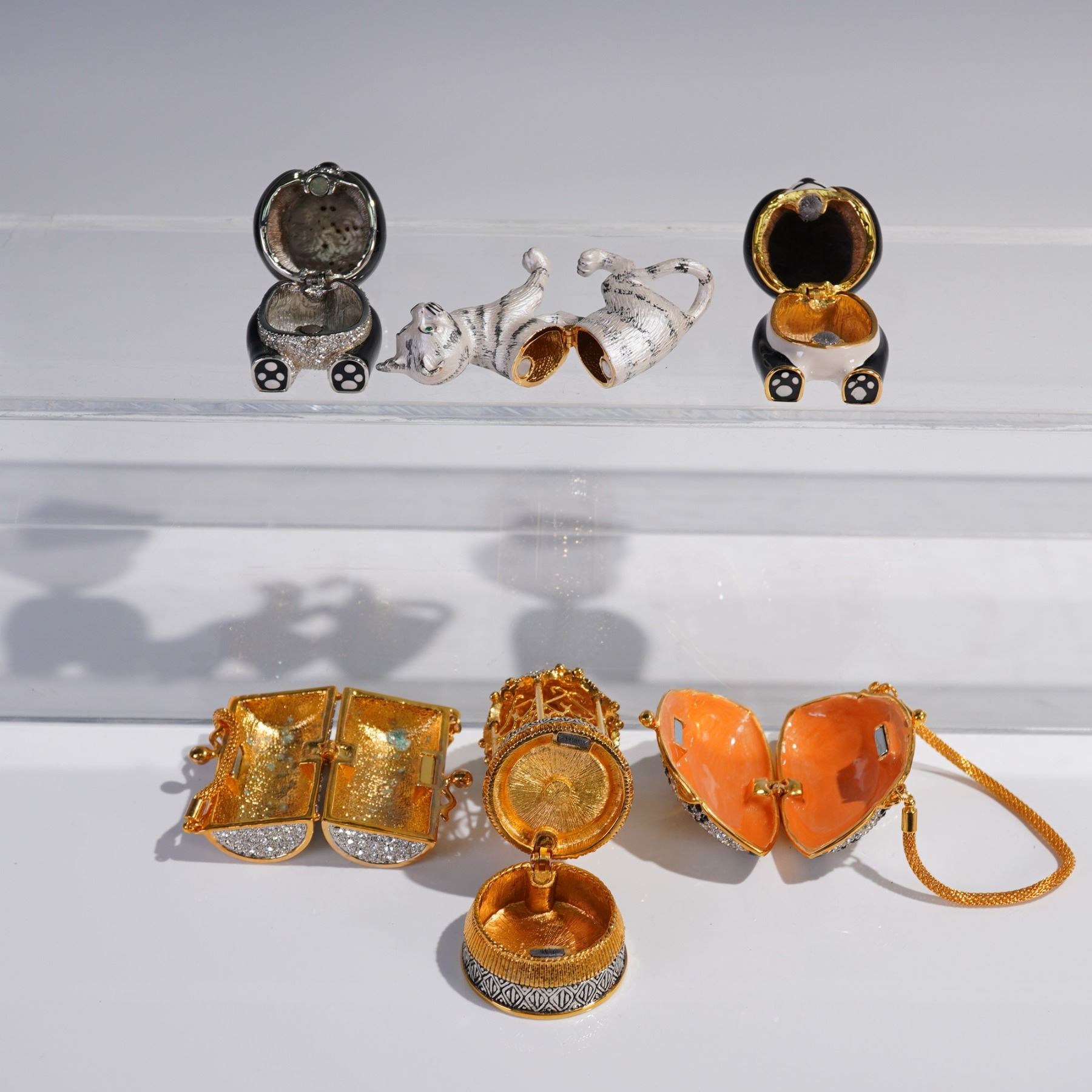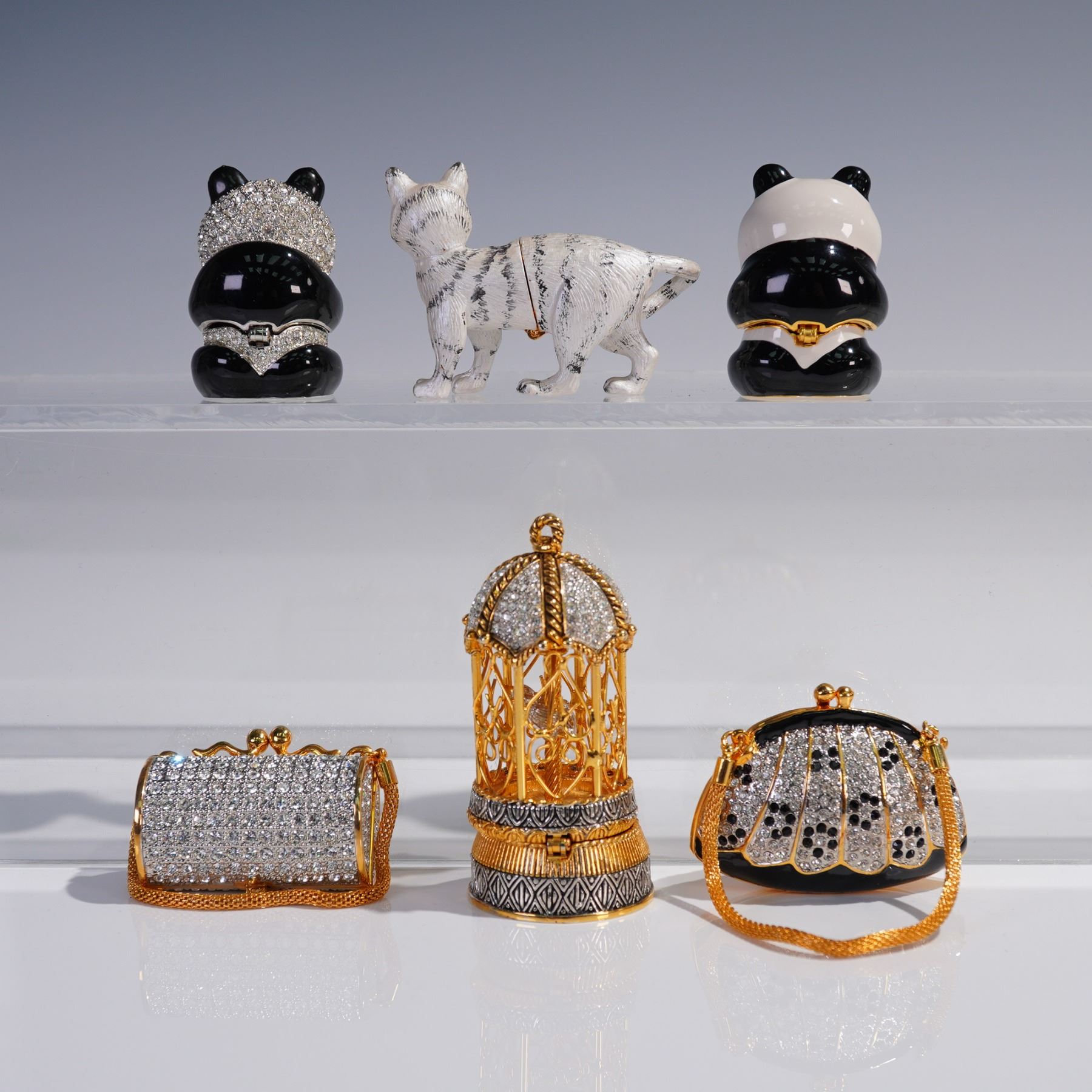 An eye catching set of six jeweled ring boxes each crafted with whimsical charm and intricate detailing. The collection includes three handbag style boxes adorned with pave crystals and metallic gold accents one shaped like a fan clutch one cylindrical evening bag and one sculpted as a birdcage with lattice and filigree work. Complementing these are three animal themed boxes two sparkling black and white panda bears and one silver tone tabby cat with fine engraved fur detailing. Each box is hinged and opens to reveal a small compartment suitable for rings or tiny keepsakes. These miniature containers offer both playful decorative appeal and practical use for jewelry storage. Sizes range from approximately 2"L to 3.25"H