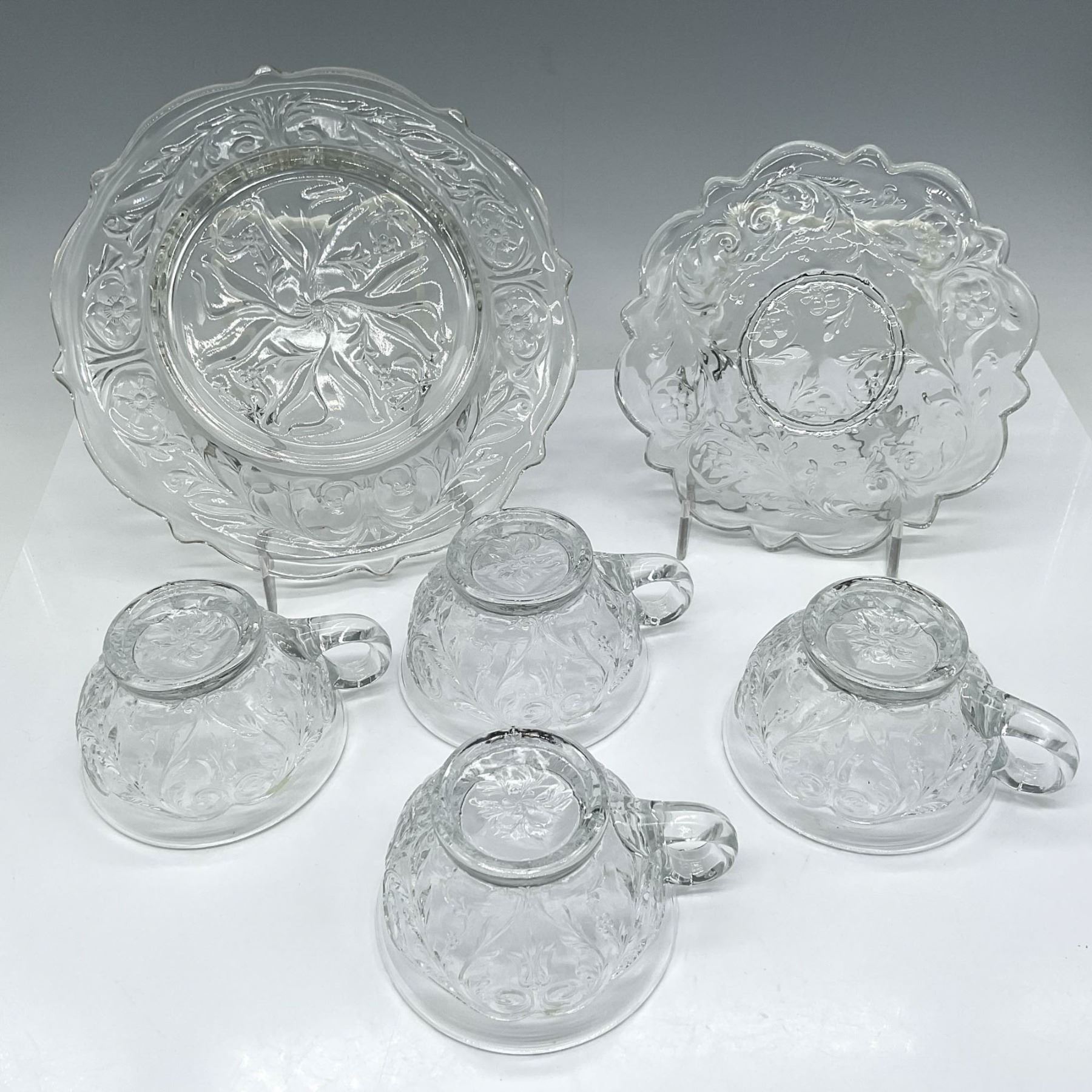 Lovely embossed clear glass. Lot includes 4 cups; 1 saucer; and 1 salad plate. Largest piece 1"H x 8" dia.