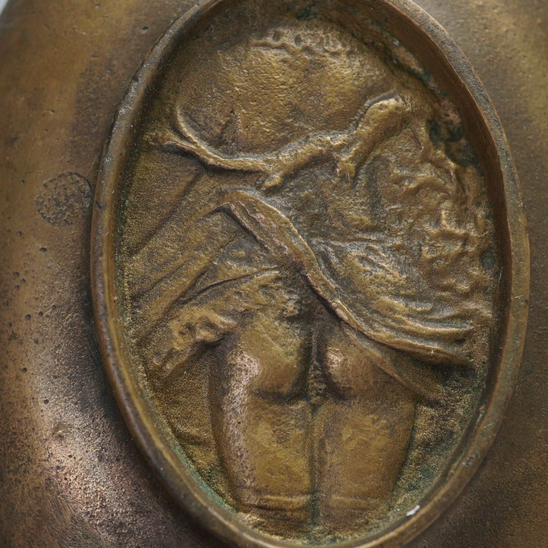 A compelling assemblage of six vintage cast metal ashtrays and decorative trays rendered in bronze, copper, and mixed metal alloys. Included is a brass ashtray modeled in relief with the image of the Lions Mound, a memorial at the battlefield in Belgium, a brass art nouveau ashtray with a female nude amongst waves, a metal Hummel Hamburg ashtray with a figural man standing, carrying pails in either arm. Also included is a metal ashtray with the American Eagle and thirteen stars representing the original colonies, a oval metal dish designed with an apple picking girl, and a bronze ashtray with the inscription "If a man can write a better book, preach a better sermon or make a better mousetrap than his neighbor, though he build his house in the woods, the world will make a beaten path to his door", by Ralph Waldo Emerson.