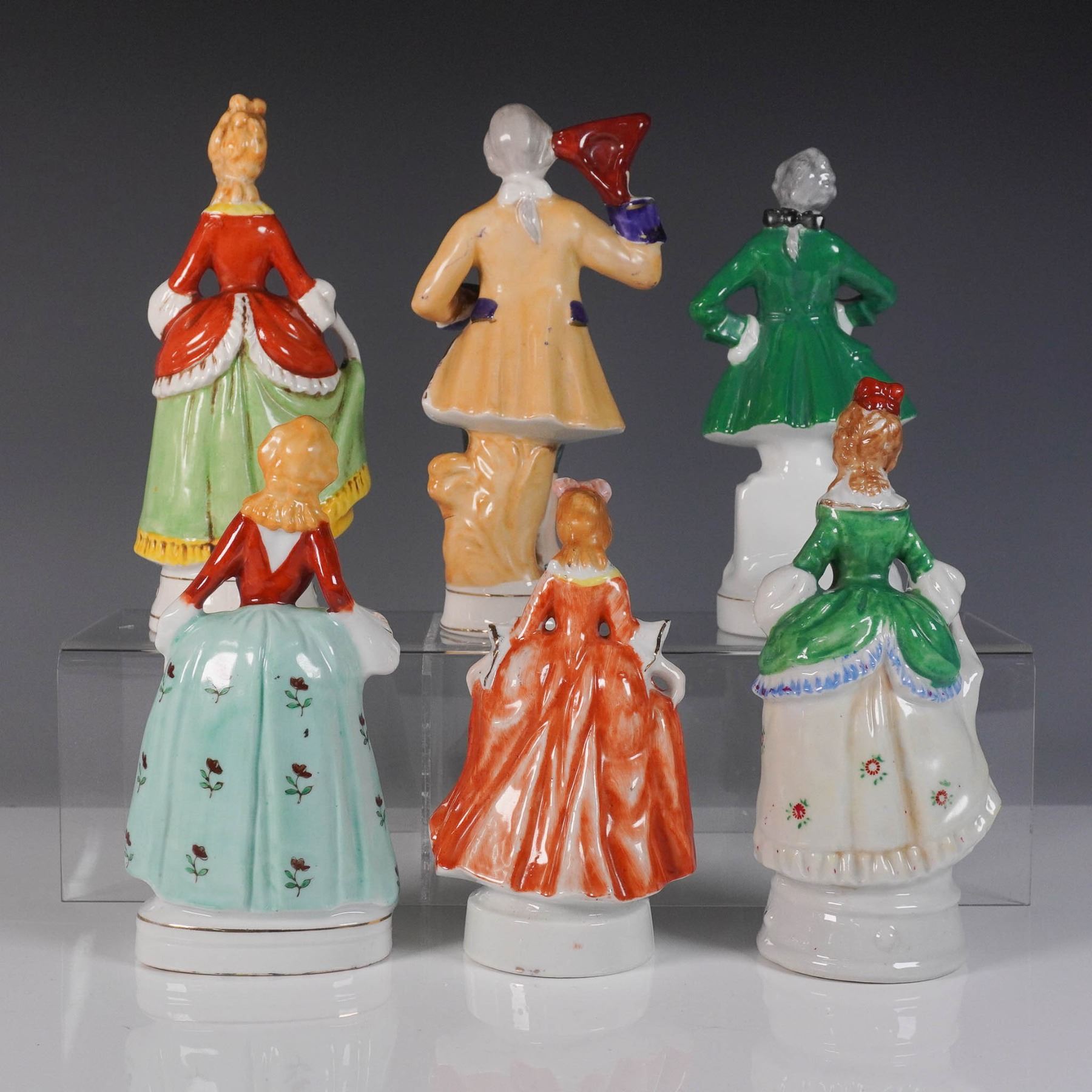 A charming set of six hand-painted porcelain figurines, each depicting 18th-century-style figures dressed in vibrant period attire. The group includes four women in flowing gowns with detailed floral and lace-like patterns, along with two male figures adorned in formal coats and breeches. These delicate porcelain pieces showcase fine craftsmanship with expressive faces, vivid colors, and intricate detailing, making them a wonderful addition to a vintage figurine collection. Marked Made In Occupied Japan. Largest measures 8"H.