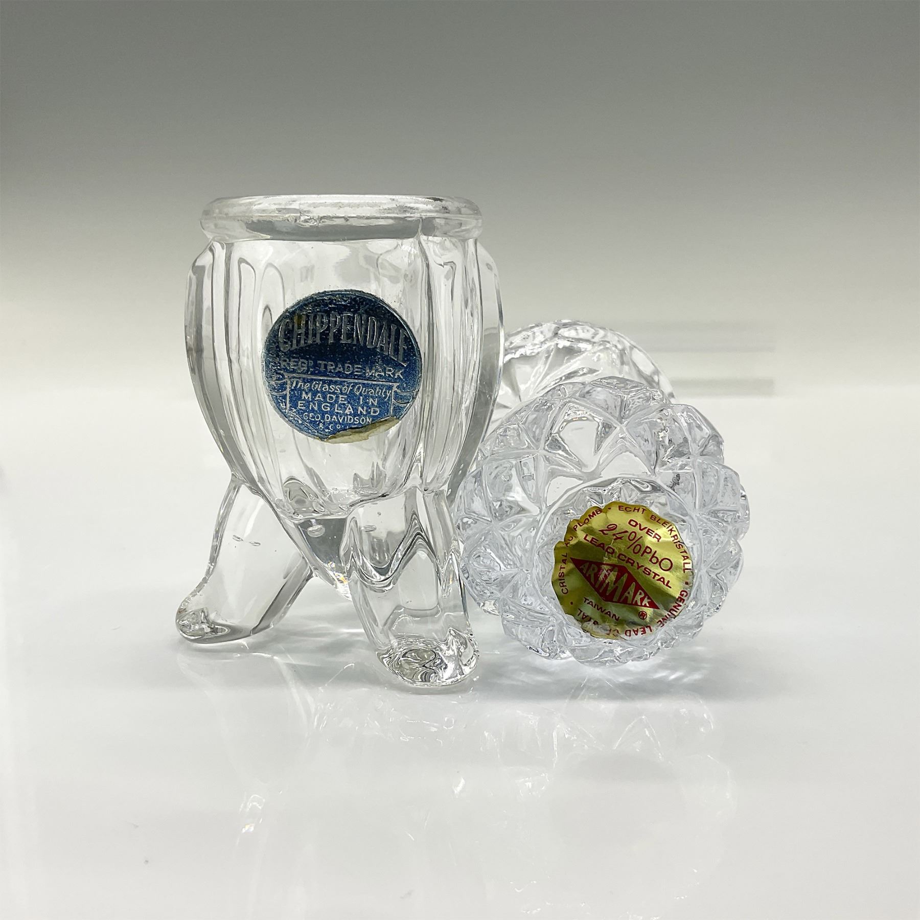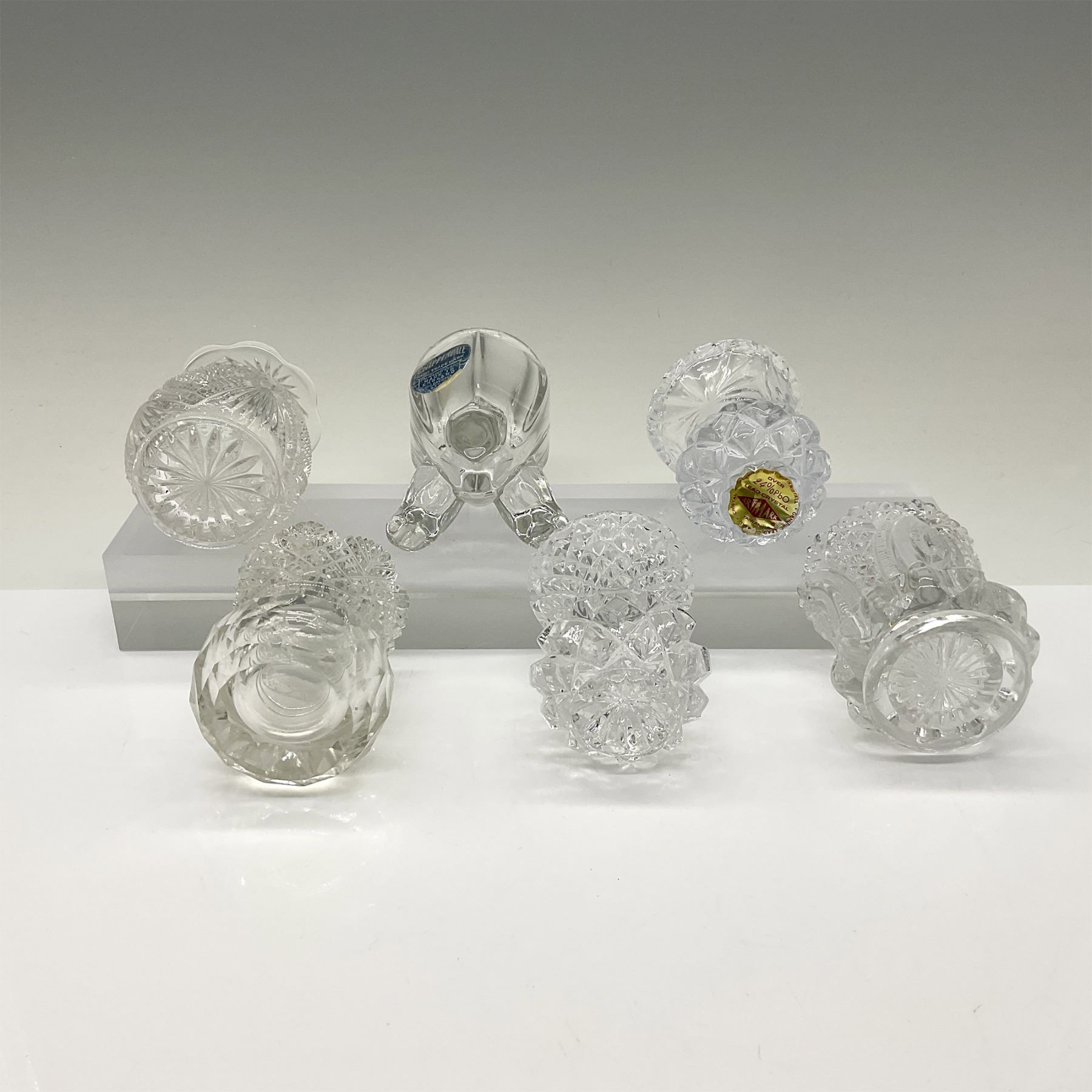 This grouping includes a footed Chippendale holder, a Jubilee holder from McKee & Bros., a crystal Artmark holder, and three additional holders featuring scalloped and sawtooth edges with beautiful patterns. The largest item measures 3"H x 2.25" in diameter.