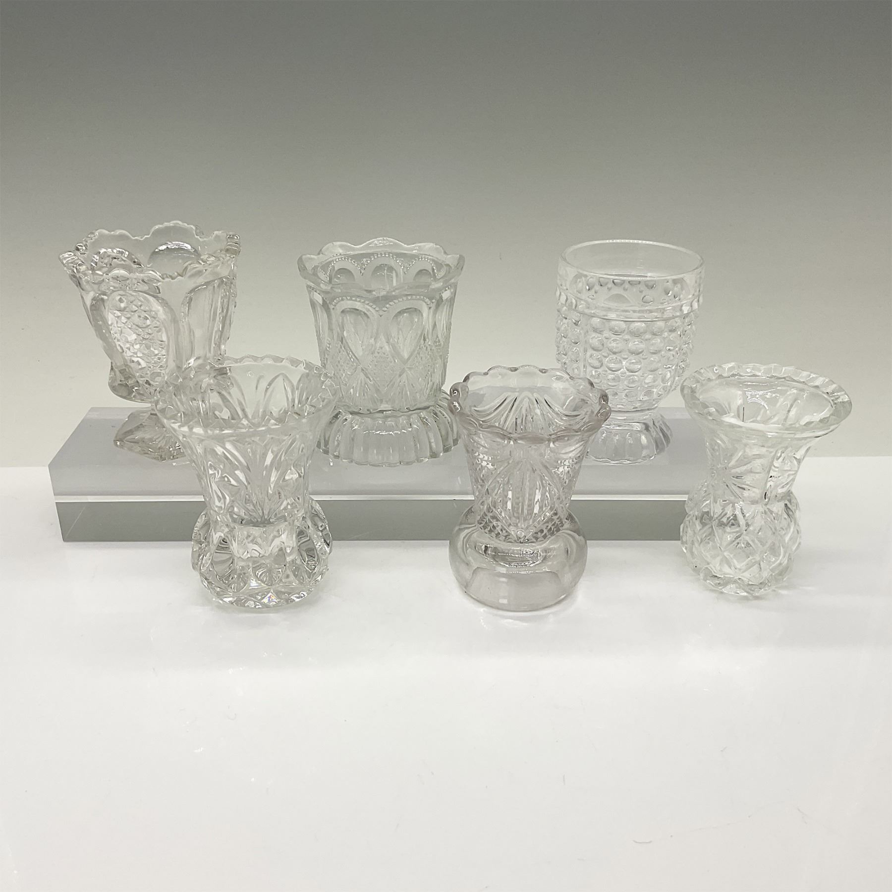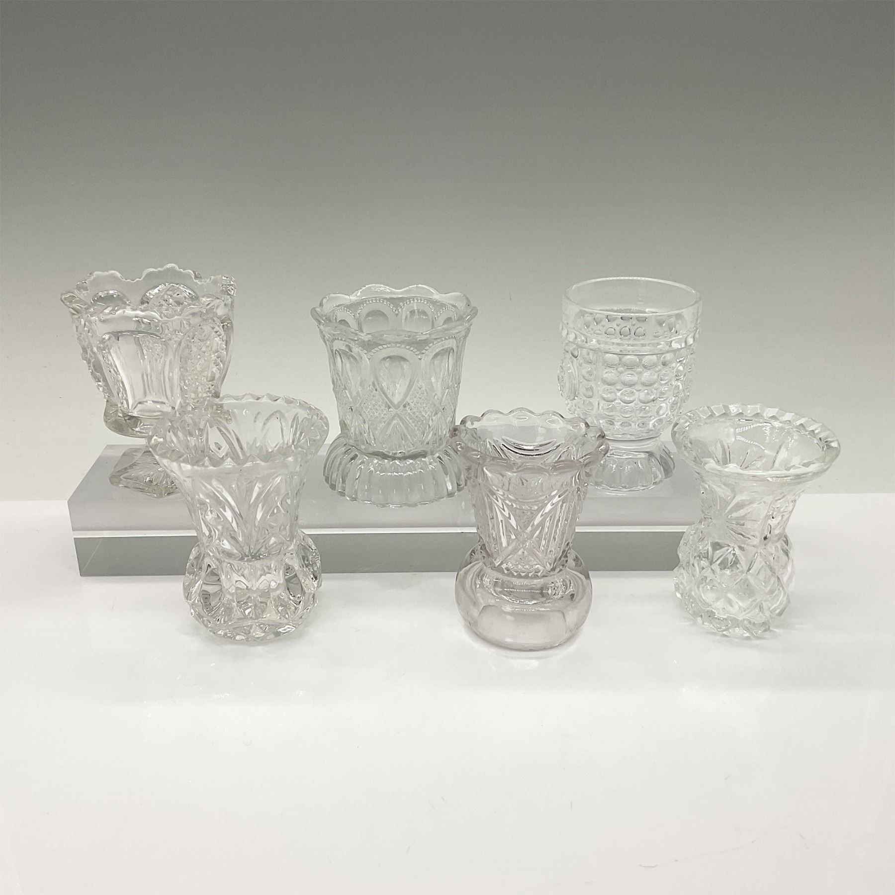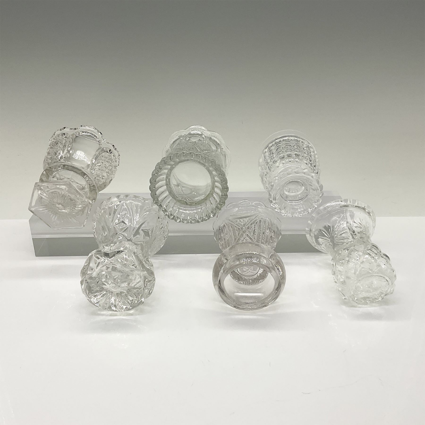 This collection of holders features mostly footed pieces, with one exception: a vase-shaped holder. All pieces are unmarked, with one resembling cut and polished crystal. The collection showcases intricate patterns, including buzz saws, dots, columns, cane, and crosshatching. The largest piece measures 3"H x 2.25" in diameter.