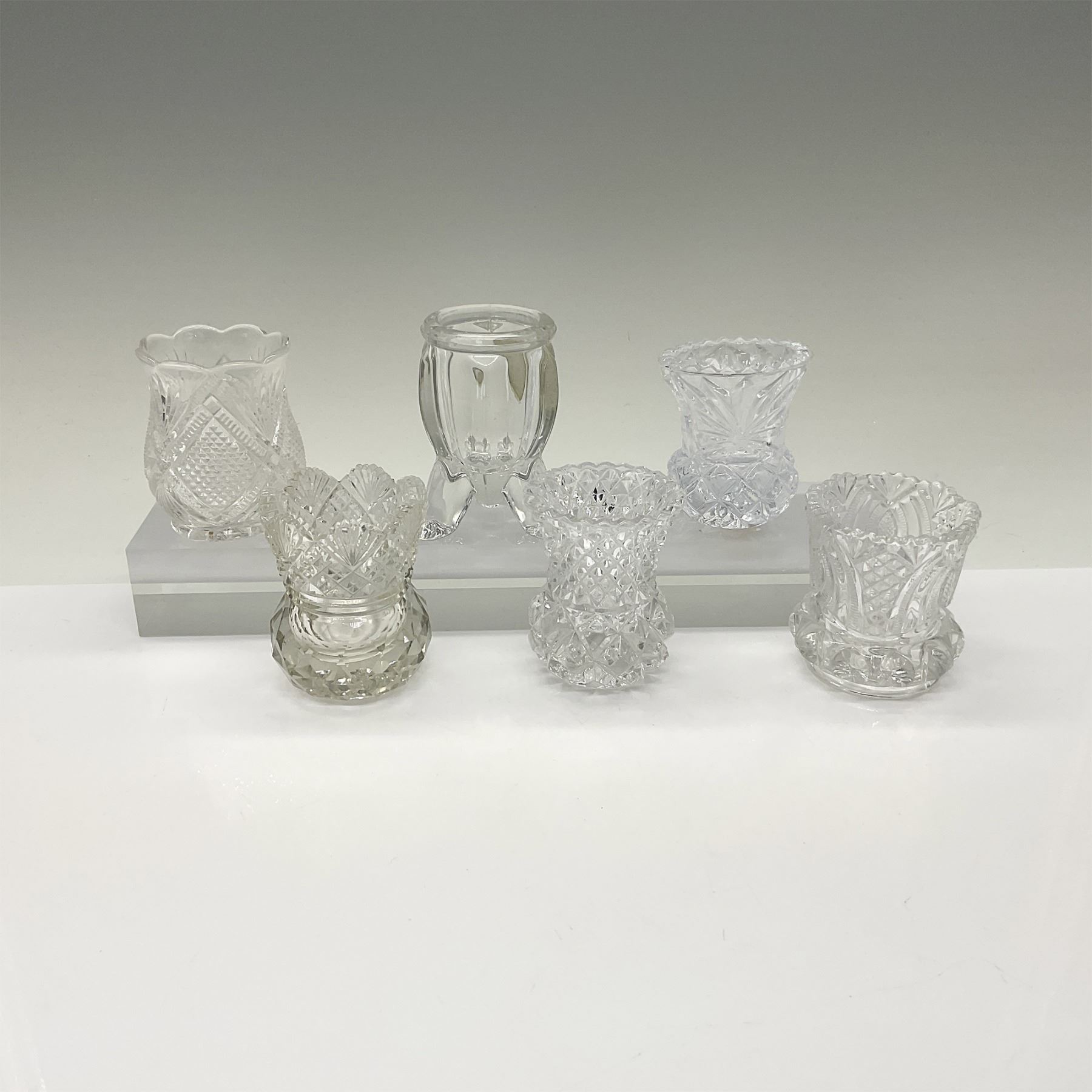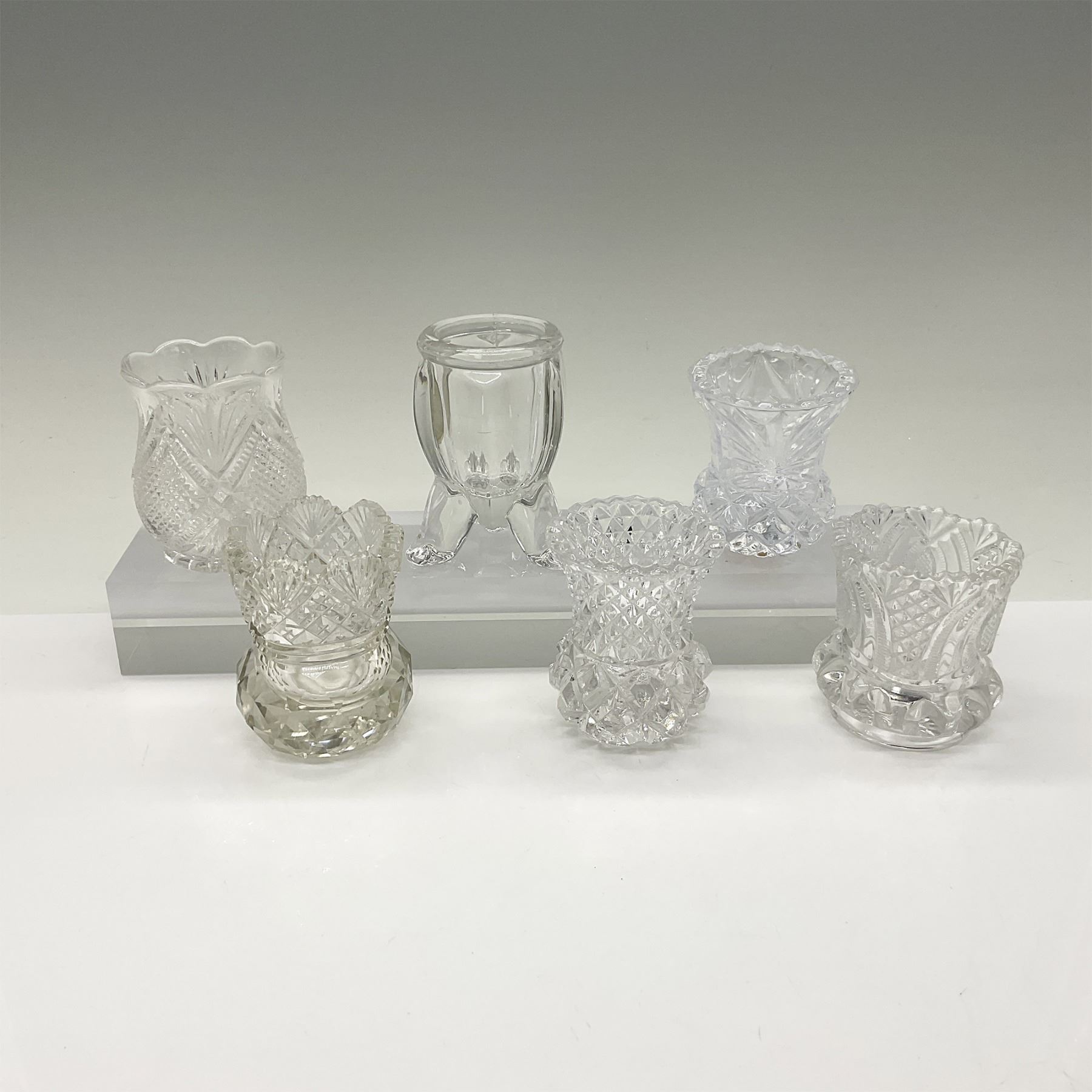This grouping includes a footed Chippendale holder, a Jubilee holder from McKee & Bros., a crystal Artmark holder, and three additional holders featuring scalloped and sawtooth edges with beautiful patterns. The largest item measures 3"H x 2.25" in diameter.