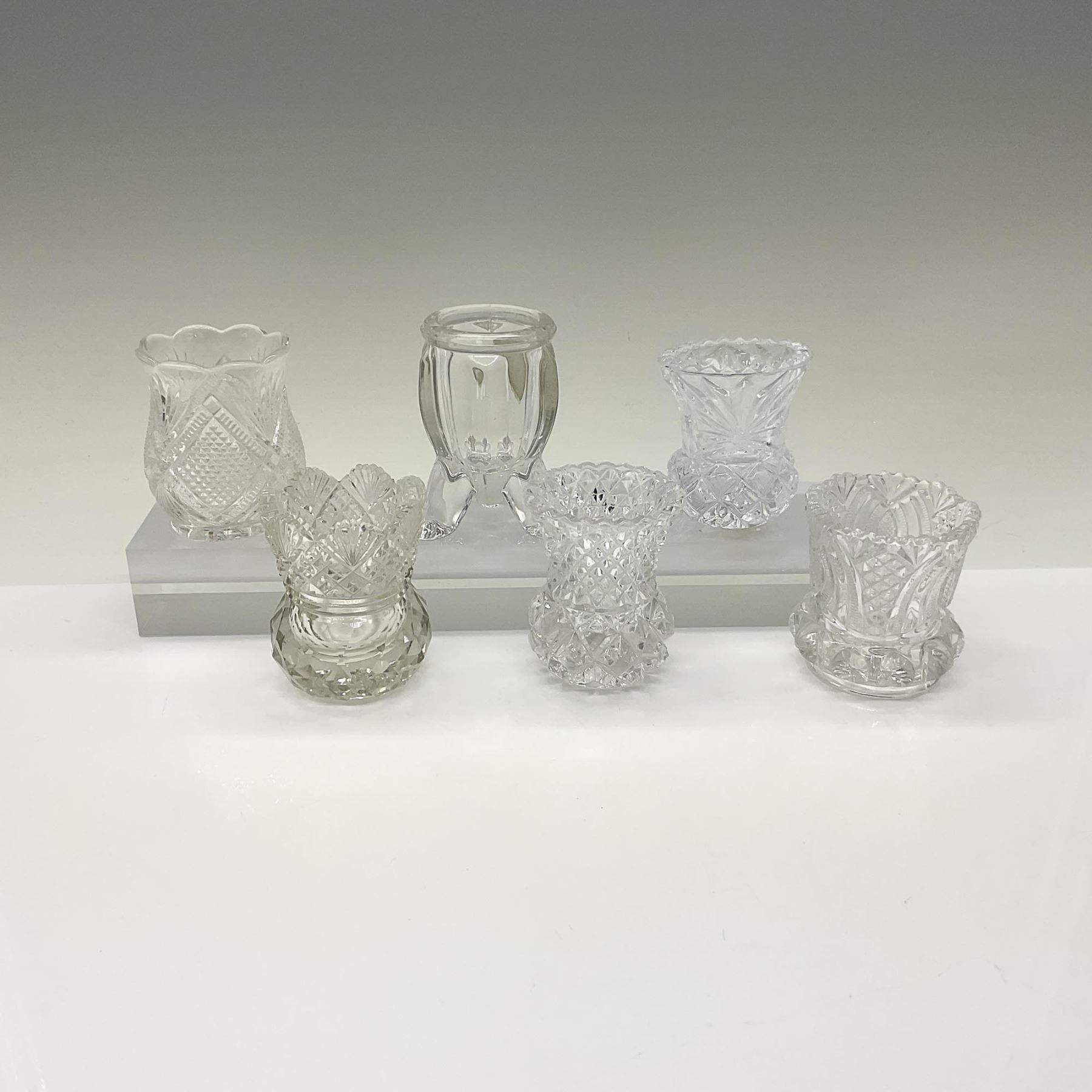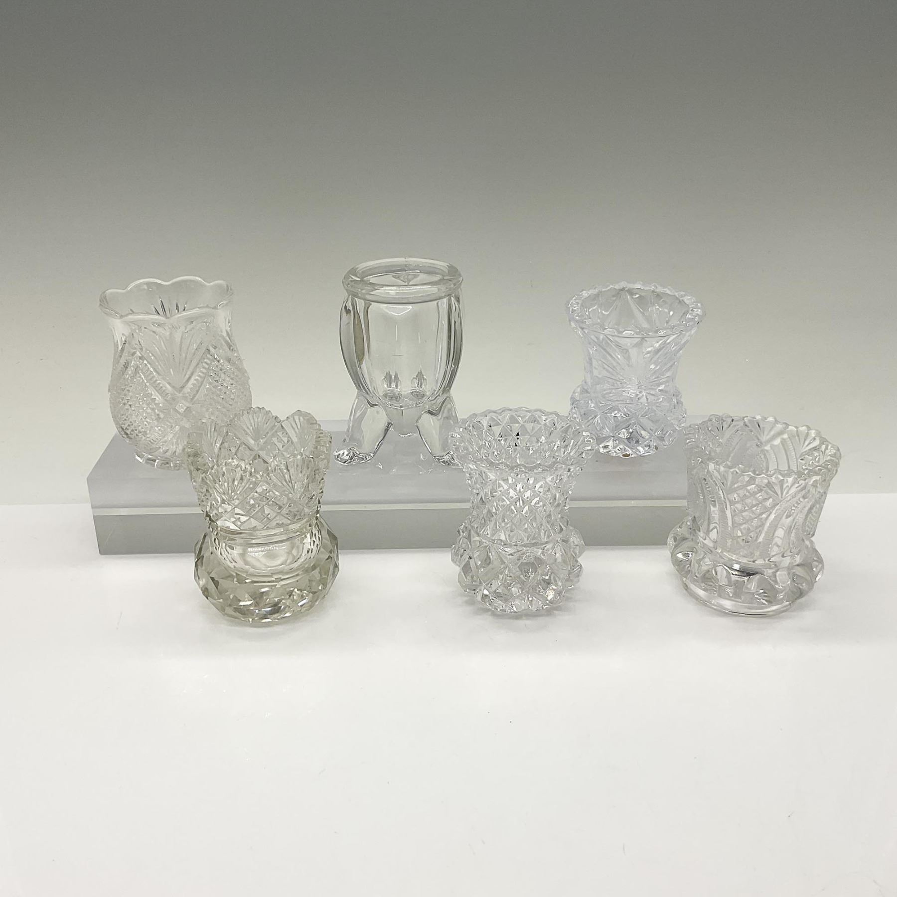 This grouping includes a footed Chippendale holder, a Jubilee holder from McKee & Bros., a crystal Artmark holder, and three additional holders featuring scalloped and sawtooth edges with beautiful patterns. The largest item measures 3"H x 2.25" in diameter.