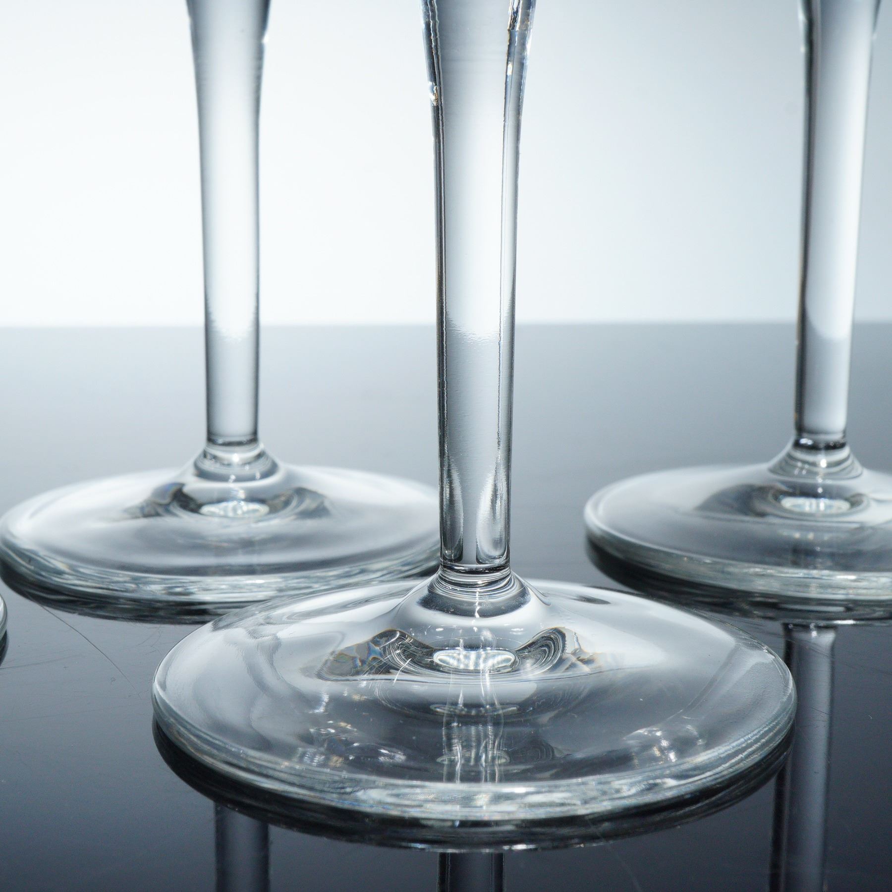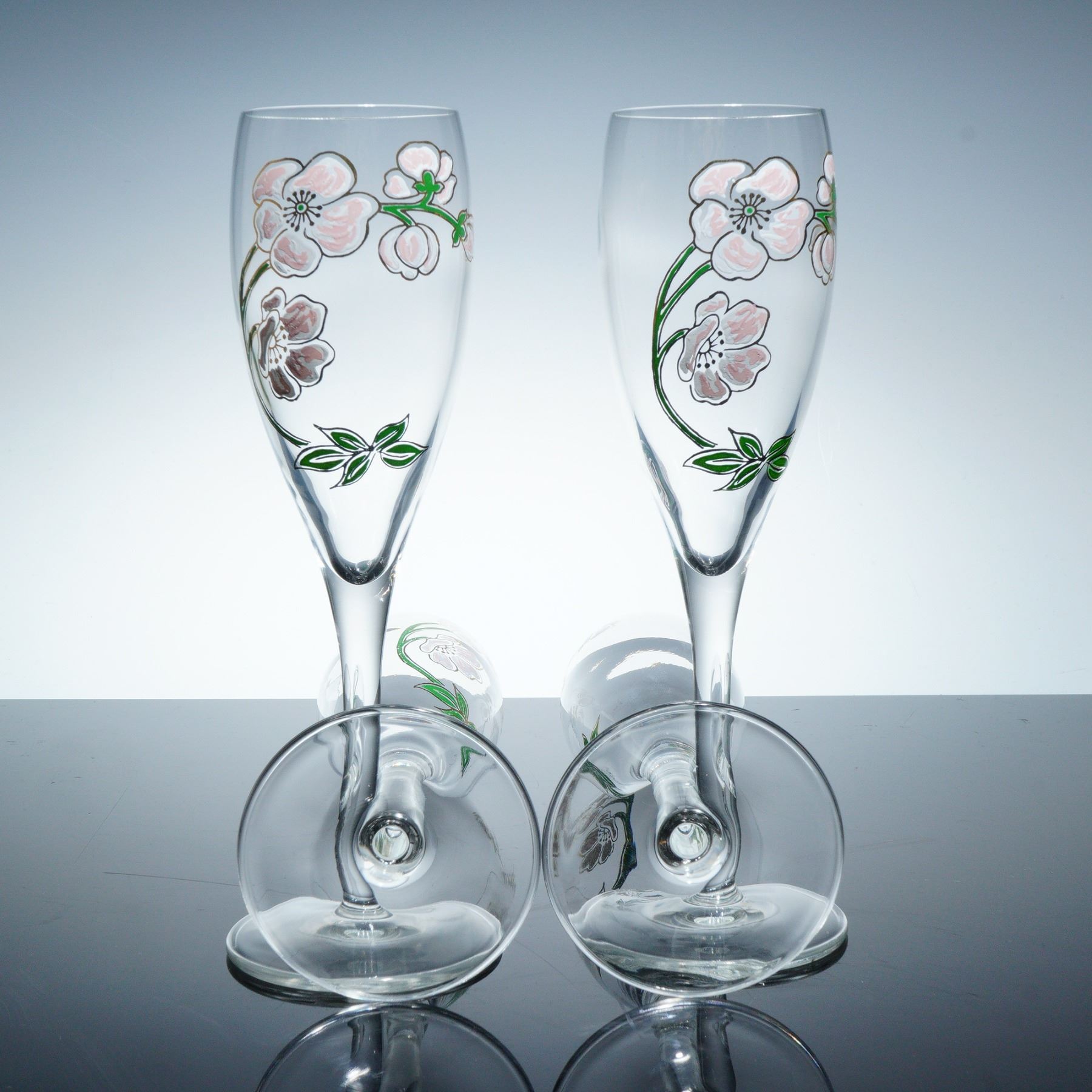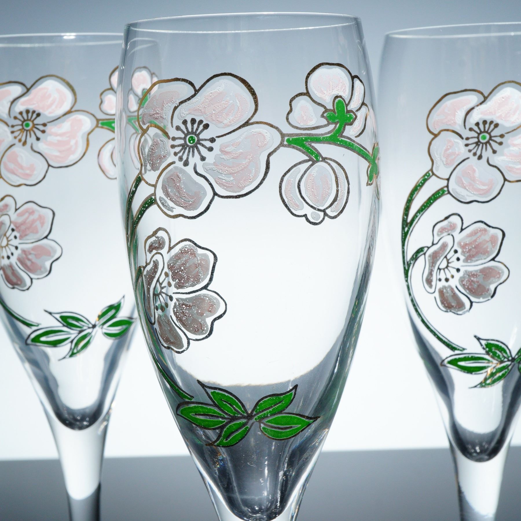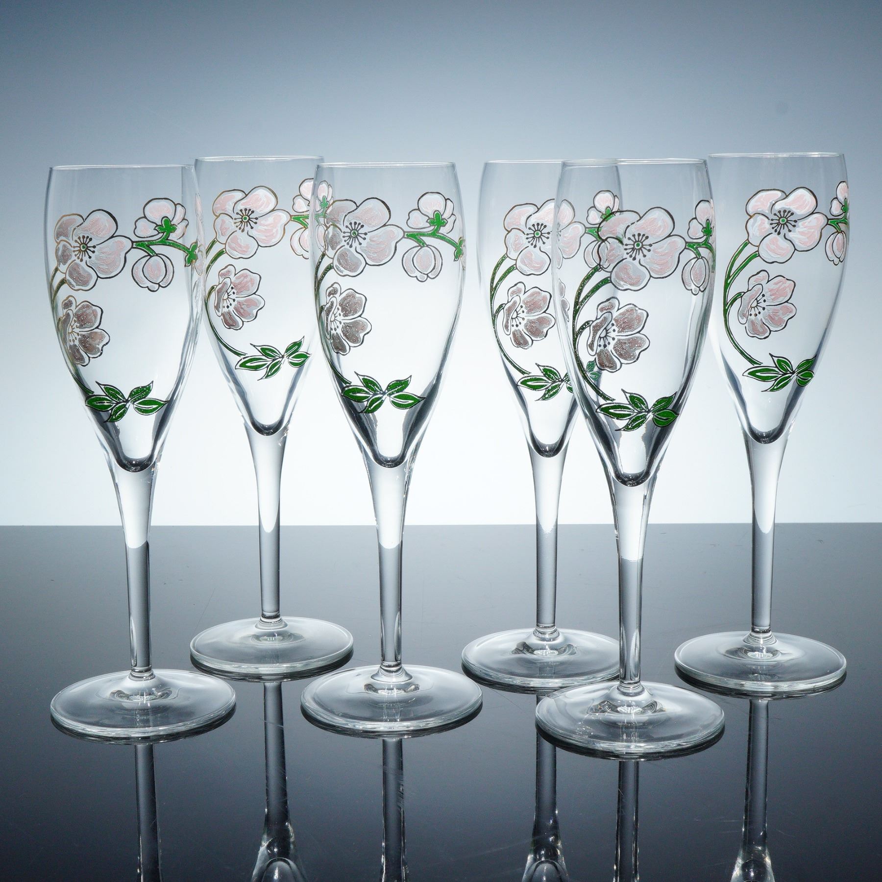 Six charming glasses with hand painted delicate soft pink blossoms accented by verdant green leaves and gilt detailing. The floral motifs encircle the upper bowls, and is finished with slender stems and rounded bases.