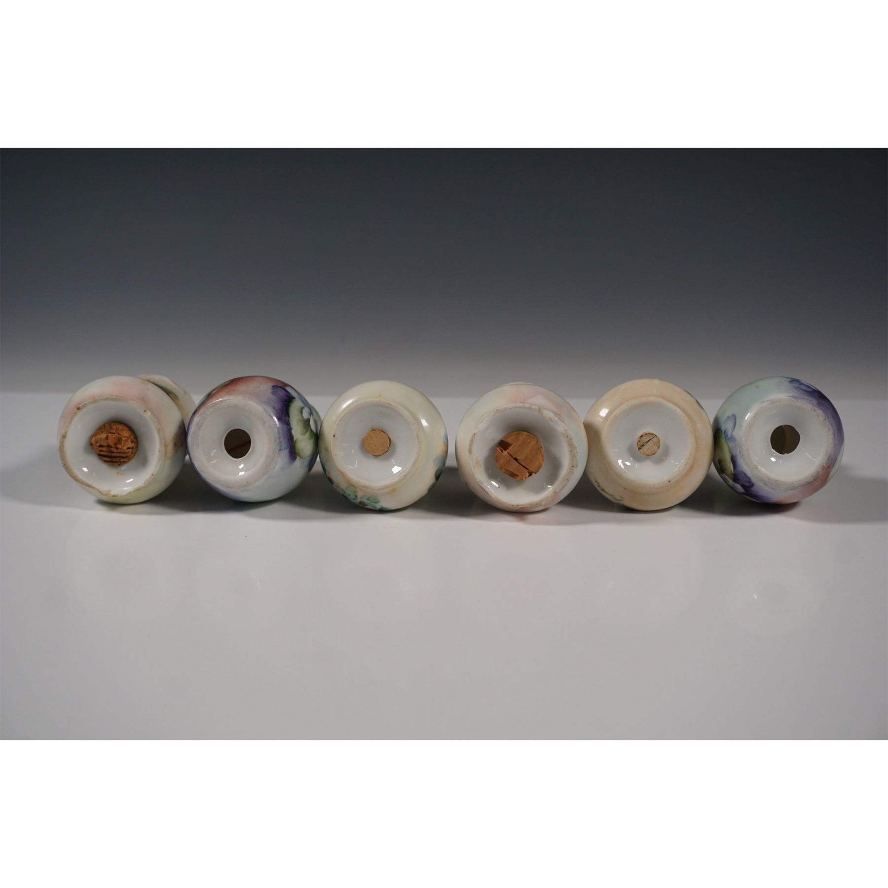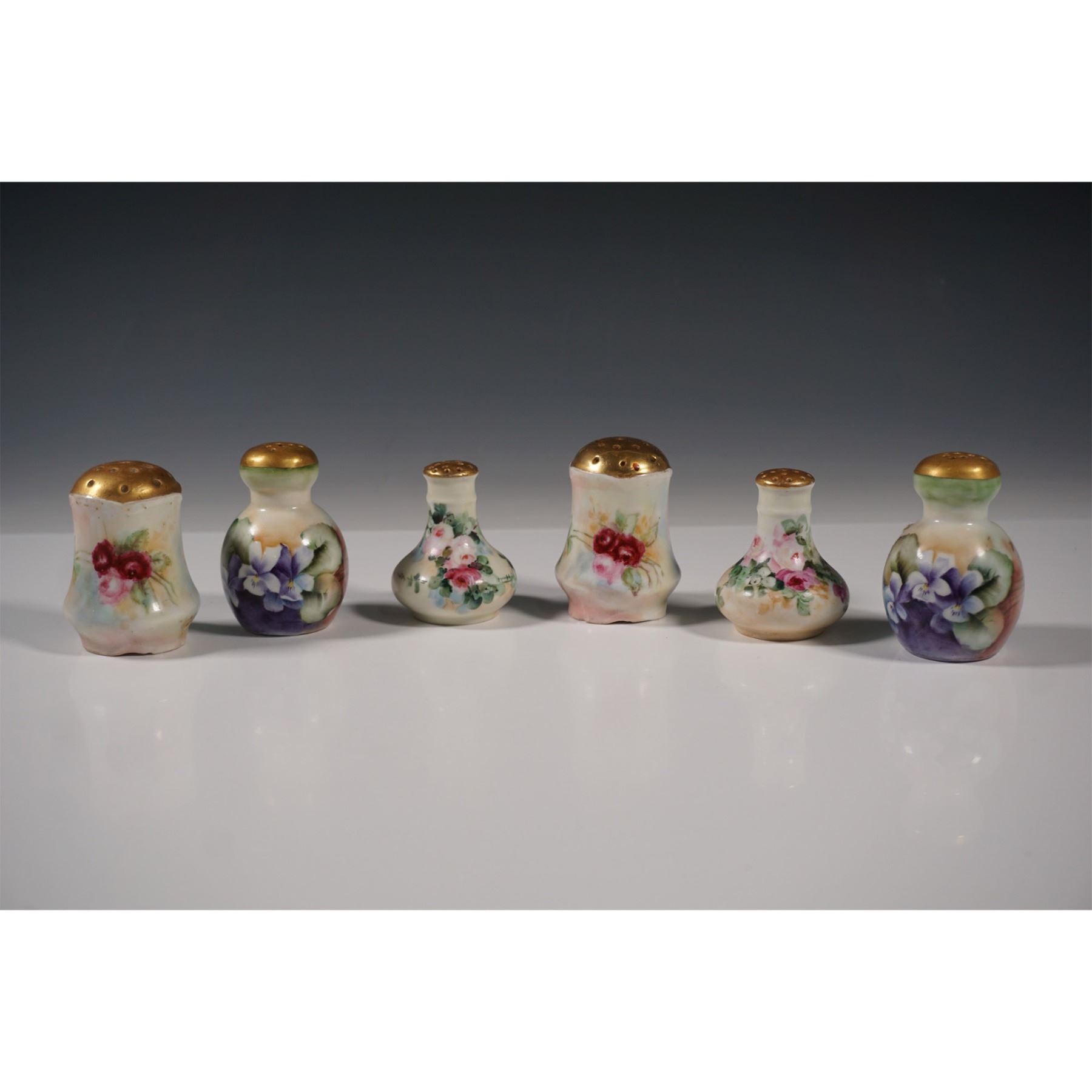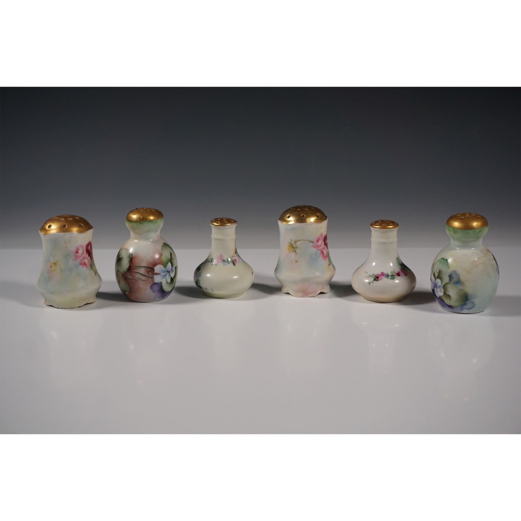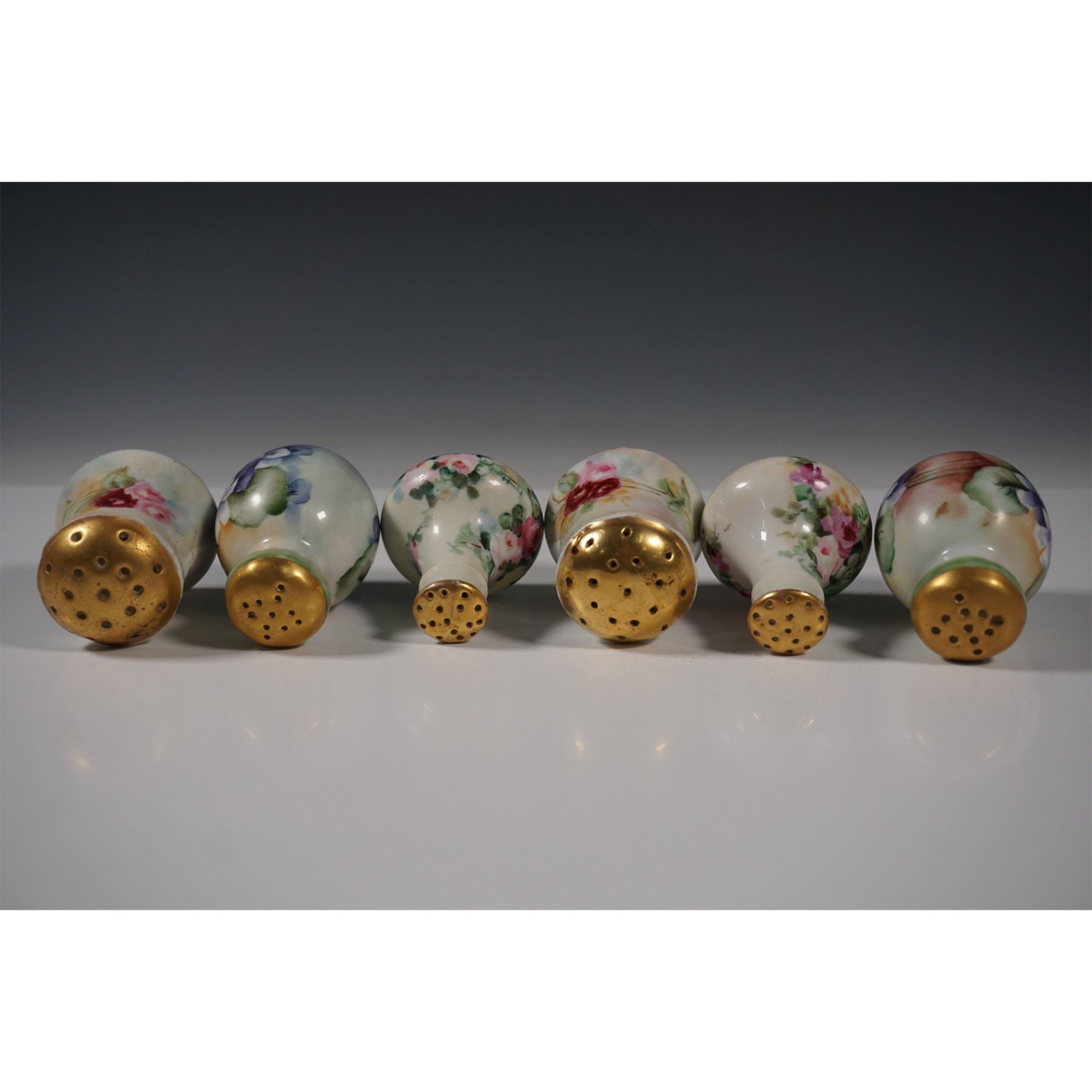 This charming set of six hand-painted porcelain salt and pepper shakers features delicate floral motifs, each with gilded metal tops. The shakers exhibit a variety of colorful flower designs, including violets, roses, and other florals, and are accented by soft pastel hues. The bases of the shakers have cork closures, ensuring their use as functional items. This set is a beautiful addition to any collection of vintage porcelain or decorative tableware.