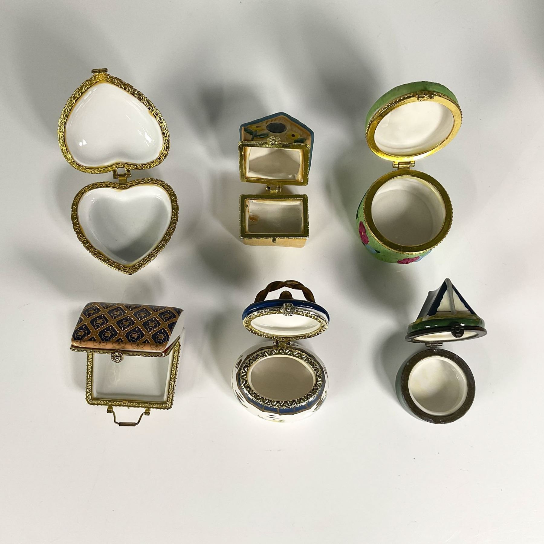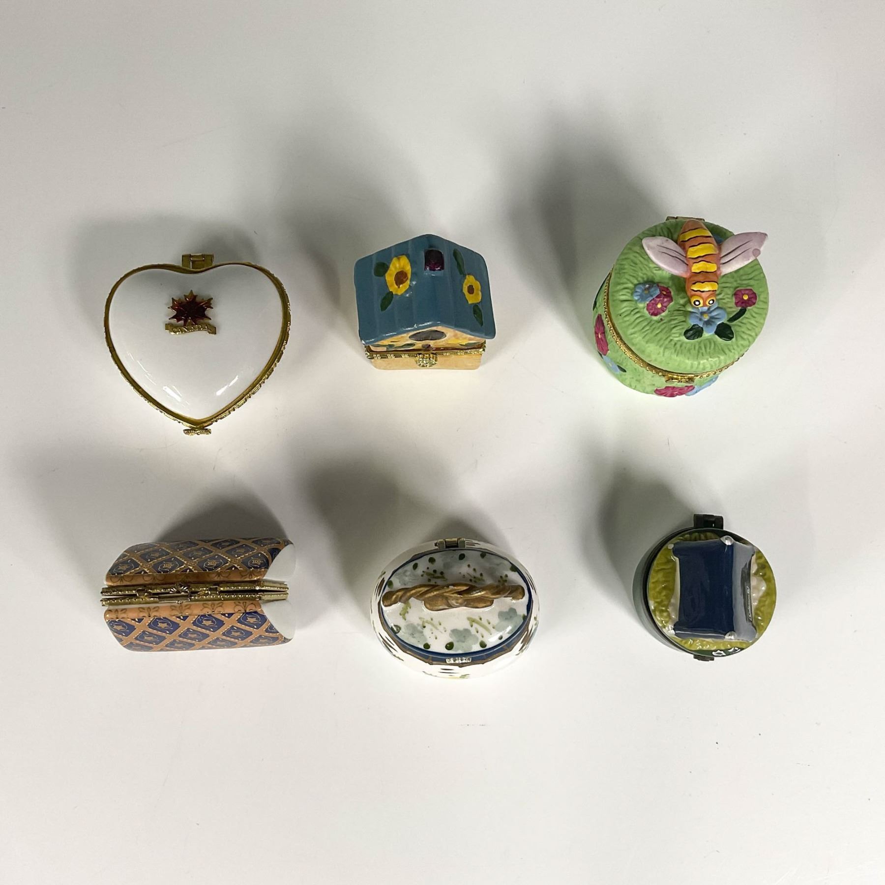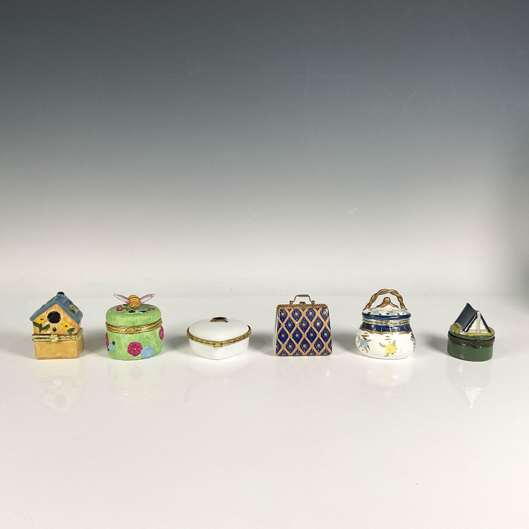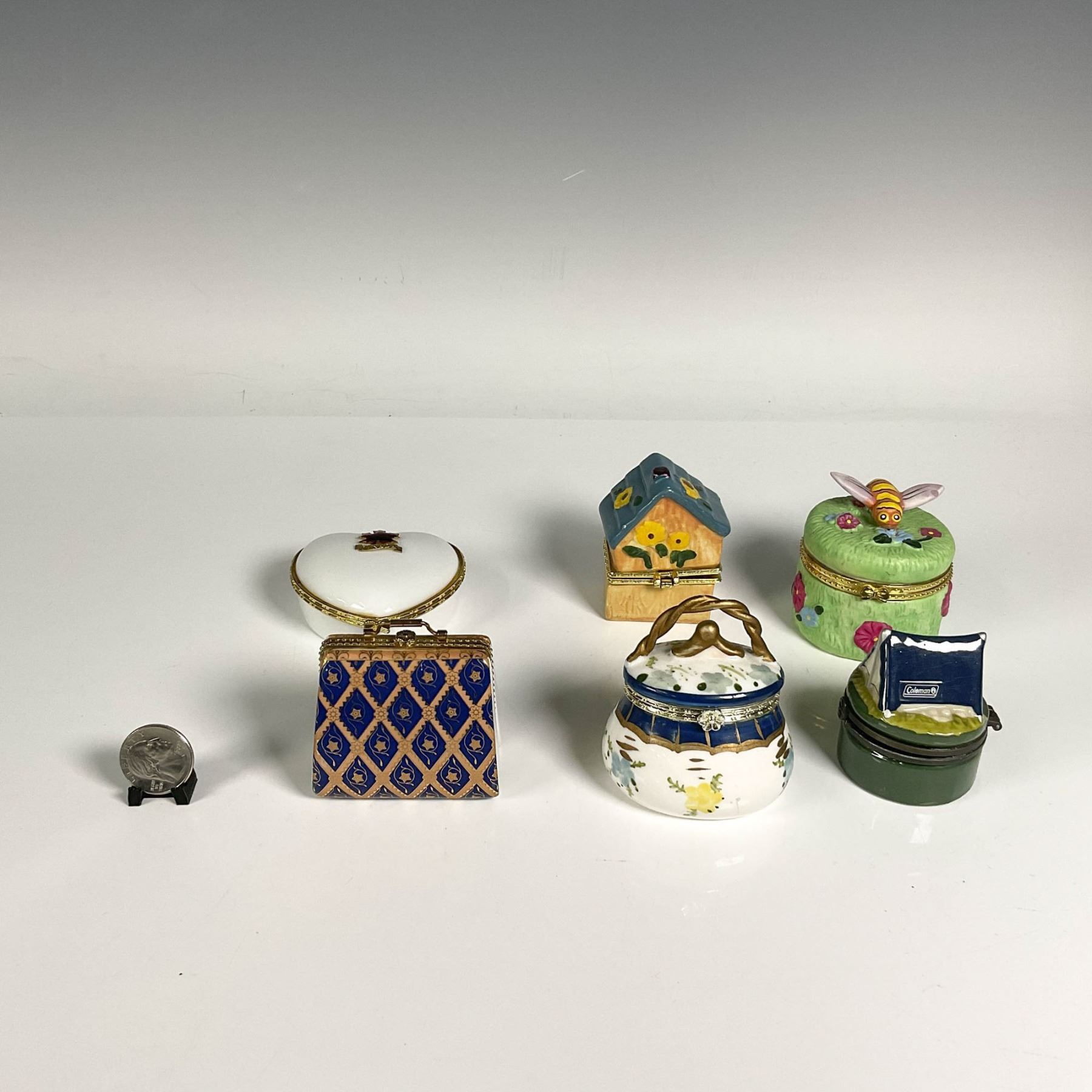 Various types of porcelain accessory boxes, including a hand painted house shaped box, hand painted grass box with a three dimensional bee, a heart shaped box with Canada and maple leaf accent on the lid, a handbag shaped gilt box, a basket shaped box, and a green round box with three dimensional tent. Coleman company sticker on the bottom of the tent treasure box. Largest box: 2.5"W x 2.5"H. Smallest box: 1.75"W x 2.25"H.