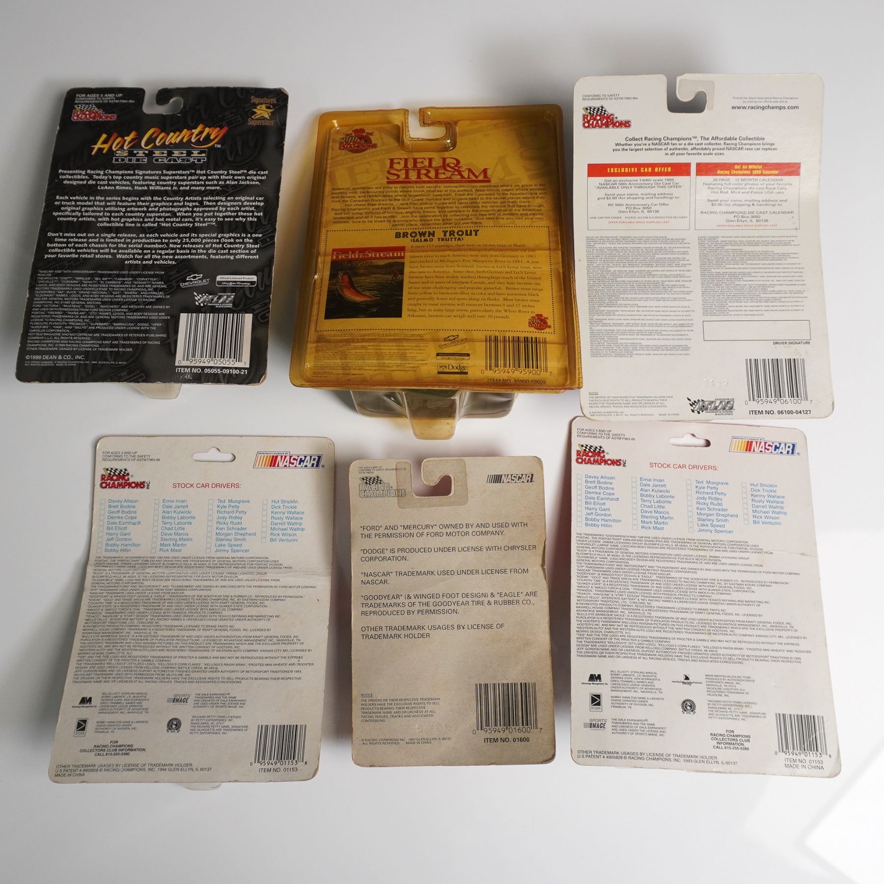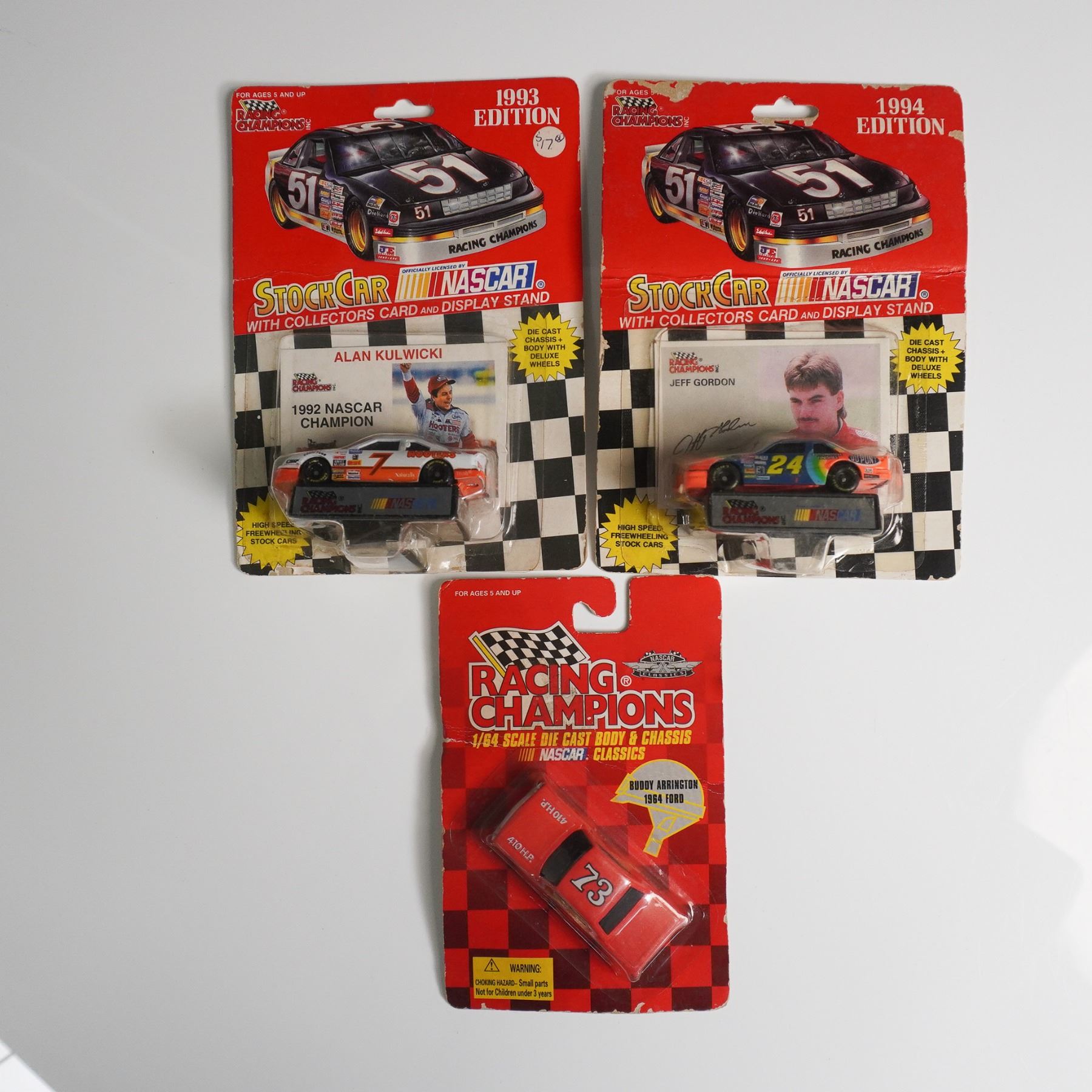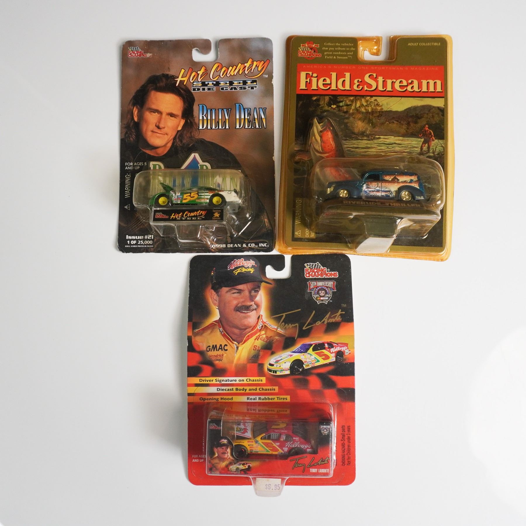 Collection of six Racing Champions die cast toy cars, each presented in its original packaging. Includes a Hot Country Series car featuring Billy Dean (Issue 21, 1 of 25,000), and a Riverside Thriller Field & Stream edition vehicle. The set also features a 1:64 scale Buddy Arrington 1964 Ford from the NASCAR Classics line. Additional NASCAR-themed models include a Terry Labonte car commemorating the NASCAR 50th Anniversary, a Jeff Gordon Stock Car from the 1994 Edition with display stand and collector card, and an Alan Kulwicki 1992 NASCAR Champion Stock Car from the 1993 Edition, also with collector card and stand. The largest item measures: 8"H.