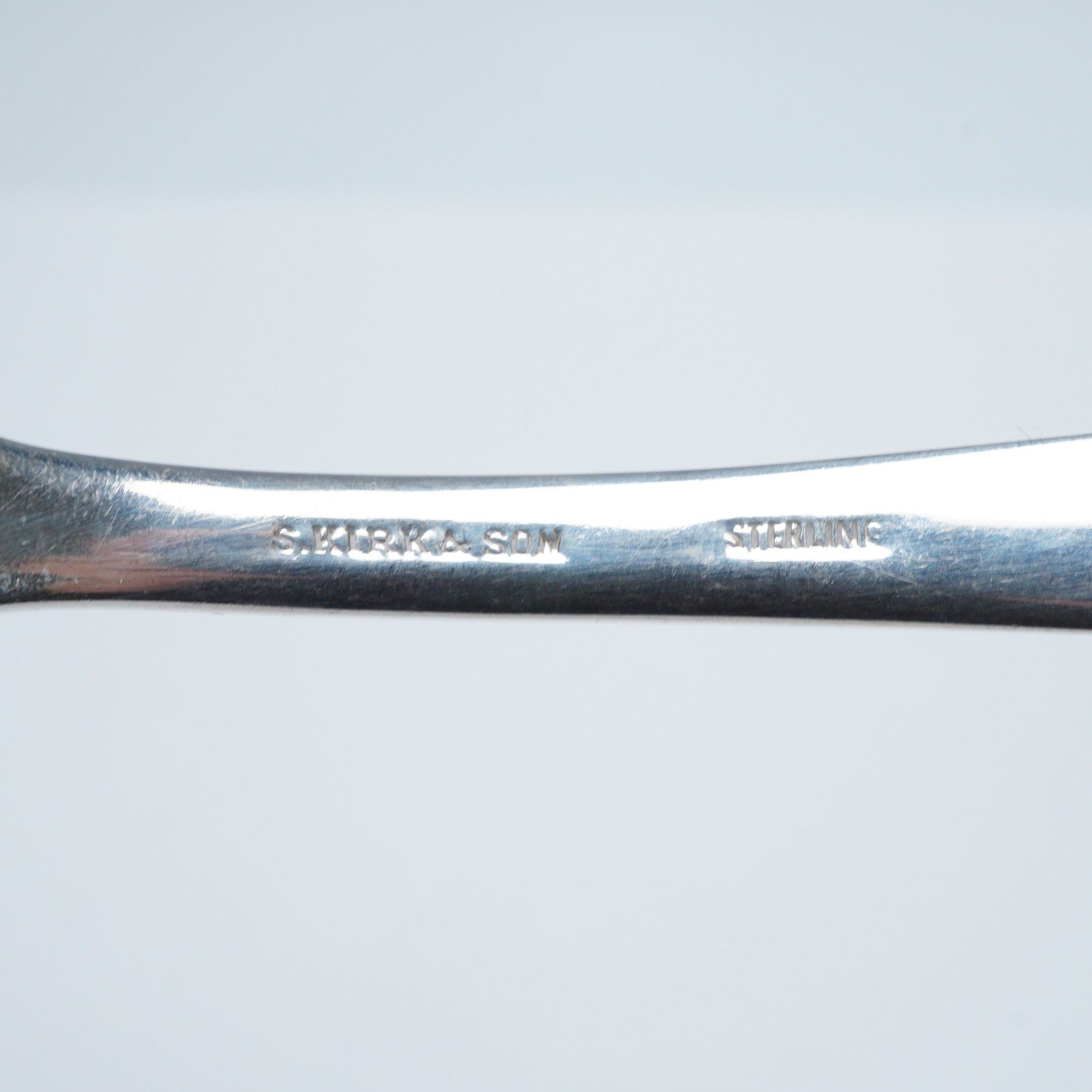 A six-piece sterling silver flatware distinguished by its richly detailed floral and foliate decoration. This collection includes 1 oval dessert spoon, 1 cream soup round bowl spoon, 1 teaspoon, 1 individual salad fork, 1 dinner fork, and 1 cocktail seafood fork. Hallmarked "Sterling". S. Kirk & Son backstamp. Total weight: 246 grams.