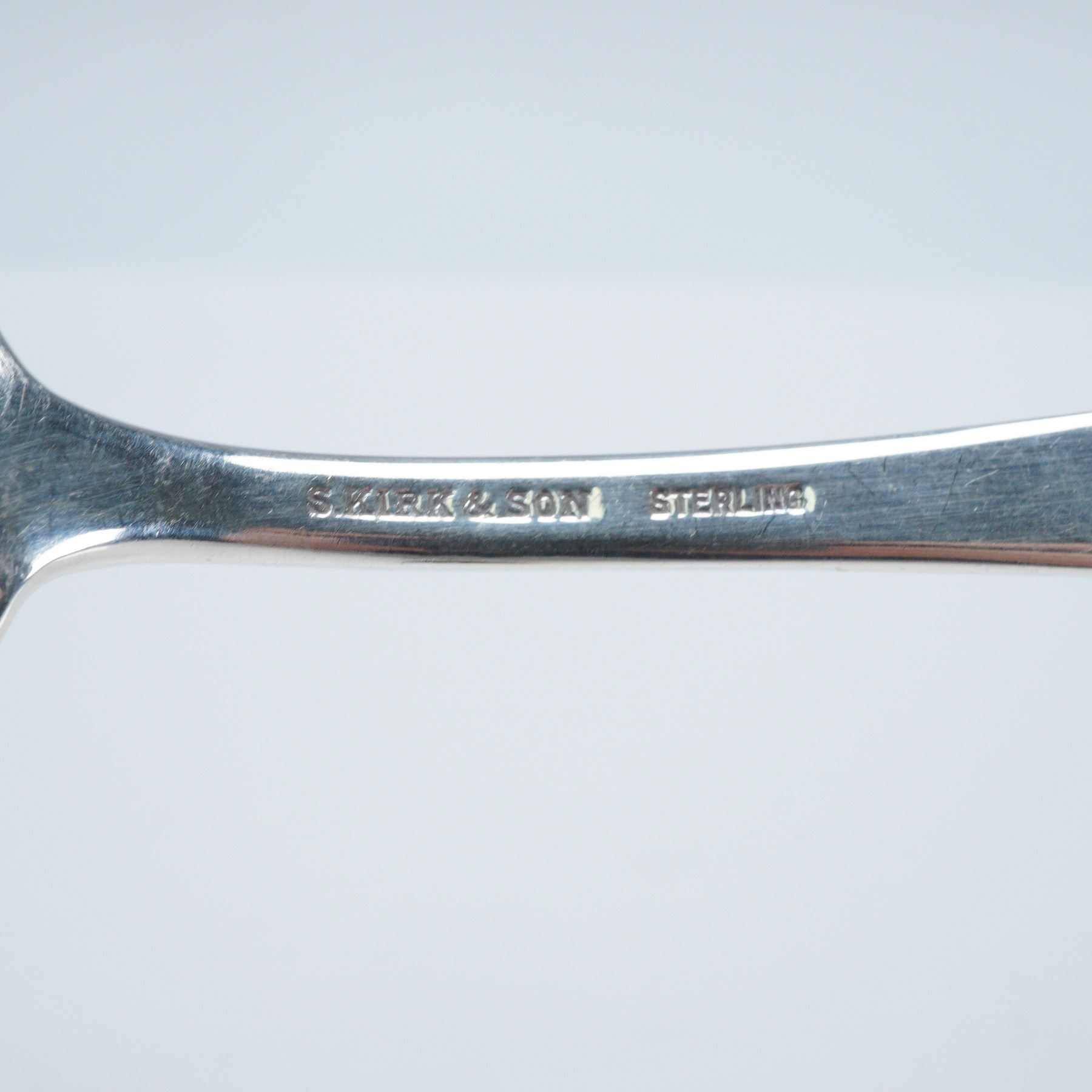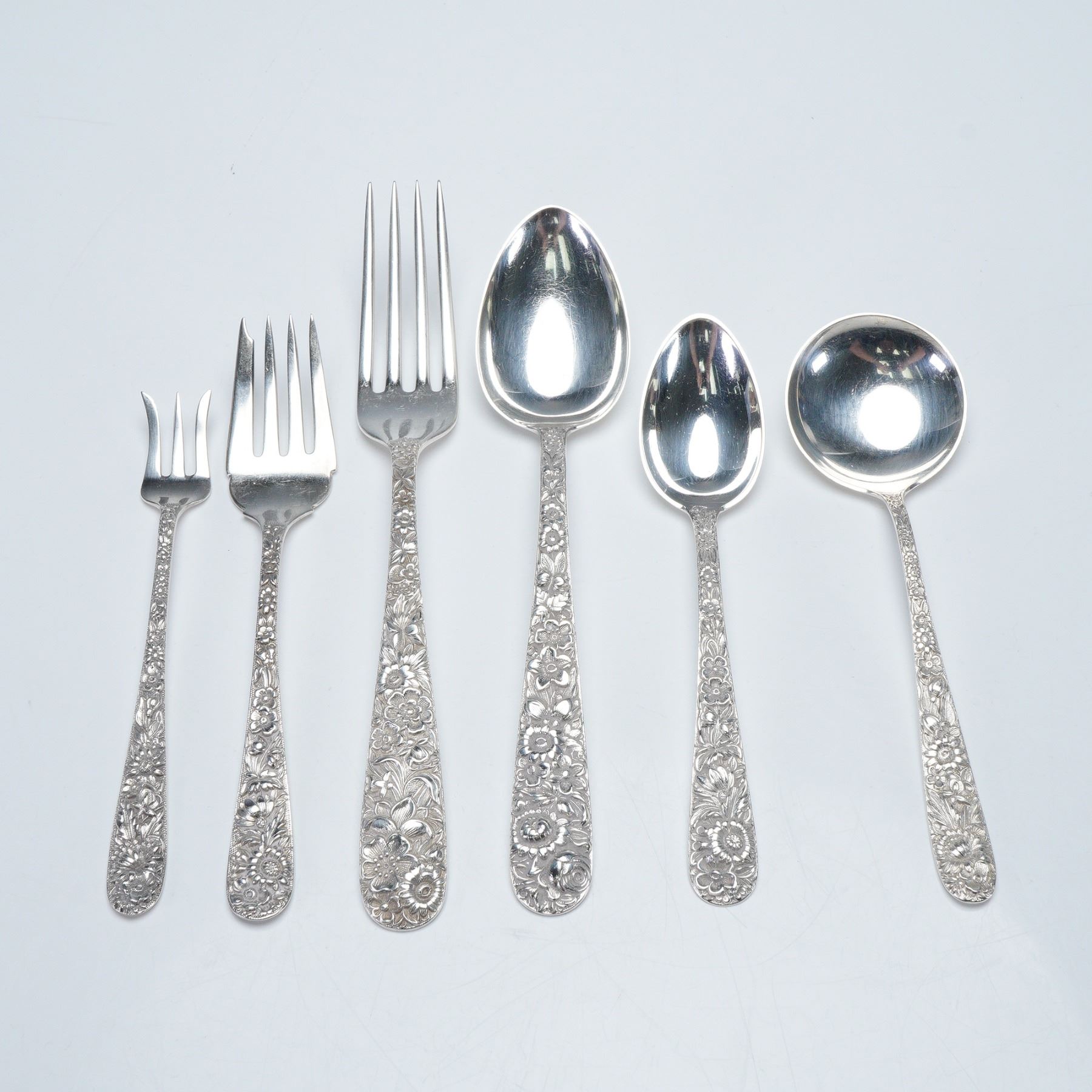 A finely crafted six-piece sterling silver flatware set, each handle adorned in the firm's celebrated repousse floral pattern exhibiting exceptional depth and precision. This set comprises 1 oval dessert spoon, 1 cream soup round bowl spoon, 1 teaspoon, 1 individual salad fork, 1 dinner fork, and 1 cocktail seafood fork. Hallmarked "Sterling". S. Kirk & Son backstamp. Total weight: 248 grams.
