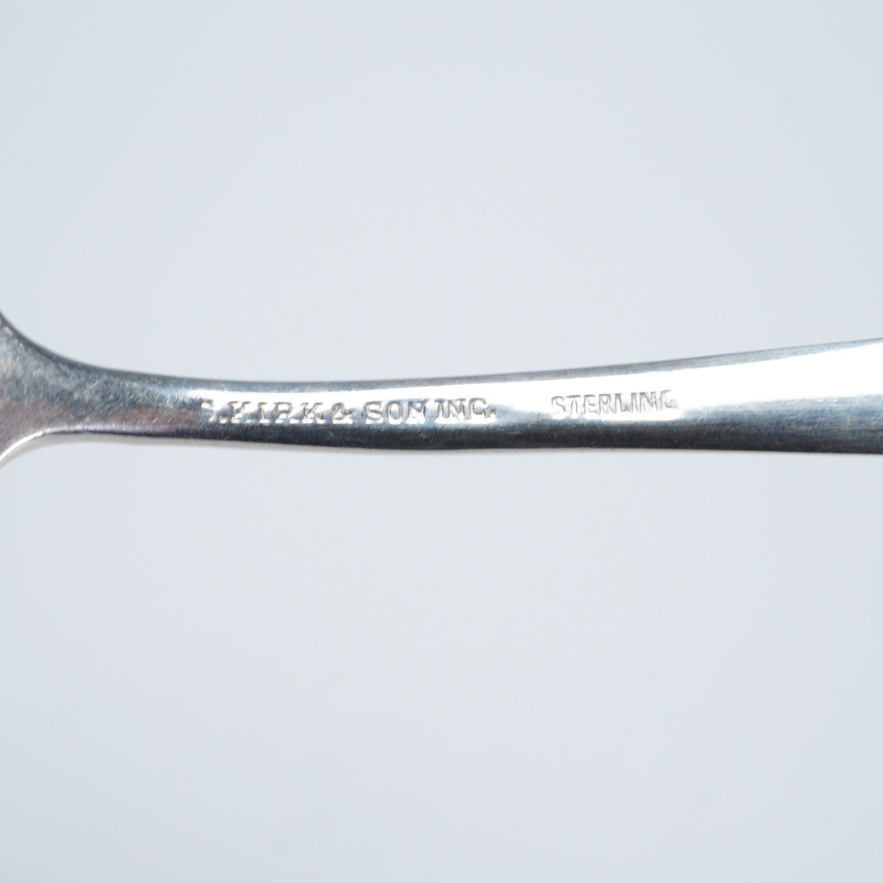 A six-piece sterling silver flatware set, each piece displaying floral pattern along the handles. This assembled grouping includes 1 oval dessert spoon, 1 cream soup round bowl spoon, 1 teaspoon, 1 individual salad fork, 1 dinner fork, and 1 cocktail seafood fork. Hallmarked "Sterling". S. Kirk & Son backstamp. Total weight: 246 grams.
