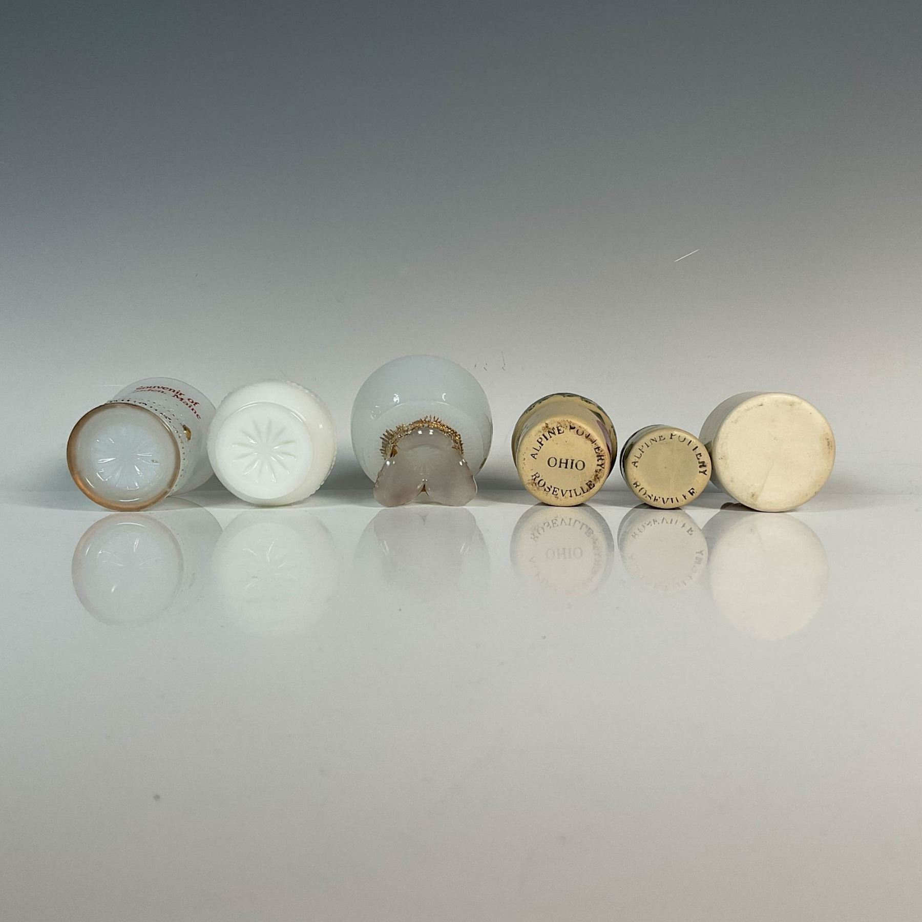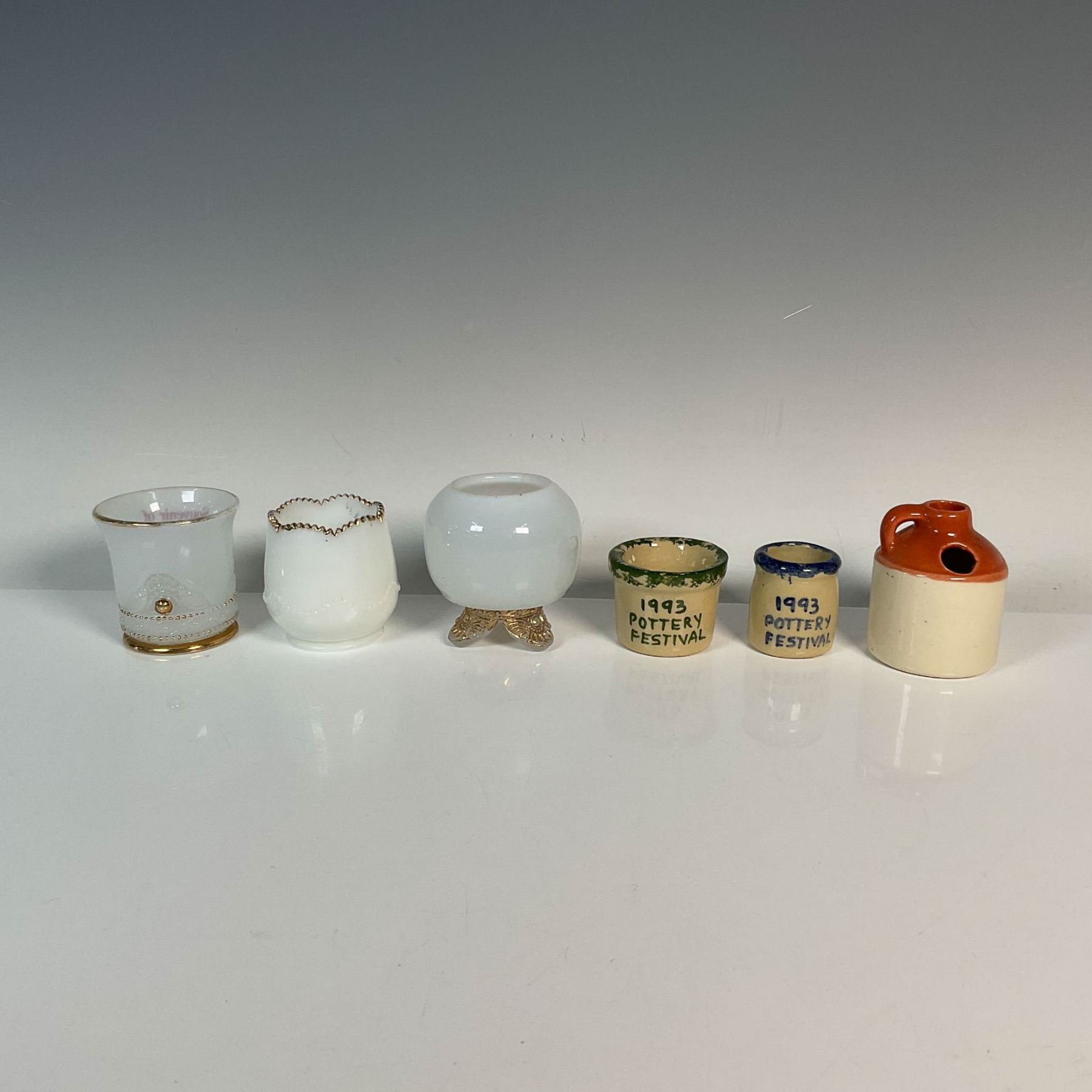 This unique set includes six souvenir toothpick holders with one from Williams Bros, one from Lake Mills, Wisconsin, one from Camden, Maine, a whiskey jug holder from Home Mountain Jug in Georgia, and two from the 1993 pottery festival featuring painted fruit designs in their centers. 1993 Potter Festival Holders marked Roseville. Dimensions of the largest item: 2.5"H x 2.5" dia.