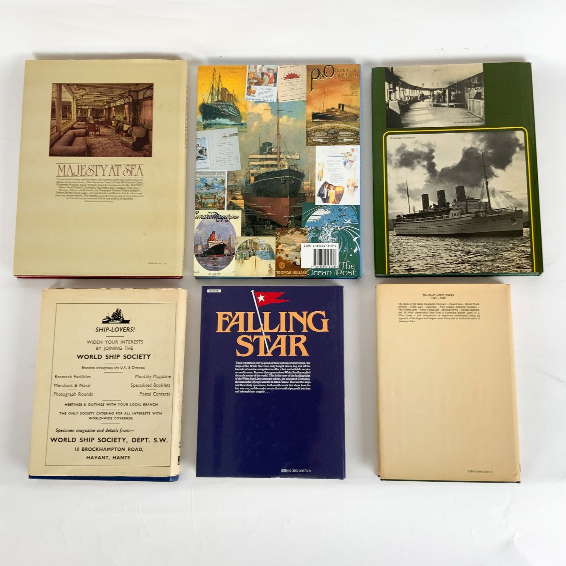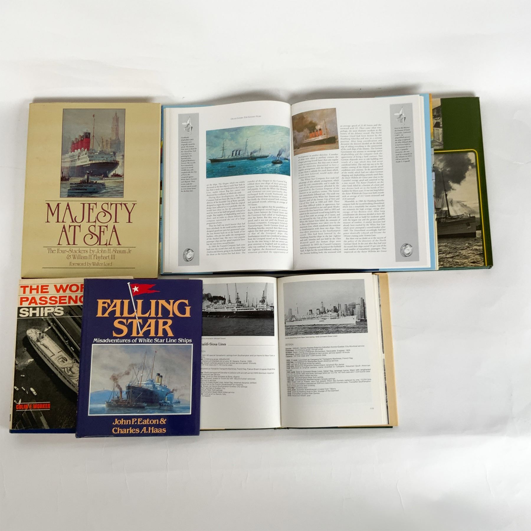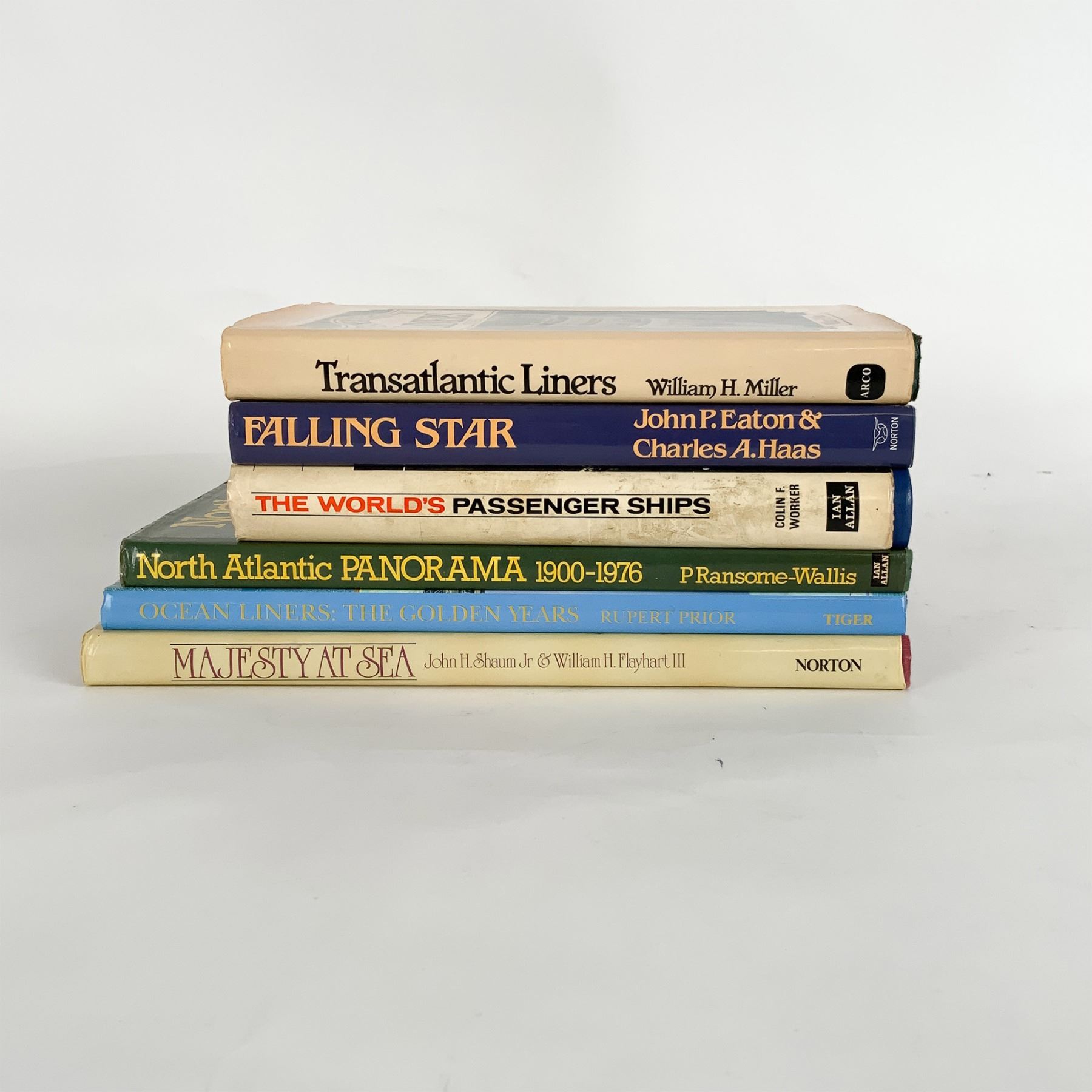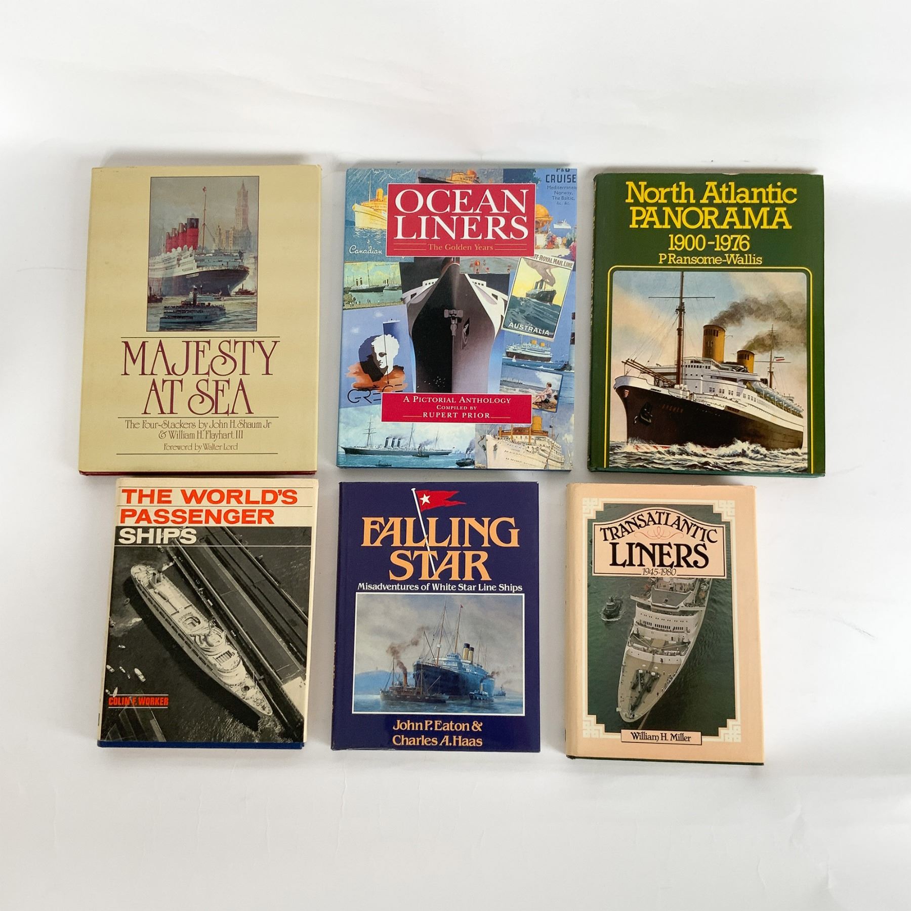A curated collection of six hardcover books detailing the history and grandeur of transatlantic ocean liners, passenger ships, and maritime travel. This set includes Transatlantic Liners by William H. Miller, Falling Star by John P. Eaton & Charles A. Haas, The World's Passenger Ships by Colin F. Workner, North Atlantic Panorama 1900-1976 by P. Ransome-Wallis, Ocean Liners: The Golden Years by Rupert Prior, and Majesty at Sea by John H. Shaum Jr. & William H. Flayhart III. Each book offers extensive photographs, historical details, and expert insights into some of the most iconic ships in history, capturing the elegance and engineering of ocean liners during their golden era. Ideal for collectors, maritime enthusiasts, and those with an appreciation for luxury ocean travel, these books provide a wealth of information on the design, construction, and voyages of legendary passenger ships. Largest book measures 12.25"H.