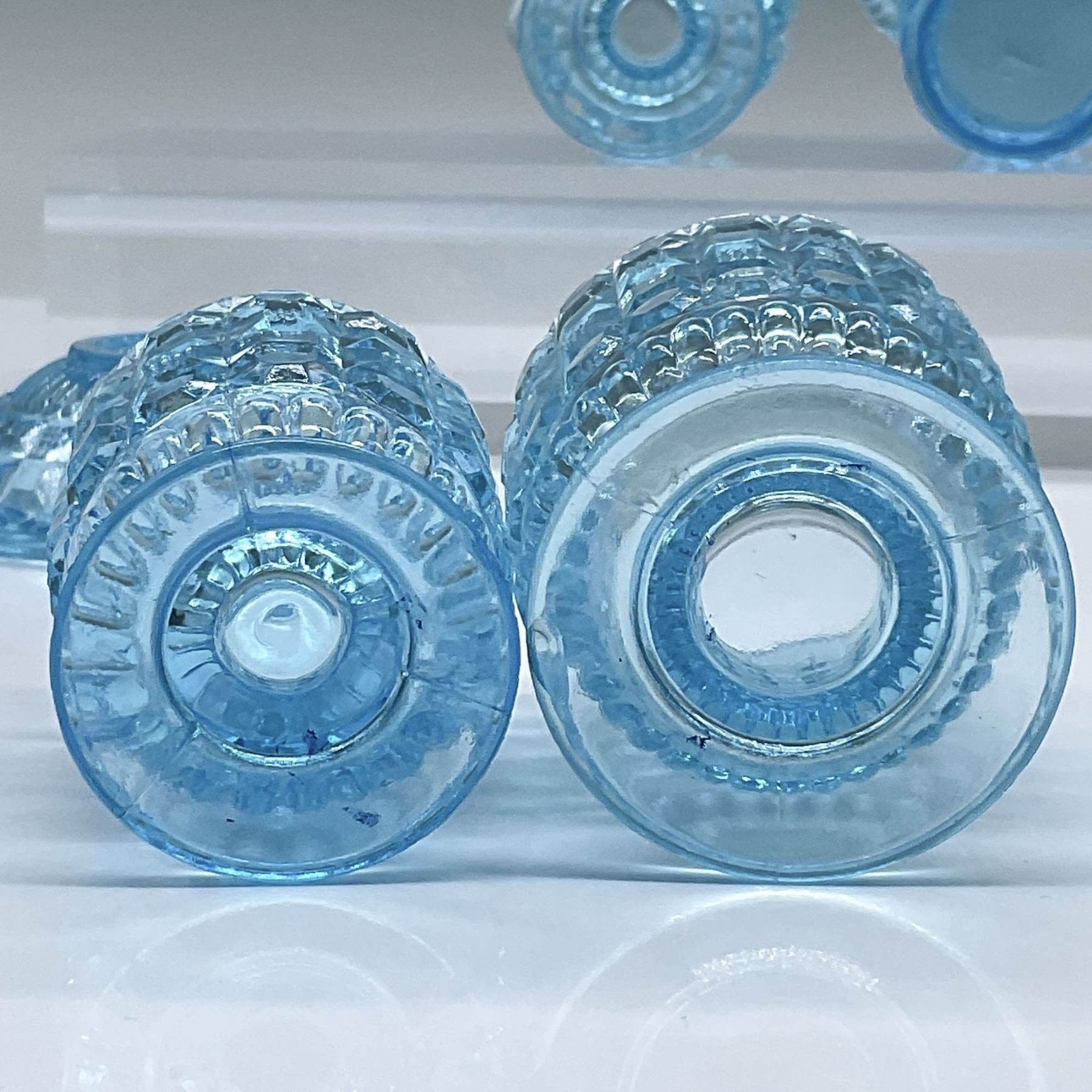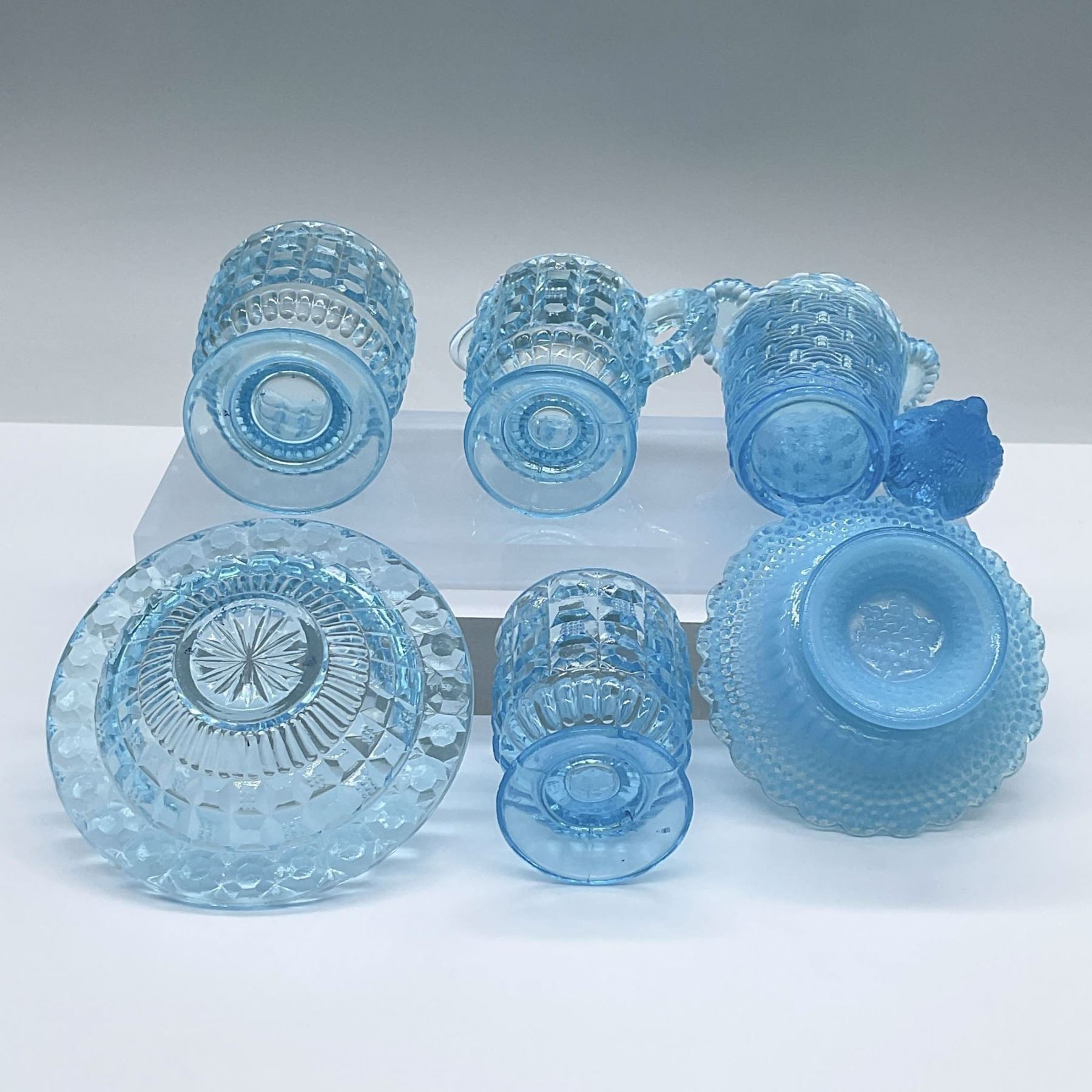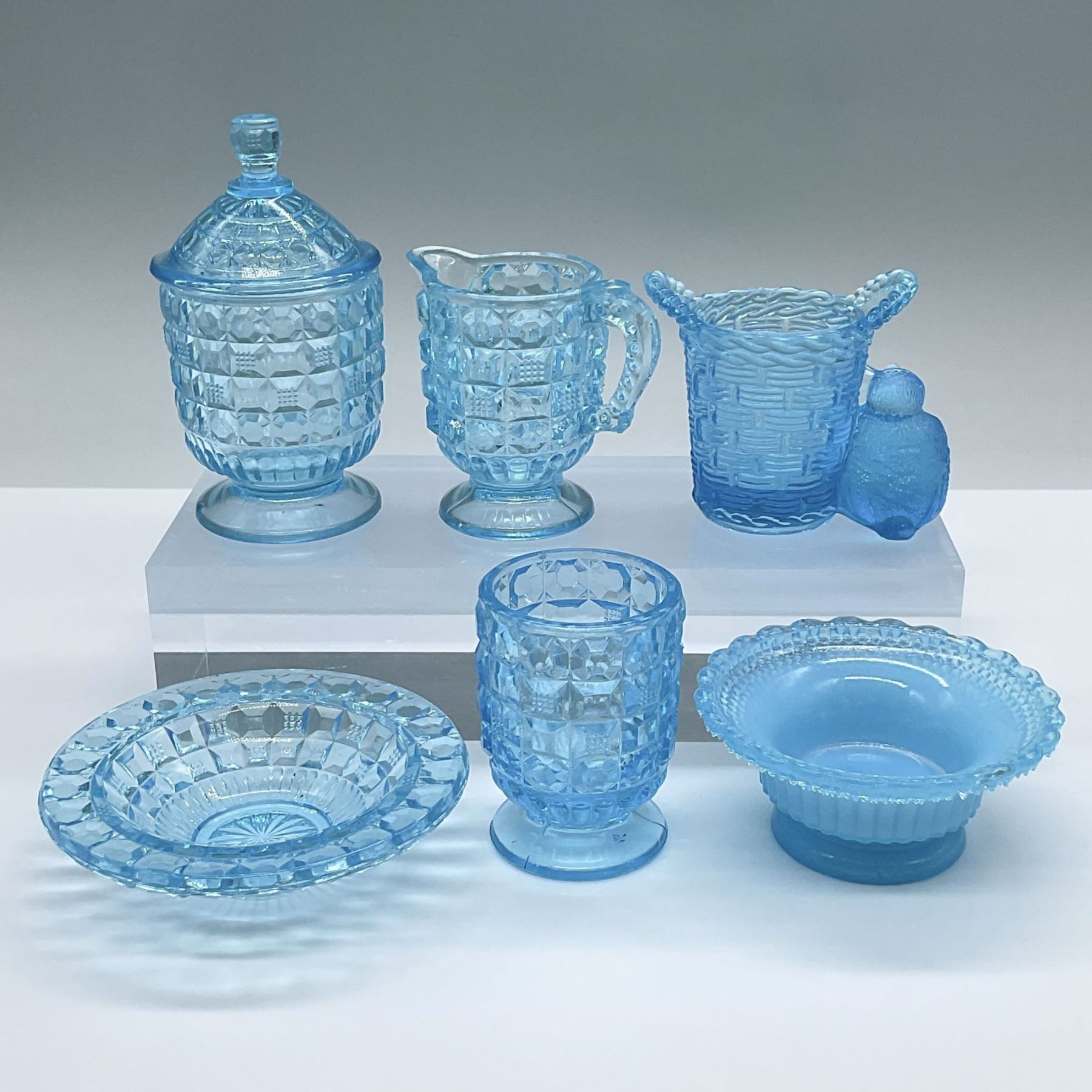 Features a creamer, lidded sugar bowl, spooner, and a small dish, all with a waffle pressed design. Also includes an opalescent cellar with a star dewdrop pattern at the underside, and tooth pick holder basket with bird. Largest measures 2.25"L x 2.25"W x 4.25"H. Smallest measures 1.75"L x 1.75"W x 2.5"H.