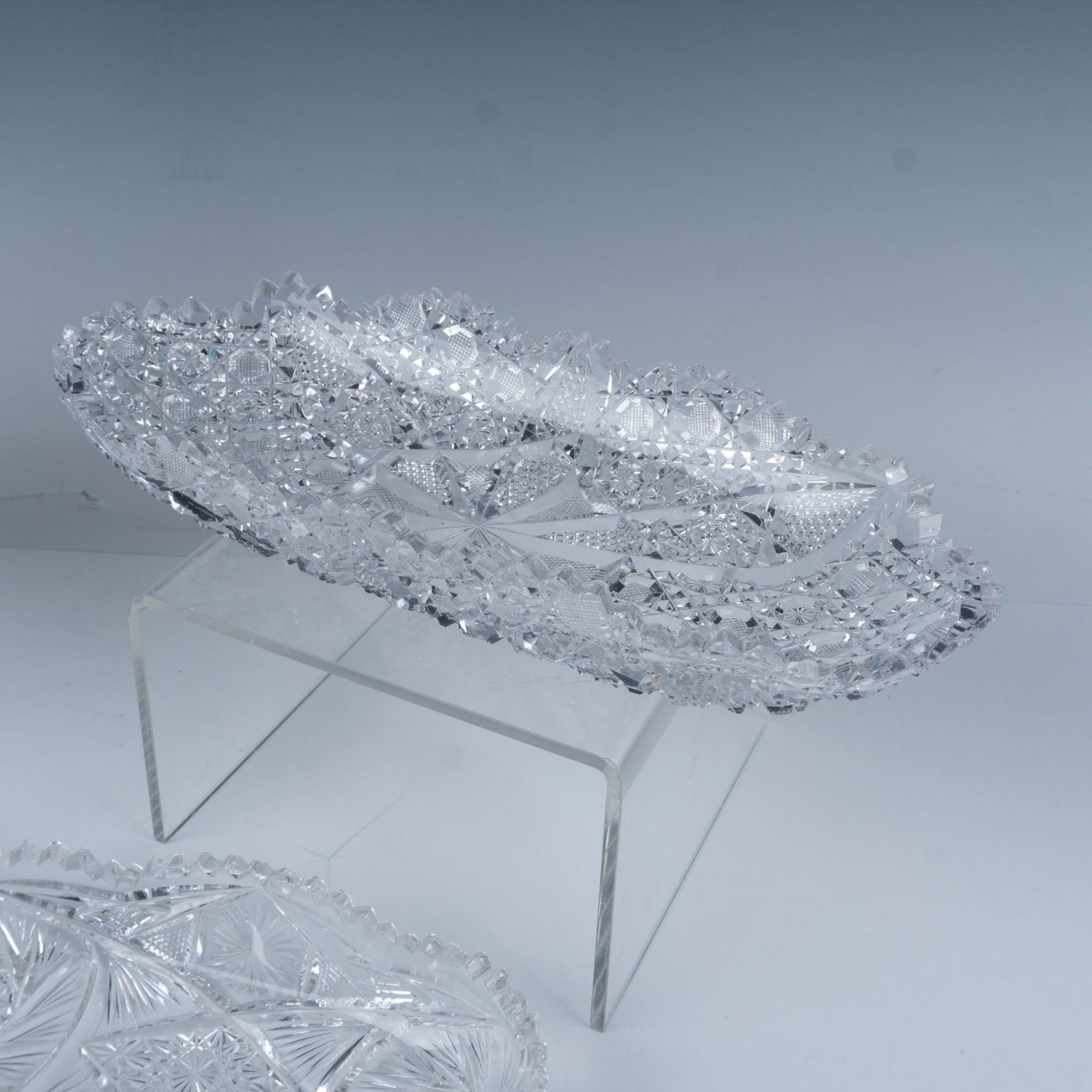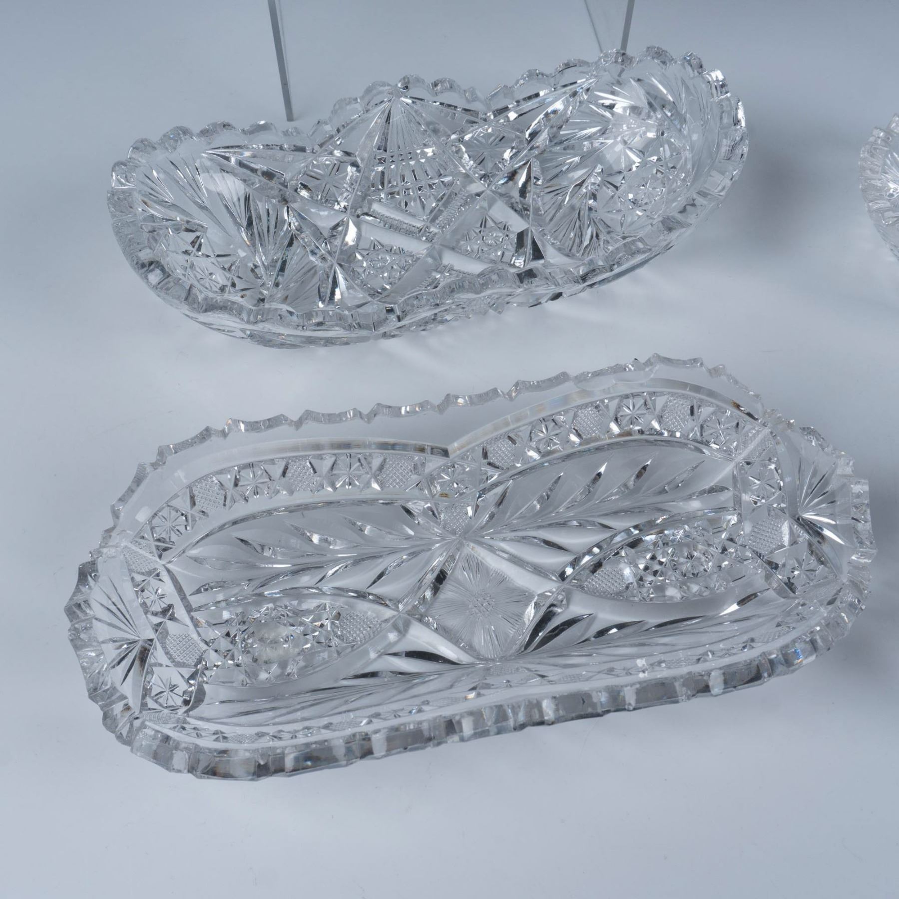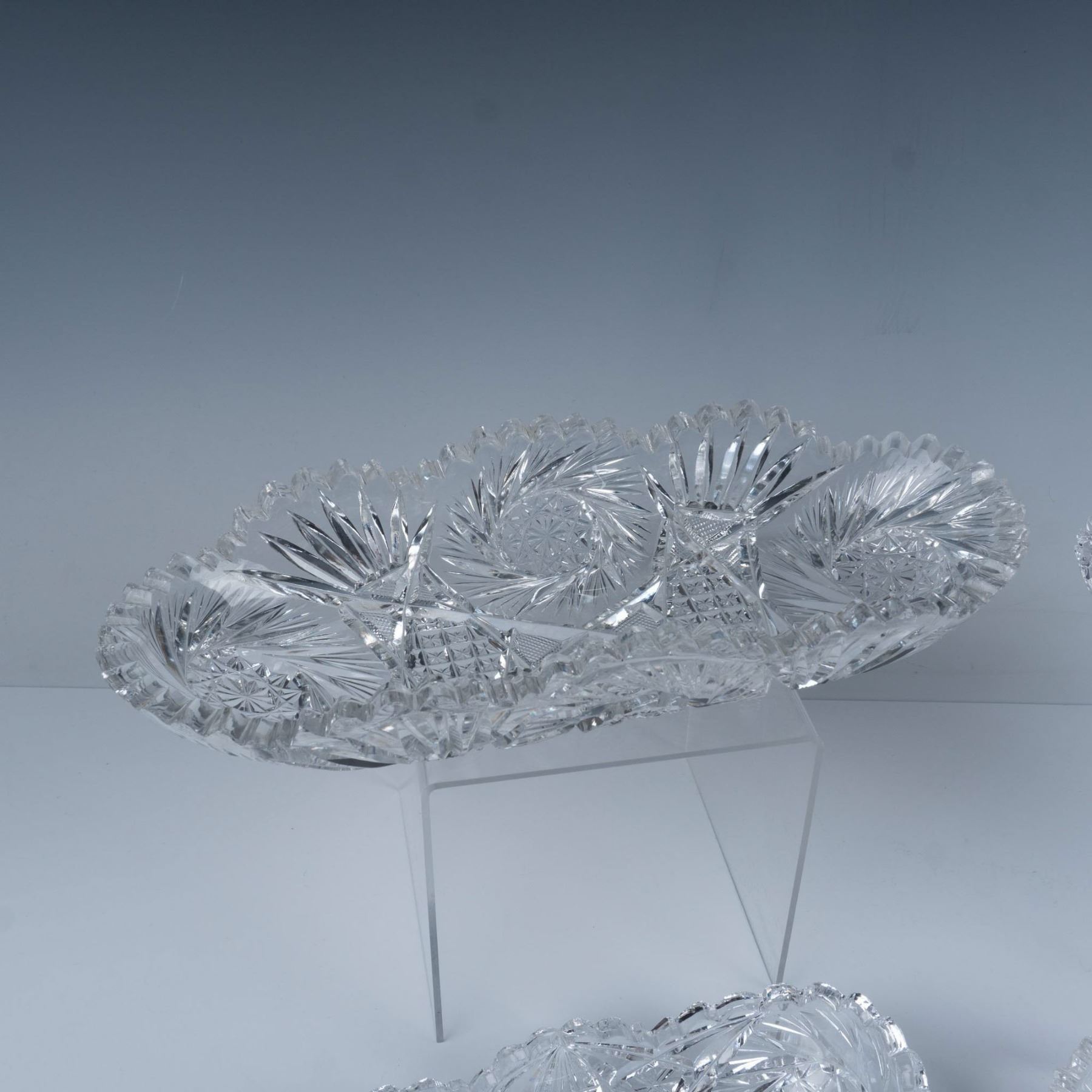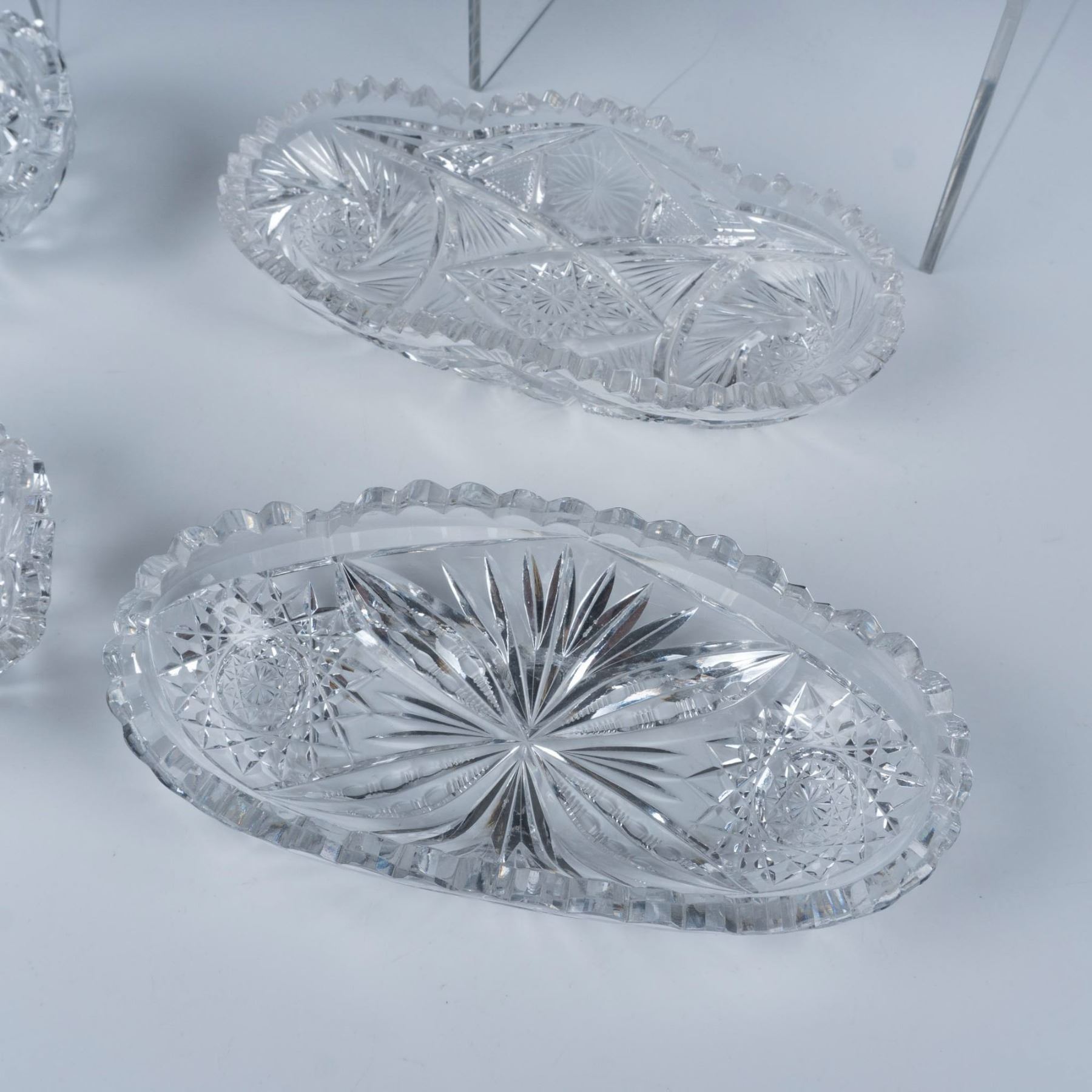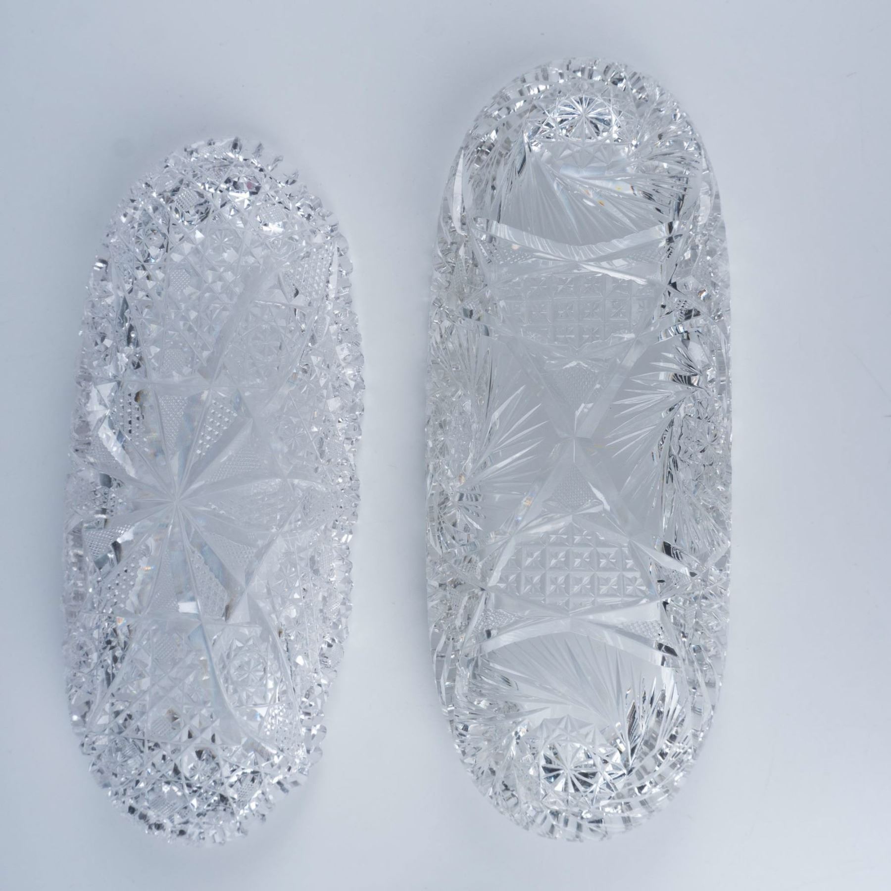 This 6 piece set of radish and celery dishes include brilliant cut glass hobstar and pinwheel designs. Largest measures 11.75"L x 4.75"W x 2.25"H.