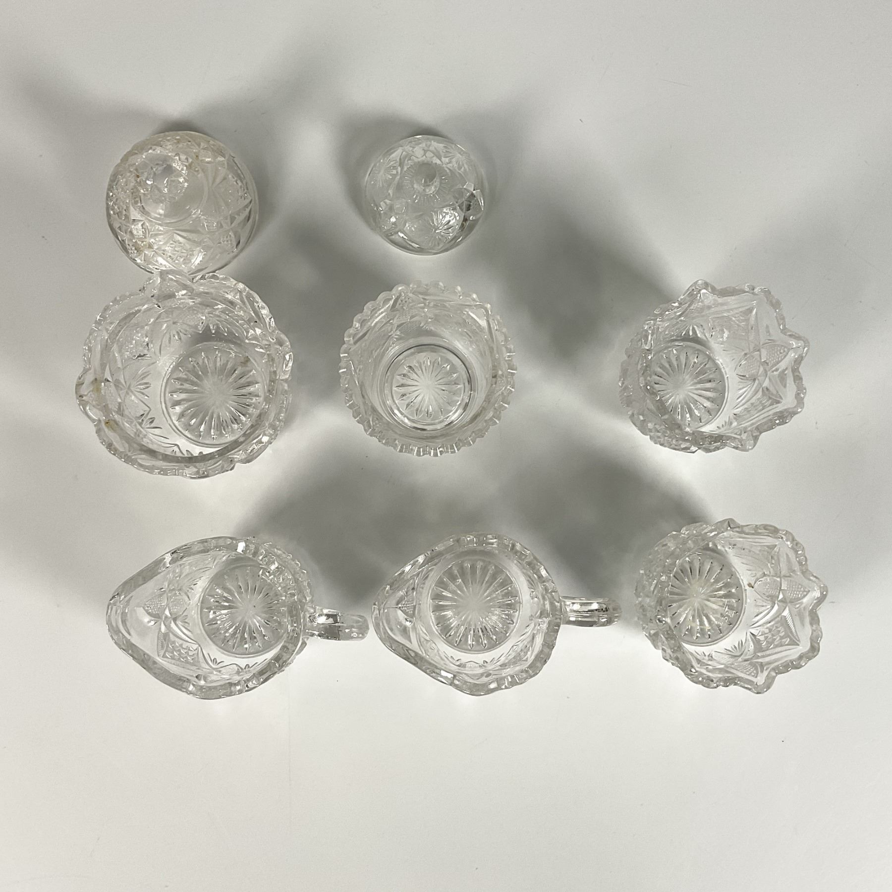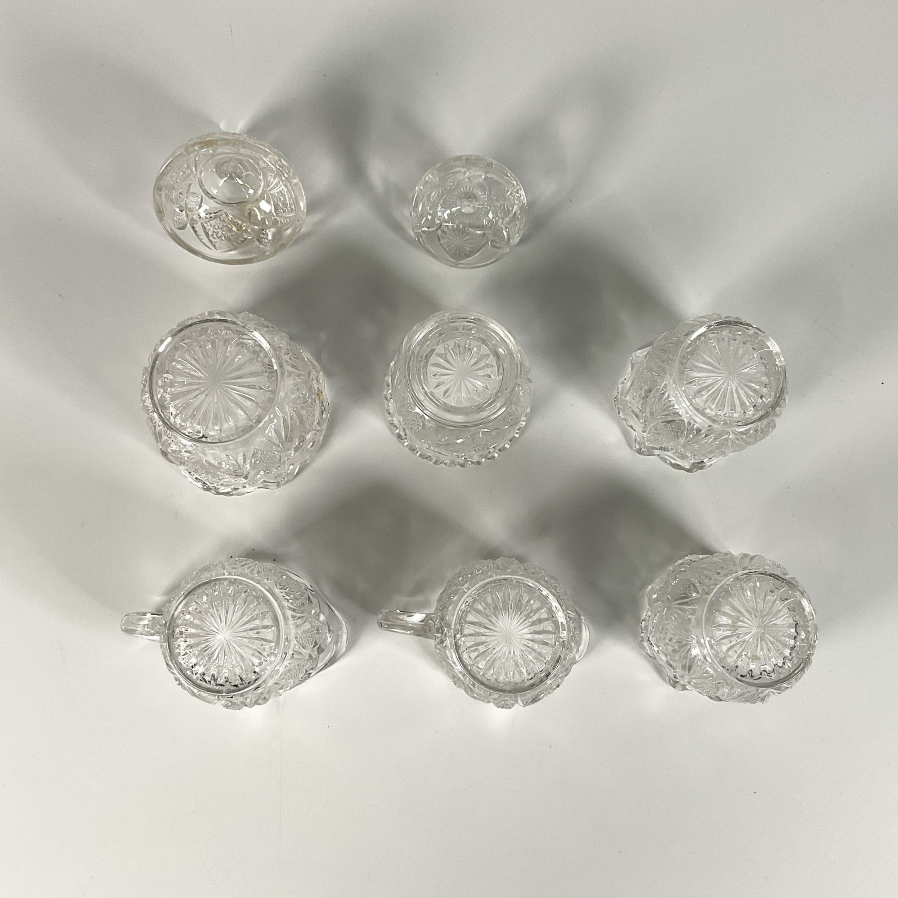 Glassware set adorned with intricate various patterns including diamonds and flowers includes two sugar bowls with lids, two creamers, and two spooners. Largest Sugar bowl: 3"W x 3.75"H. Creamer: 3.5"L x 2.25"W x 2.5"H. Spooner: 2.25"W x 2.25"H
