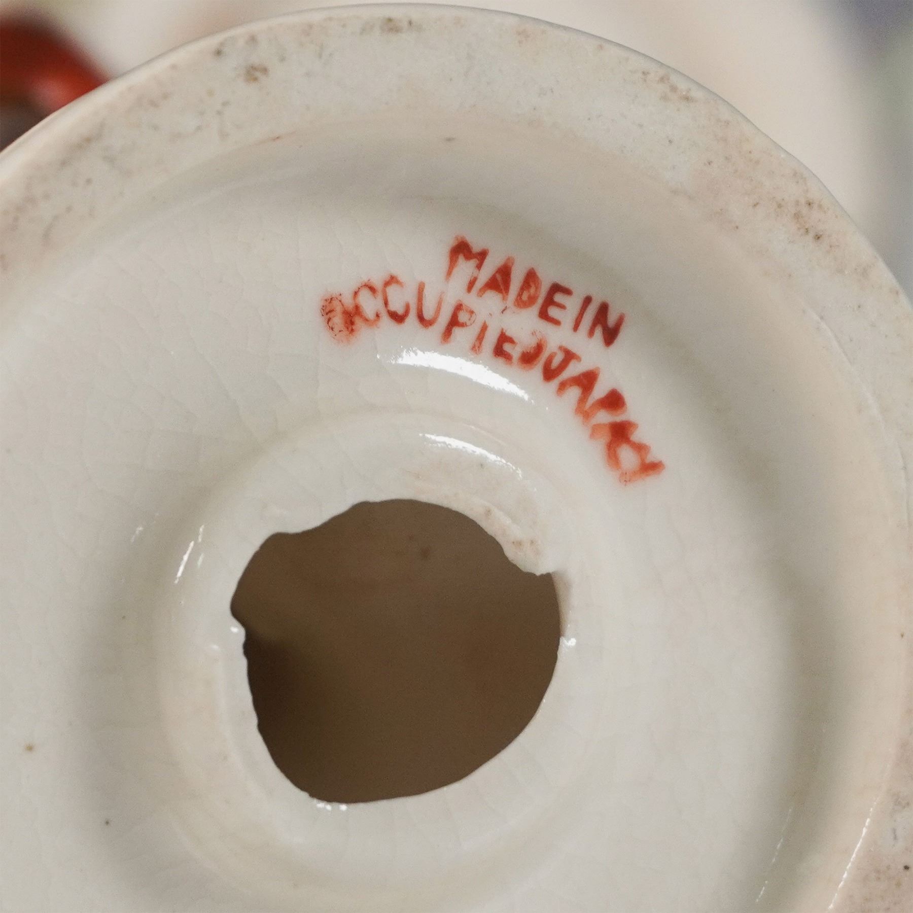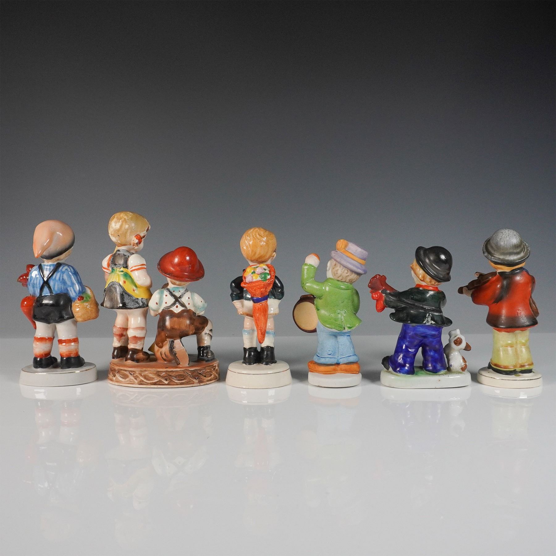 Group of six charming vintage porcelain figurines marked Occupied Japan, circa 1945–1952. Each figurine depicts playful children and musicians, finely modeled and brightly hand-painted in vibrant colors characteristic of the era. Scenes include boys and girls engaging in various leisure activities, featuring instruments and whimsical poses. Clearly marked Occupied Japan, these figurines highlight post-war Japanese craftsmanship and possess nostalgic charm. Largest item measures 5.5"H.