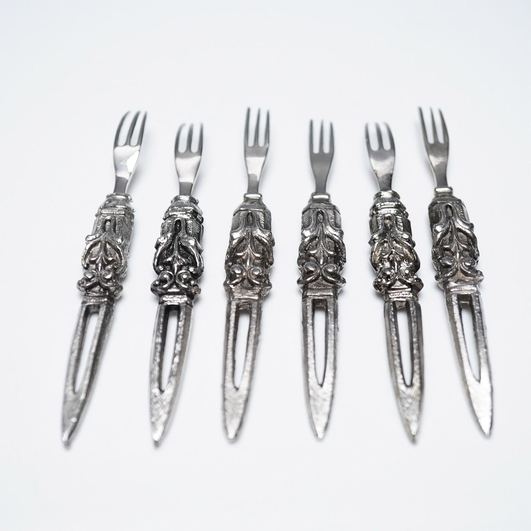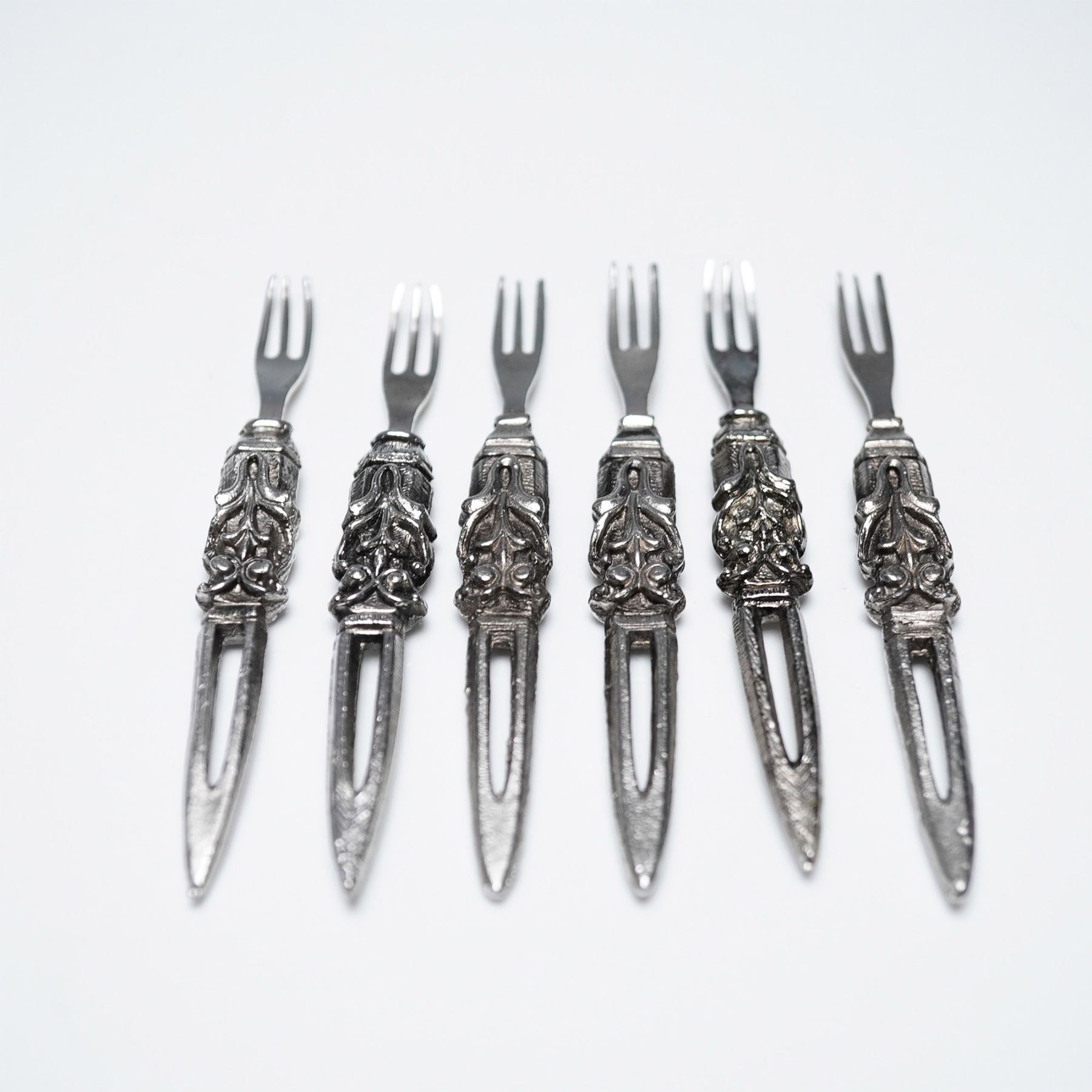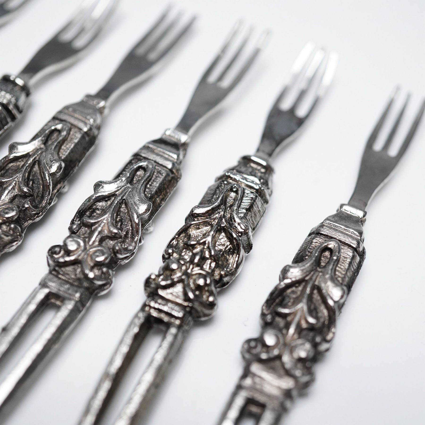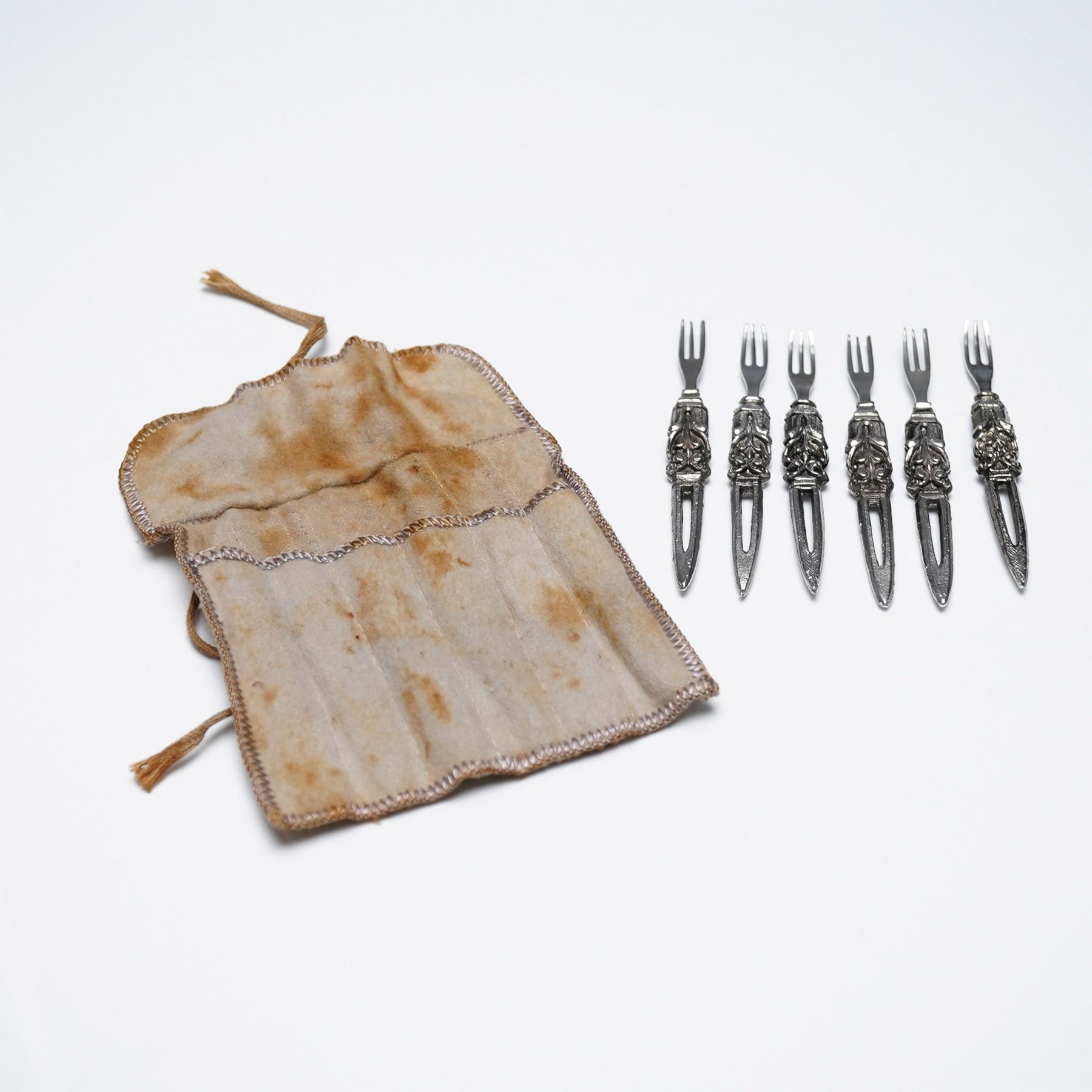 A vintage set of six ornate appetizer forks featuring an intricate raised relief design on the handles. The decorative motif suggests an antique-inspired aesthetic, with elaborate detailing reminiscent of classic European craftsmanship. These forks exhibit signs of age and patina, adding to their vintage appeal. No visible maker's marks or hallmarks. Comes with a well-worn storage wrap. A unique and charming addition to any flatware collection or vintage dining setup.