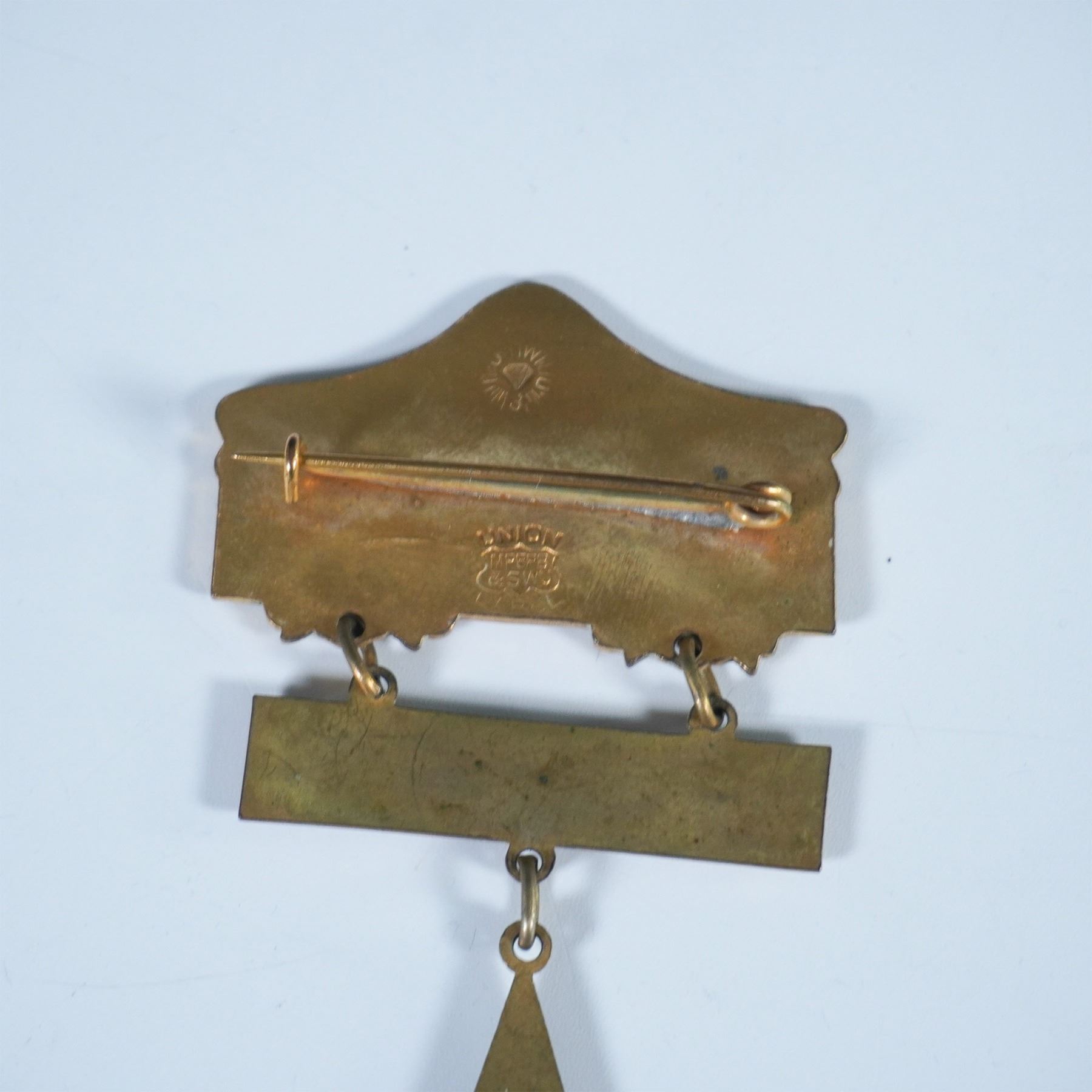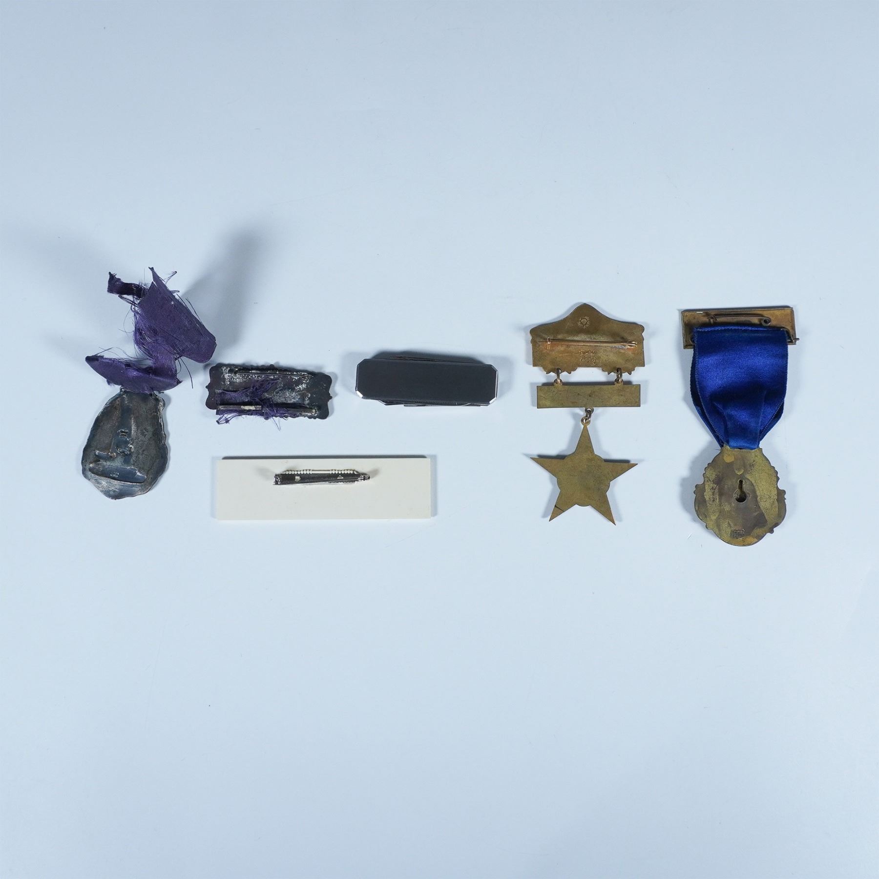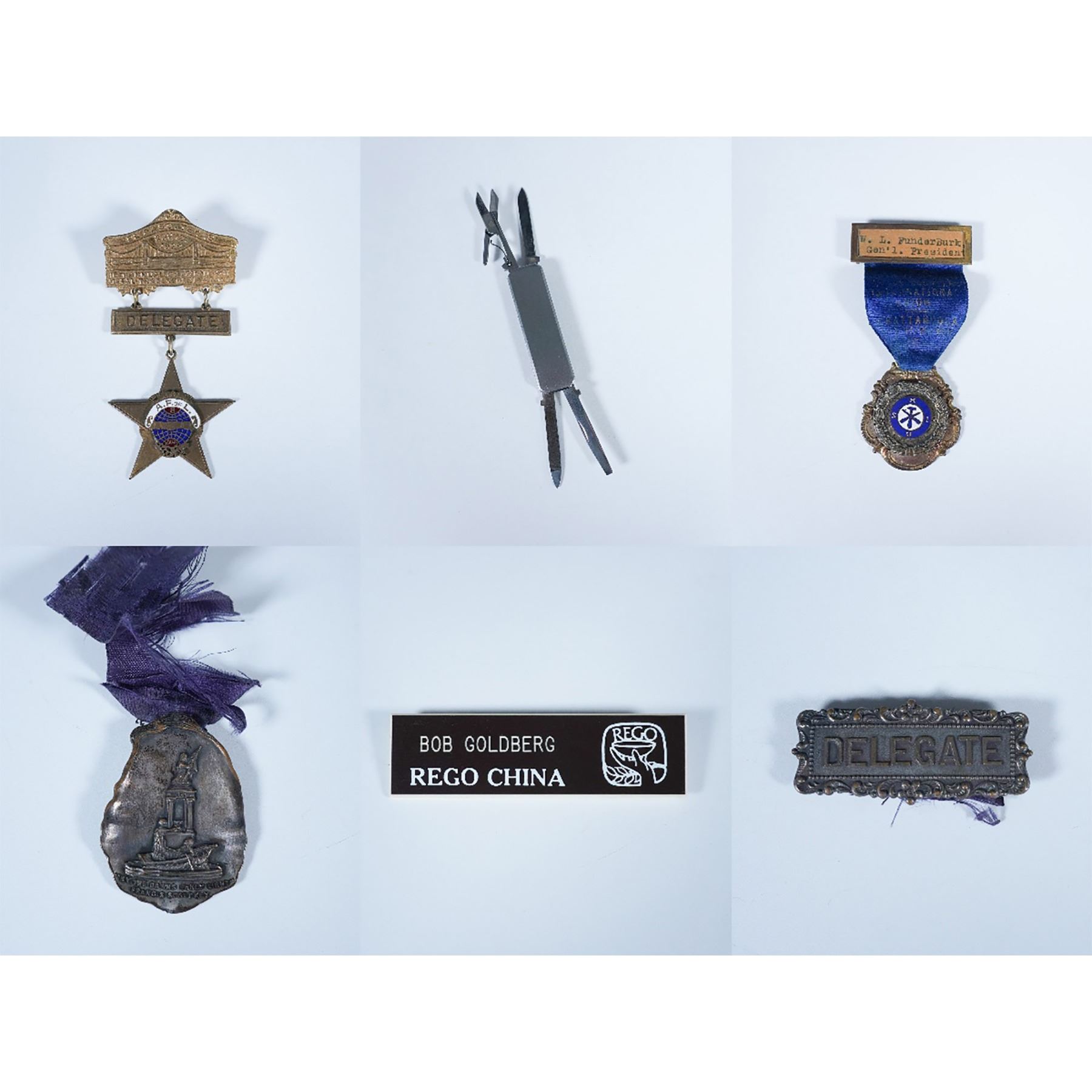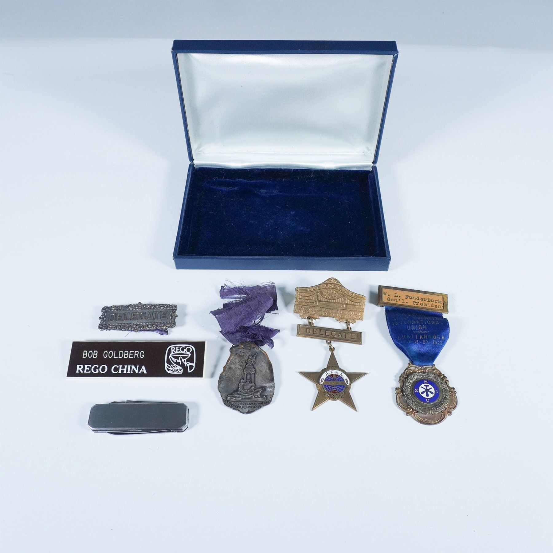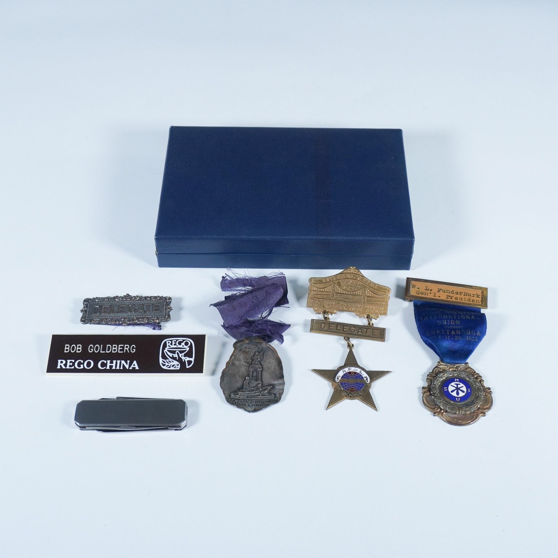 Grouping includes two delegate badges, a 1933 International Union ribbon badge marked “W.L. FunderBurk, Gen’l. President,†a commemorative medal with tattered purple ribbon featuring a monument and “By The Dawns Early Light,†a Rego China name tag, a compact stainless multi-tool knife, and a velvet-lined display case. A meaningful lot for collectors of labor union memorabilia and historical medals. Largest item measures 4" drop length.