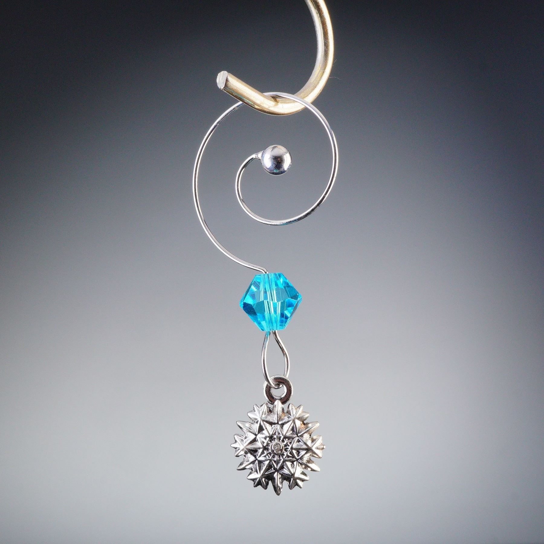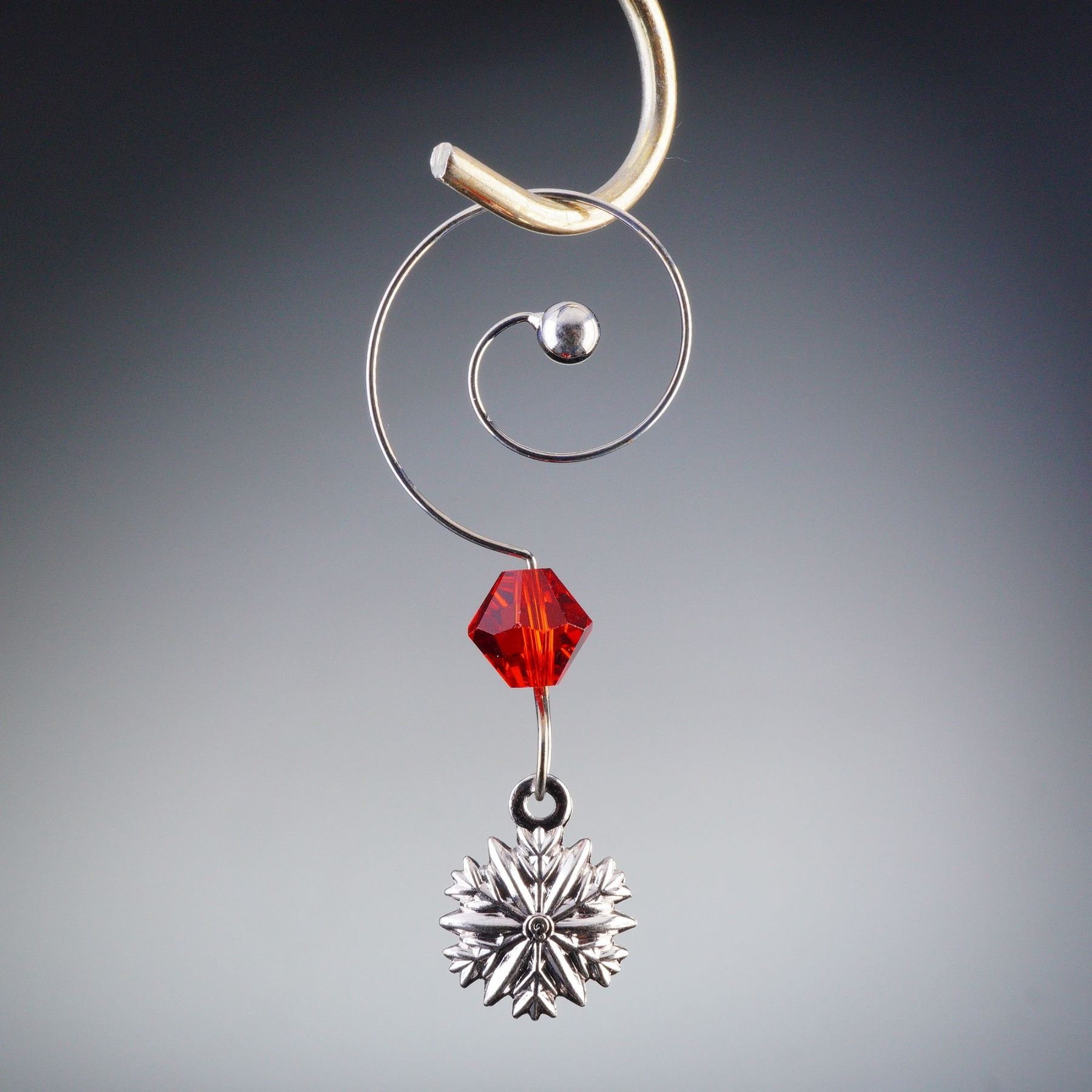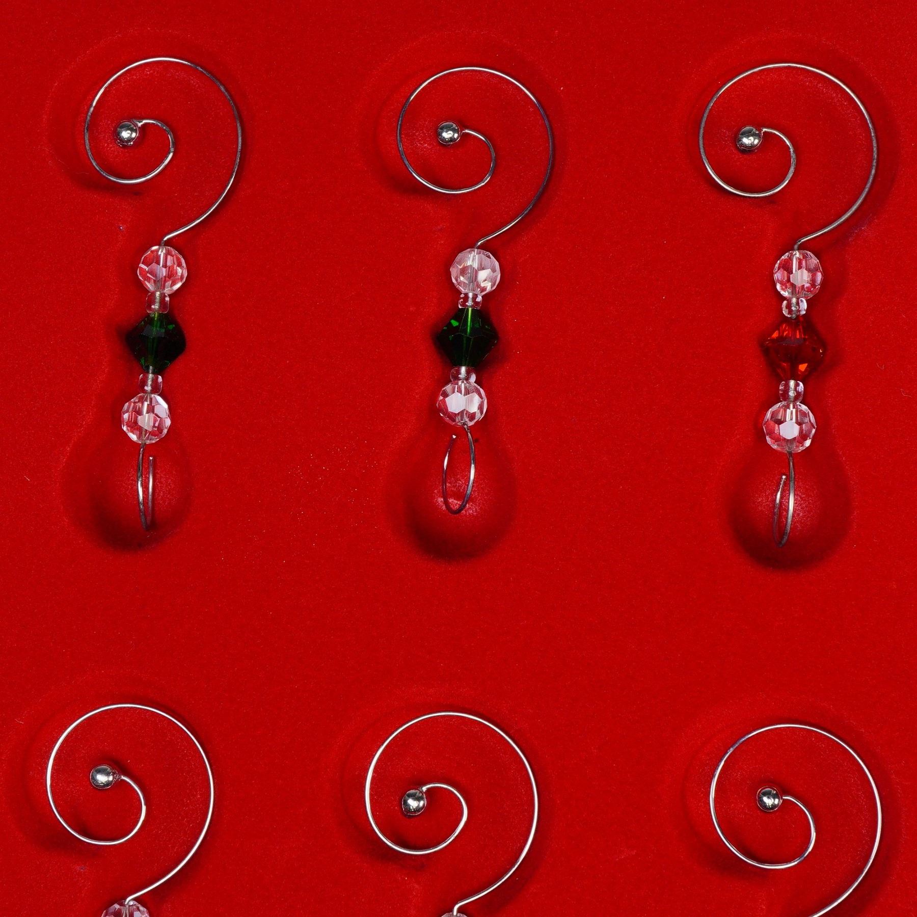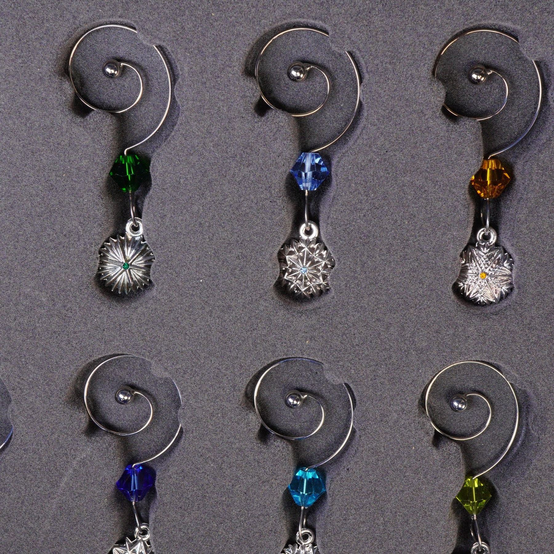 Enhancer sets featuring elegantly coiled silver-tone hangers accented with faceted crystal beads in a range of vibrant hues including ruby red, emerald green, sapphire blue, topaz, and aquamarine. Several enhancers are finished with finely detailed silver-tone snowflake charms that glisten beneath the colored crystal, while others are adorned with clear and colored faceted beads arranged in balanced sequences. Each enhancer showcases the refined craftsmanship characteristic of Waterford Crystal and is presented in original red and gray fitted boxes bearing the Waterford logo.