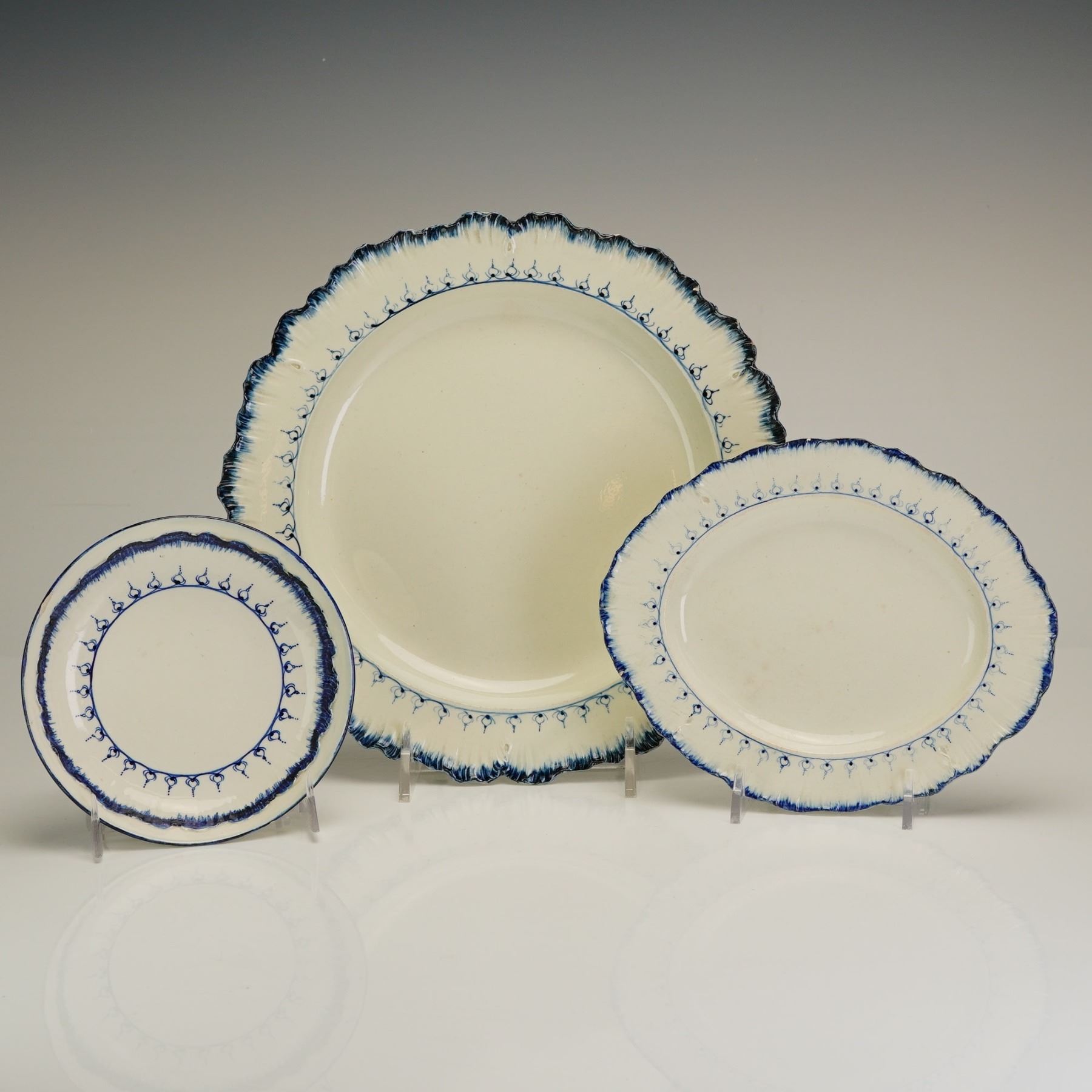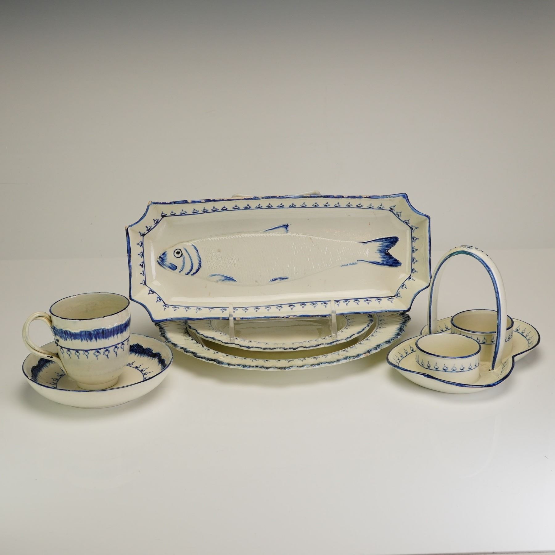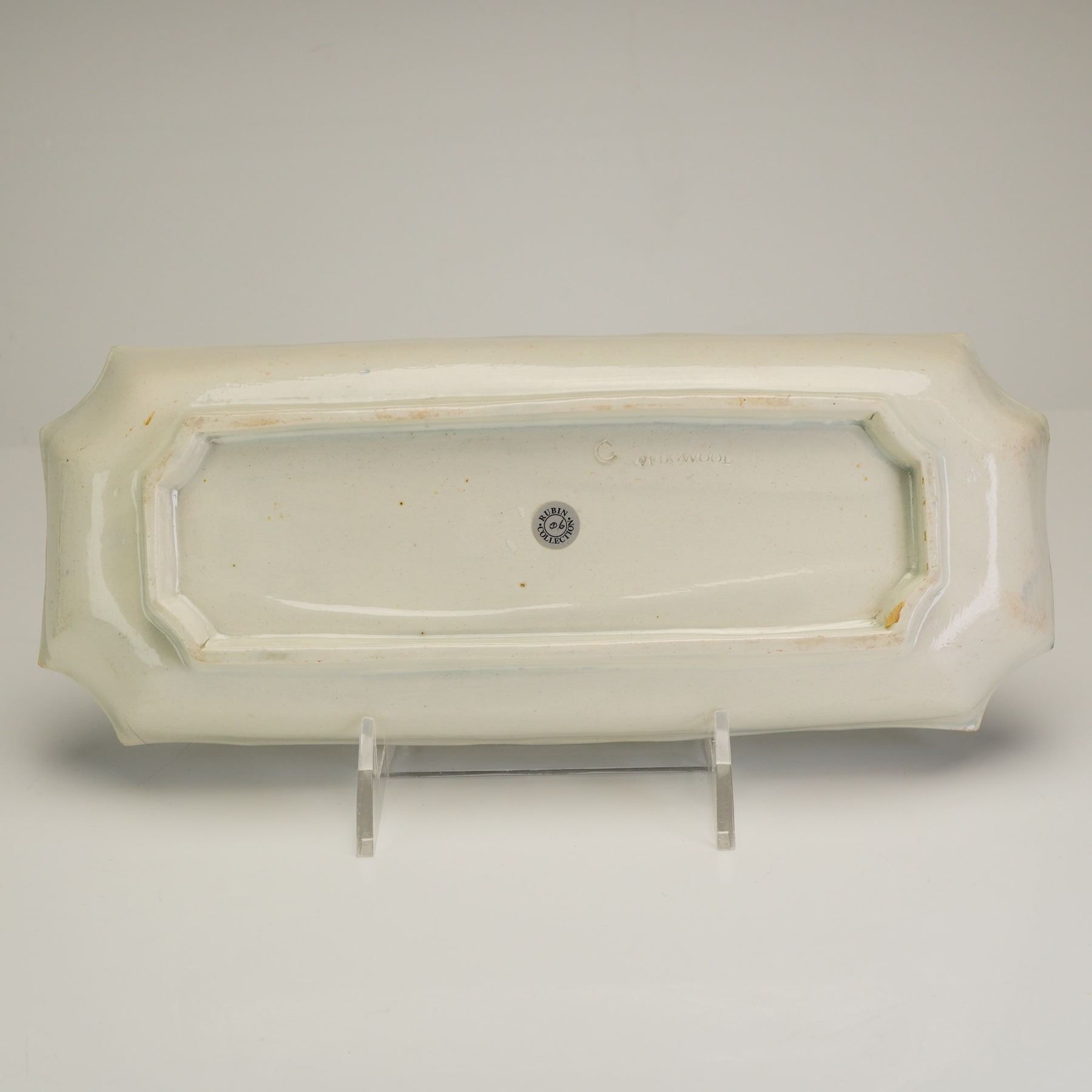 This 6pc collection of Wedgwood pearlware is decorated in the Mared pattern, featuring a cream-colored glaze with blue shell-edge borders and repetitive teardrop motifs. The group includes a handled double condiment holder, a rectangular fish tray, a cup, a small bowl, a small oval plate, and a dinner plate. The rectangular tray is designed with an embossed and blue-painted central fish motif. Visible markings on the reverse of the rectangular tray include an impressed WEDGWOOD manufacturer mark and an impressed letter C, alongside a Rubin Collection inventory sticker.