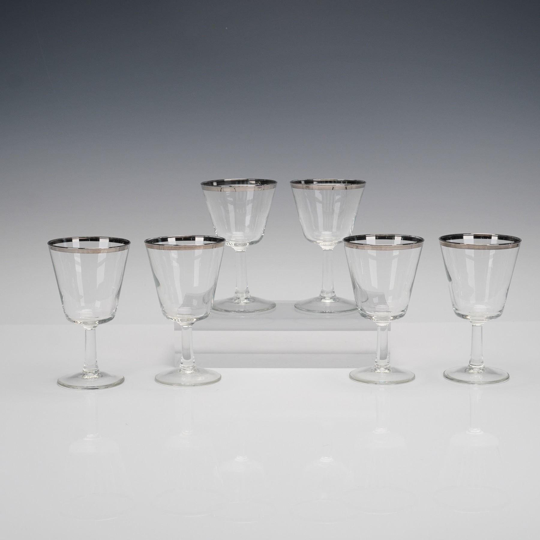 This refined set of six French glasses features a clean, modern profile enhanced by elegant platinum-like trim along the rim. Each glass is finely balanced on a clear stem and stamped France at the base, indicating quality craftsmanship. The glasses display consistent form and clarity, with delicate proportions suitable for white or red wine service. Ideal for formal dining or sophisticated entertaining, they embody understated luxury and timeless appeal.