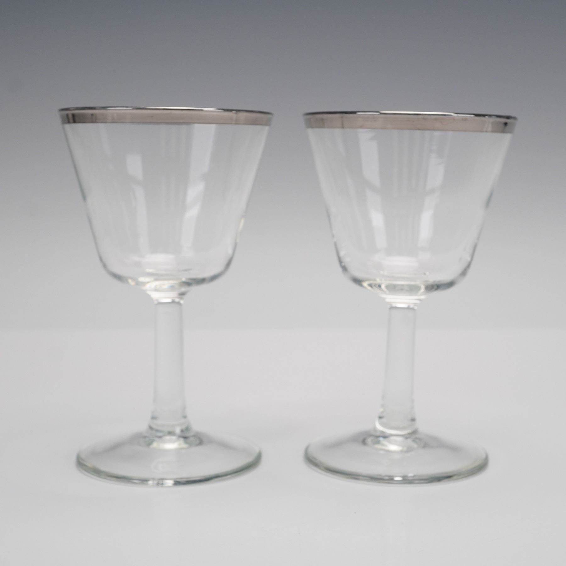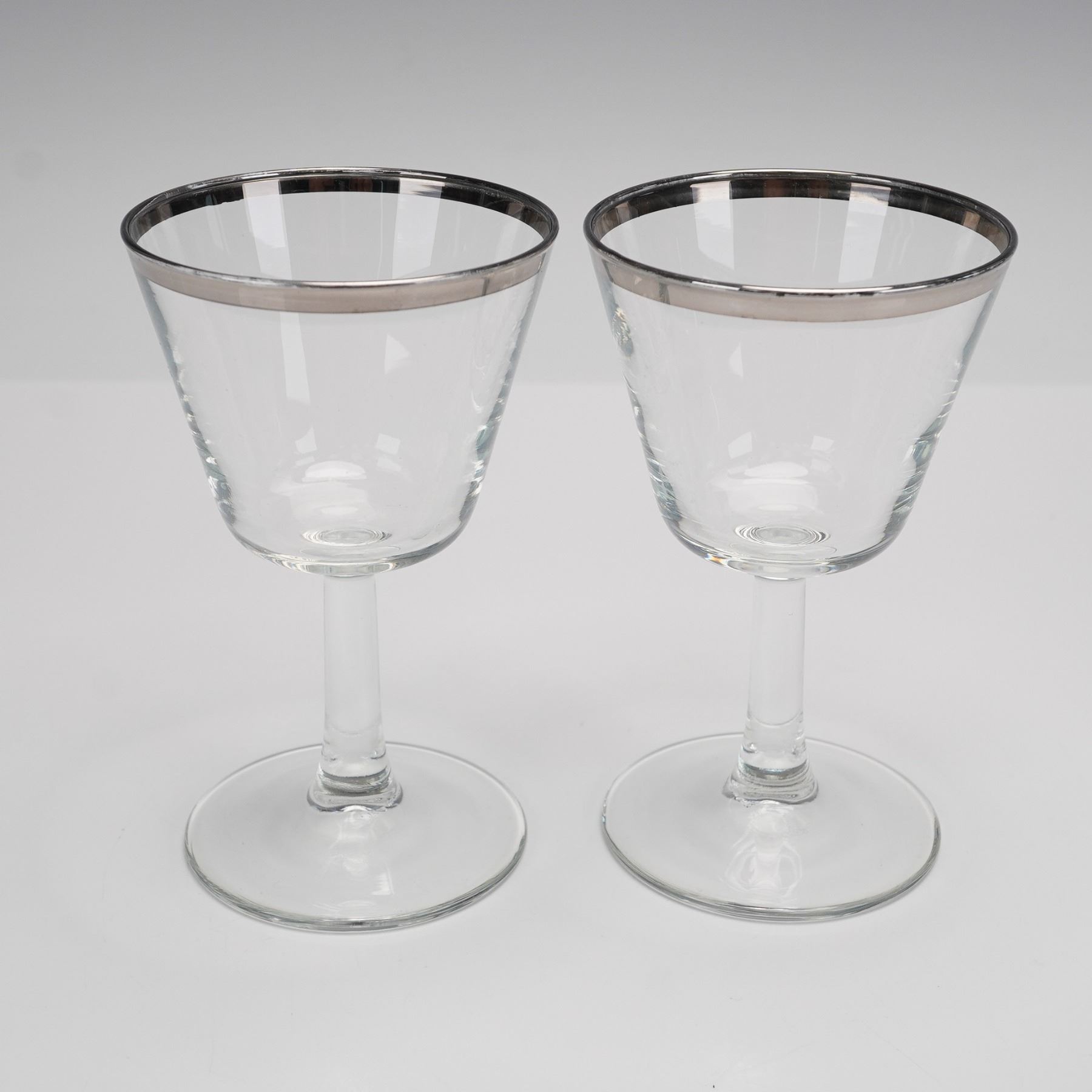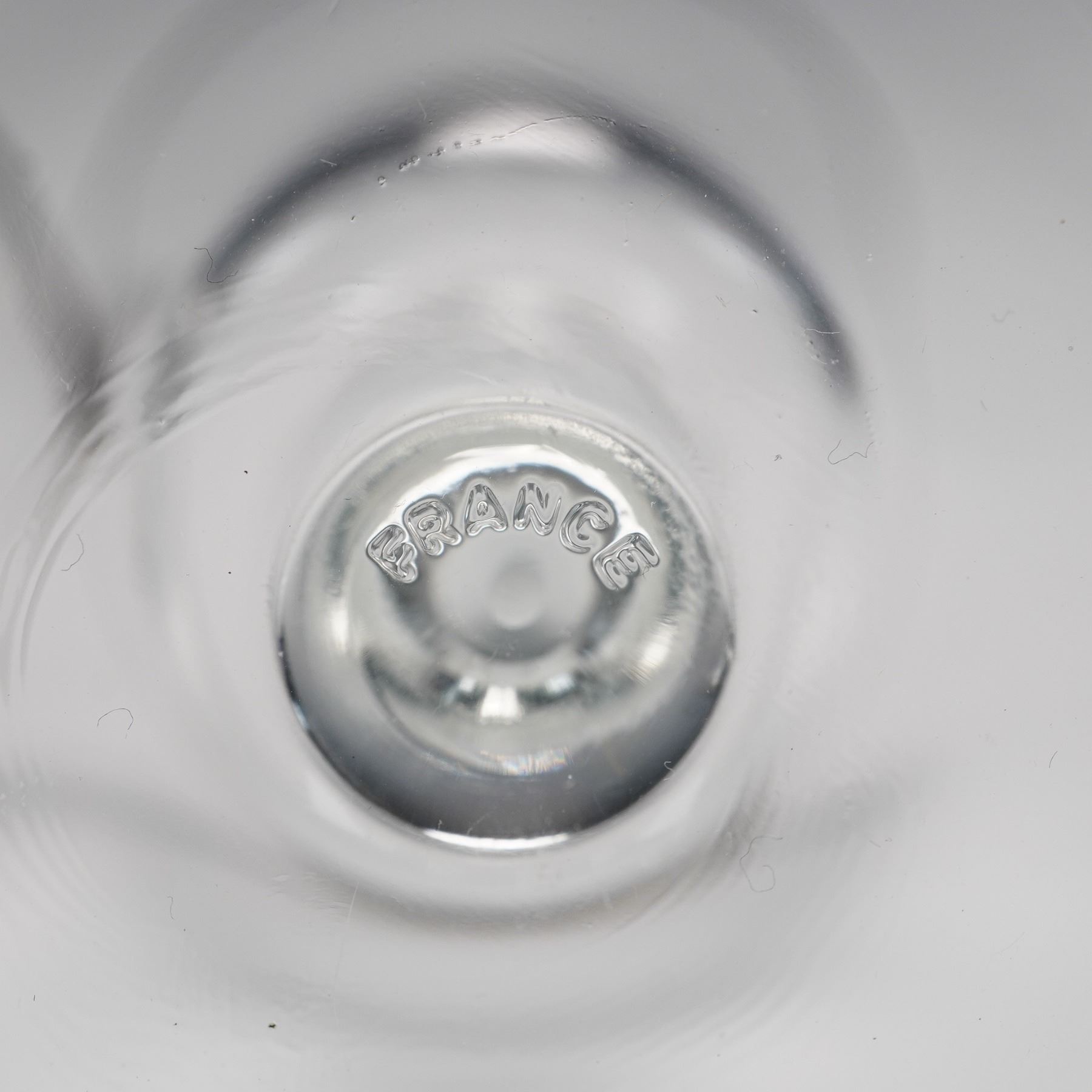 This refined set of six French glasses features a clean, modern profile enhanced by elegant platinum-like trim along the rim. Each glass is finely balanced on a clear stem and stamped France at the base, indicating quality craftsmanship. The glasses display consistent form and clarity, with delicate proportions suitable for white or red wine service. Ideal for formal dining or sophisticated entertaining, they embody understated luxury and timeless appeal.