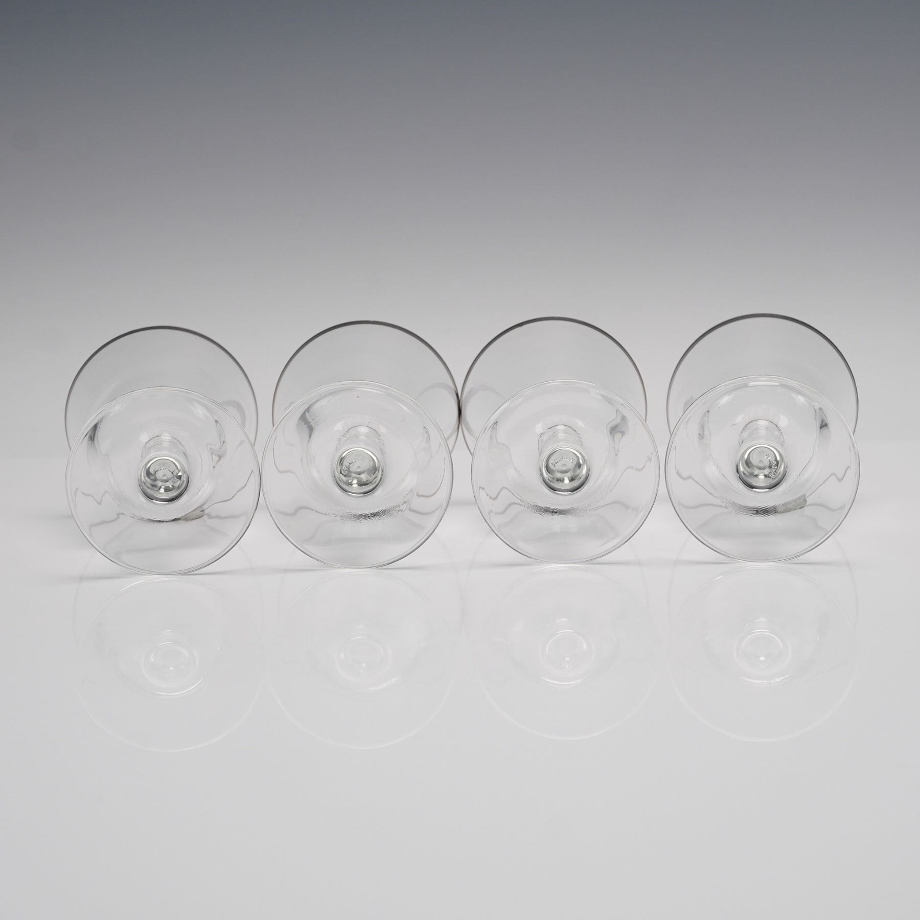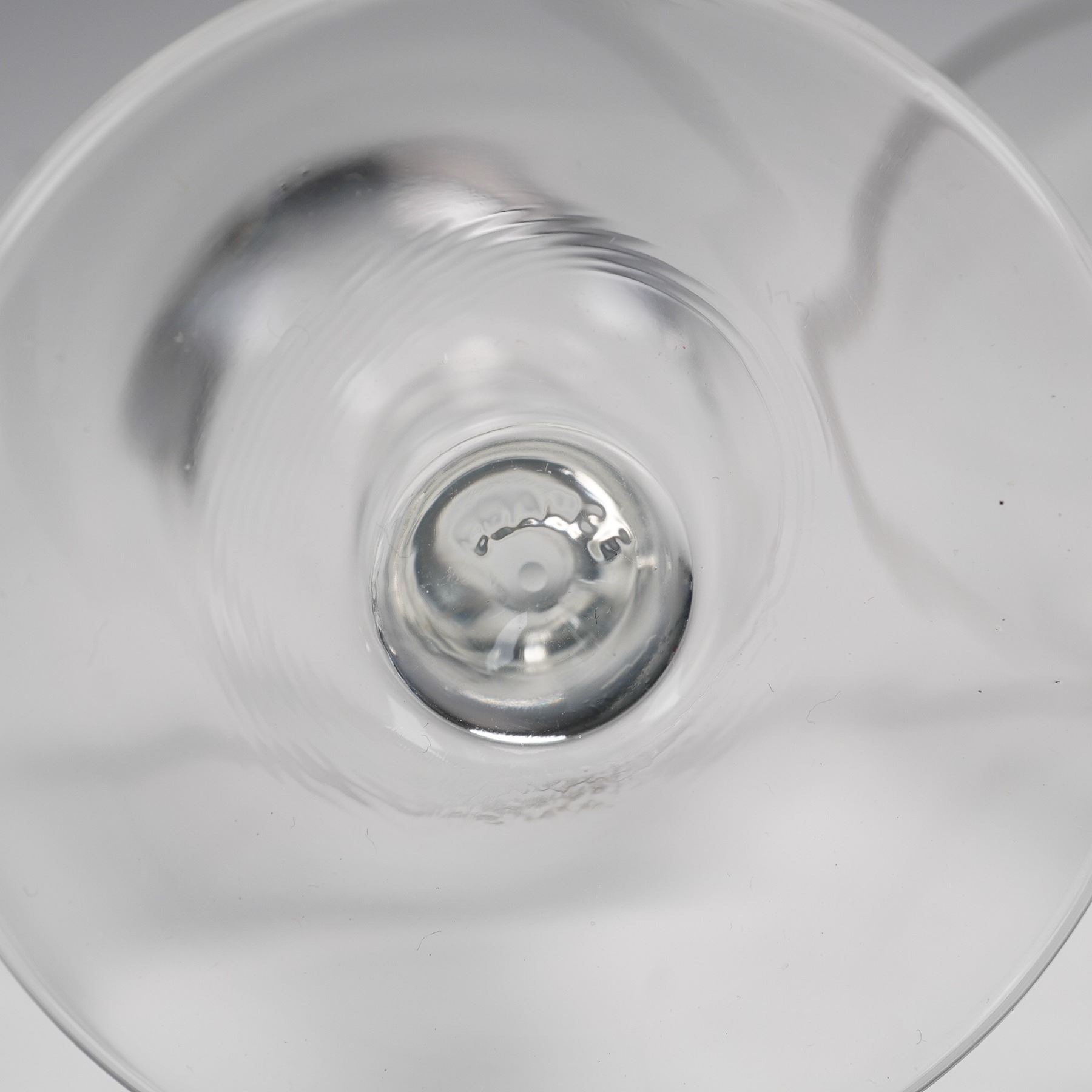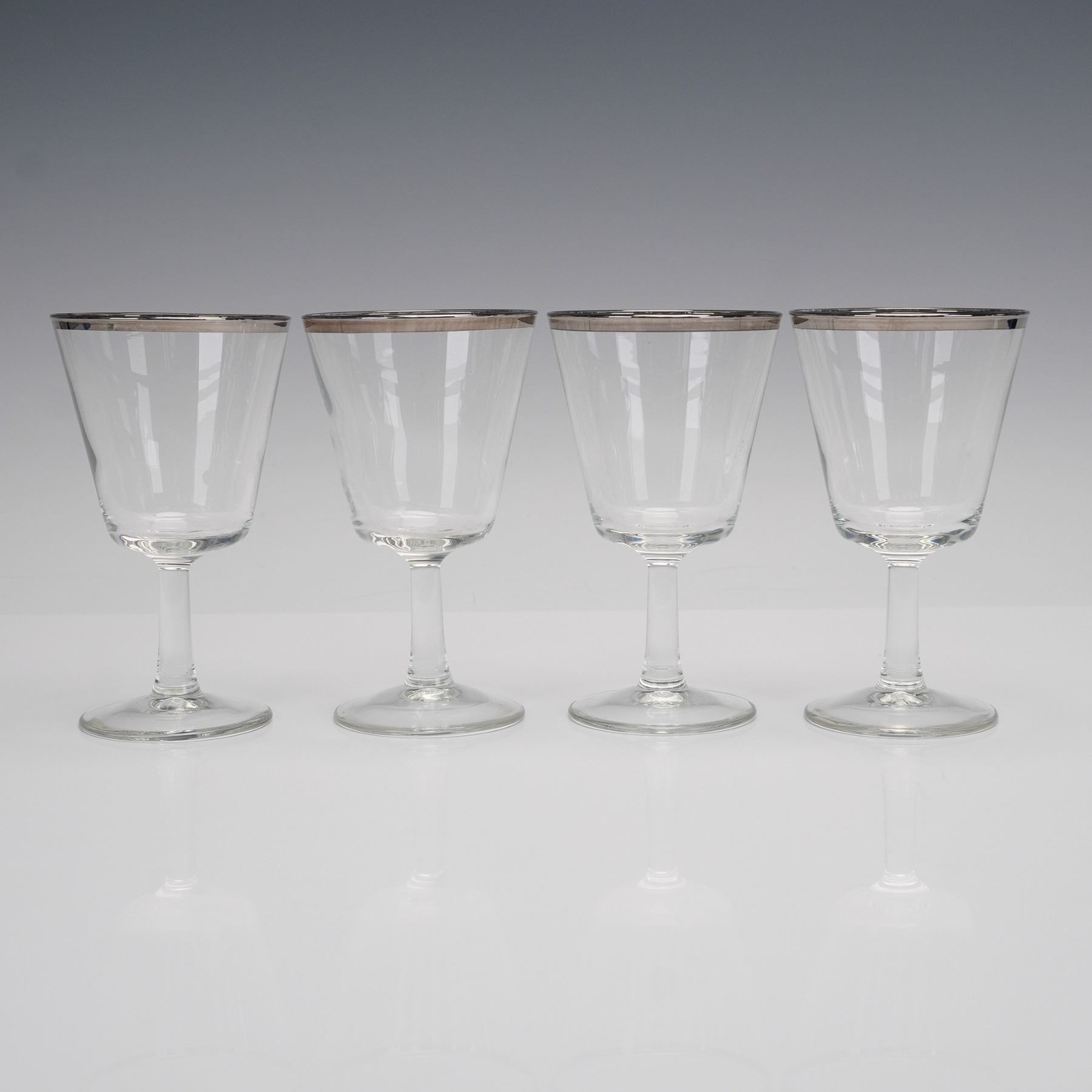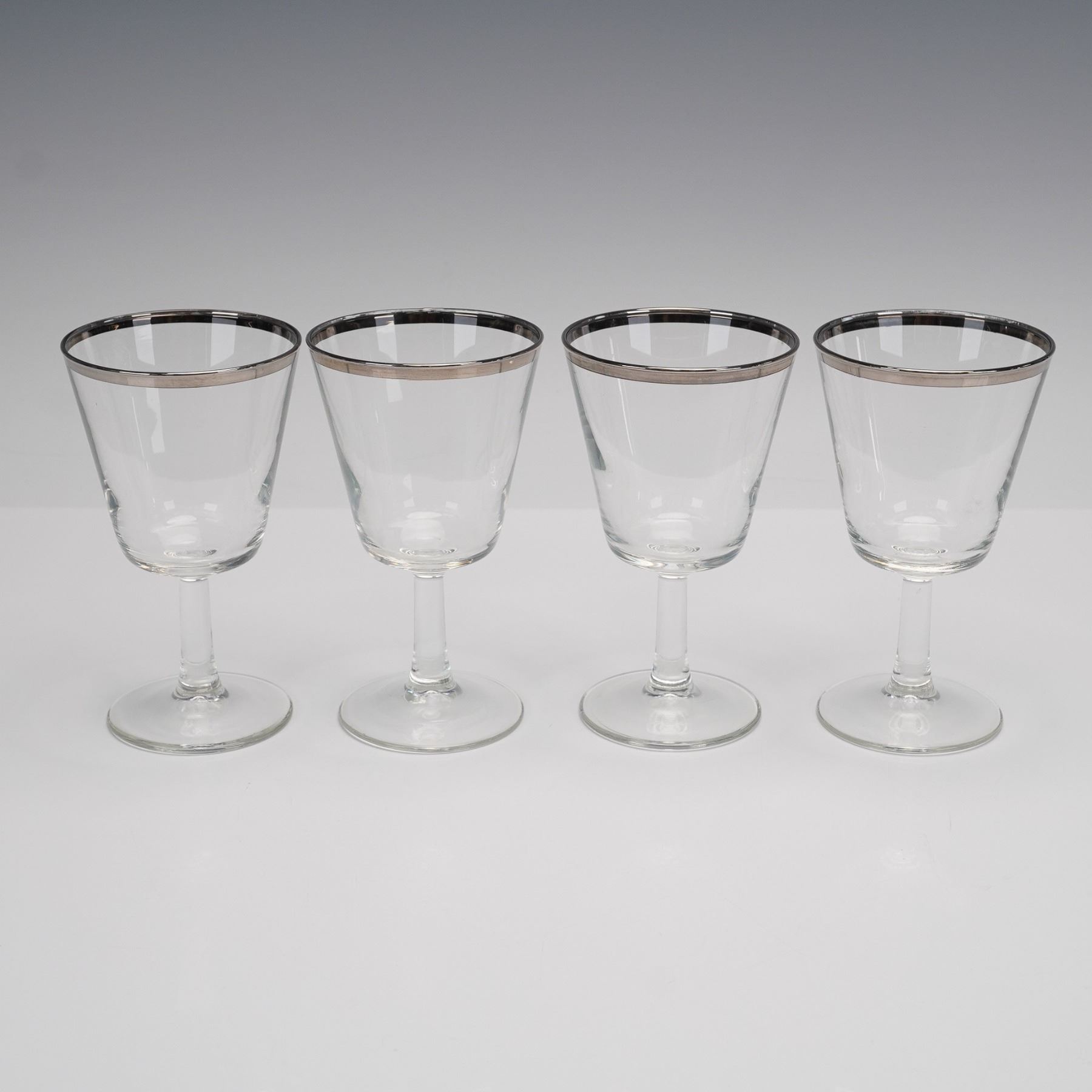 This refined set of six French glasses features a clean, modern profile enhanced by elegant platinum-like trim along the rim. Each glass is finely balanced on a clear stem and stamped France at the base, indicating quality craftsmanship. The glasses display consistent form and clarity, with delicate proportions suitable for white or red wine service. Ideal for formal dining or sophisticated entertaining, they embody understated luxury and timeless appeal.