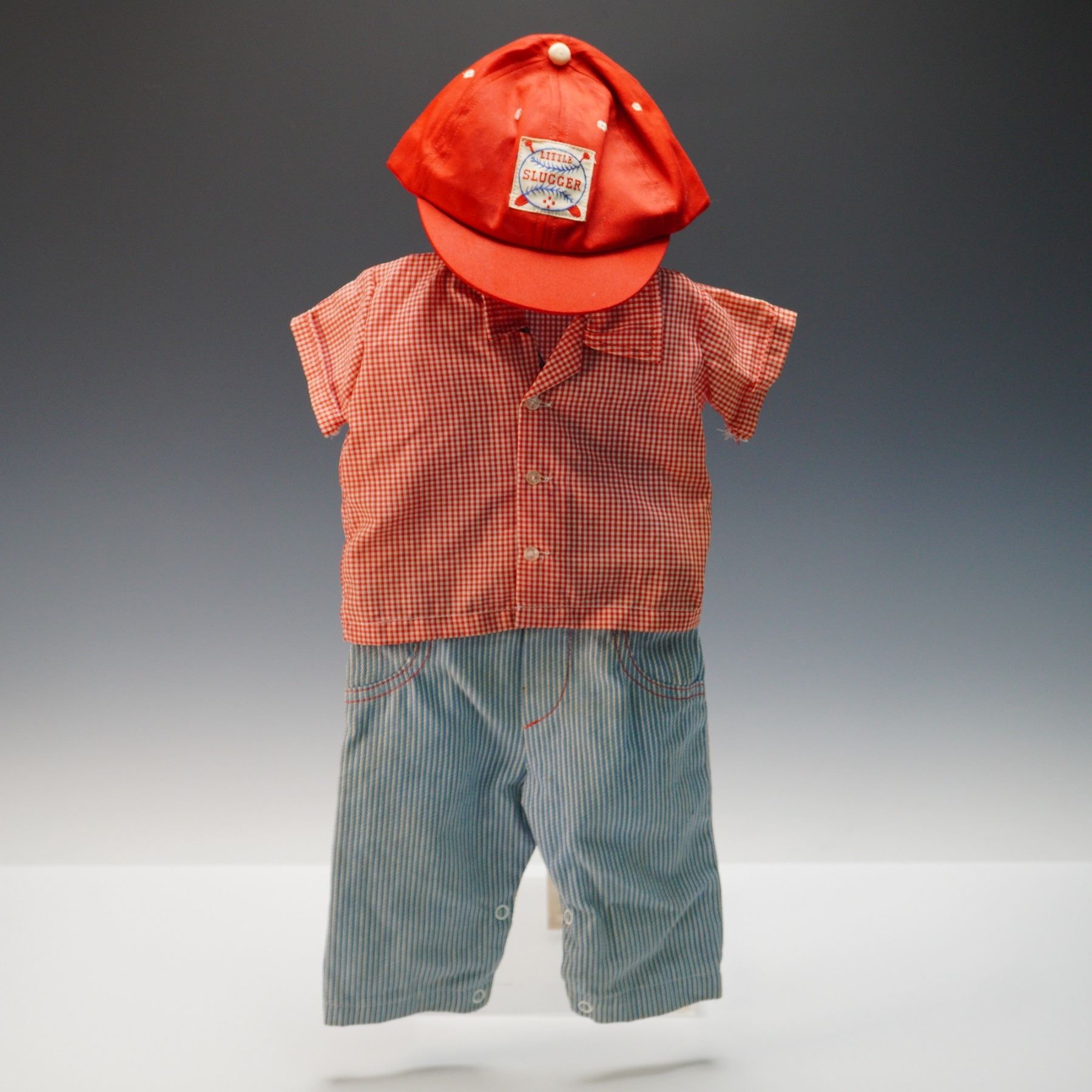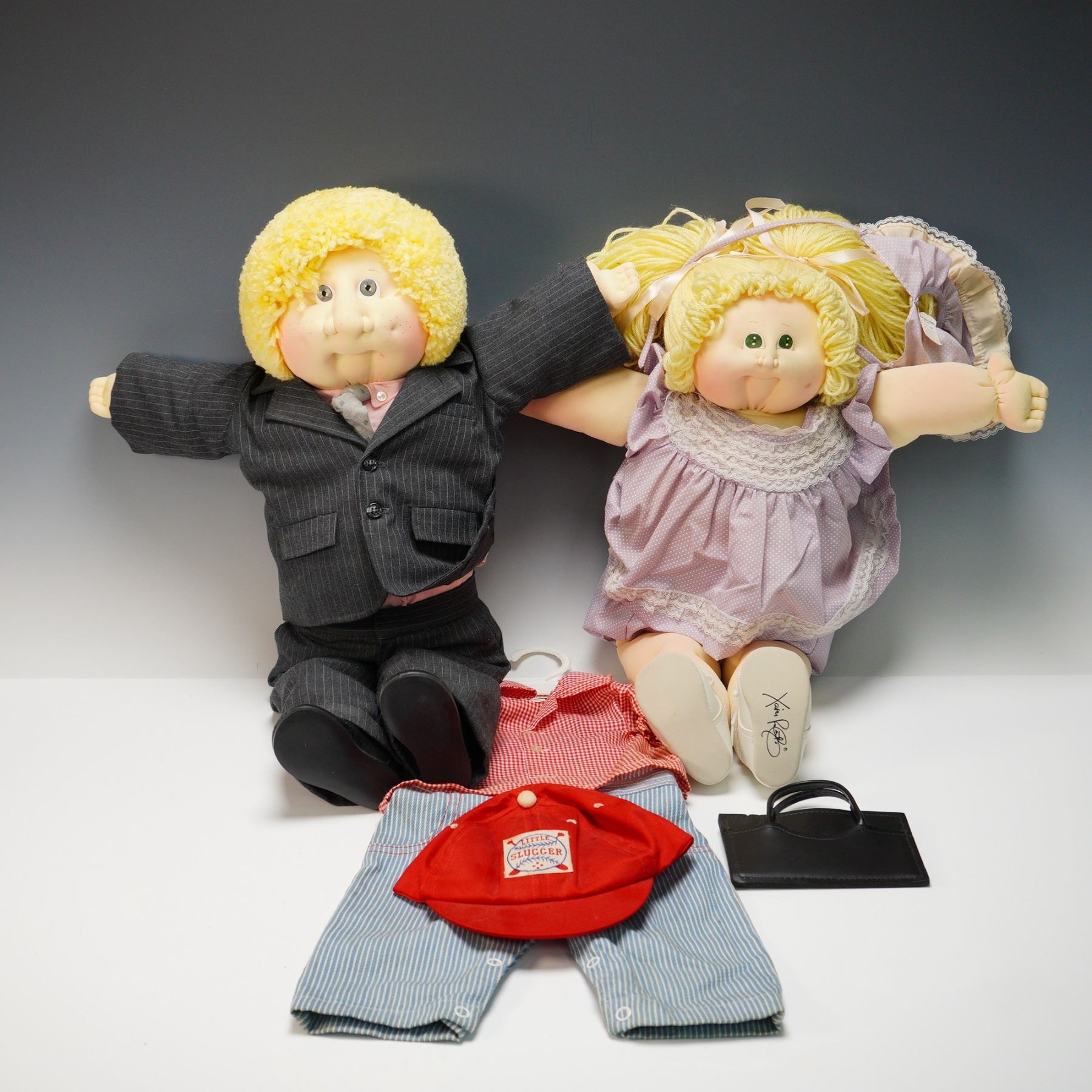 original Cabbage Patch Kids soft-bodied dolls designed by Xavier Roberts, including one male doll in a pinstripe suit and tie and one female doll in a lavender dress with lace trim. Each doll bears the signature of Xavier Roberts, with one signed on the shoe and the other on the fabric torso. The lot also includes a change of clothes consisting of blue and white striped overalls, a red cap labeled Little Slugger, and a red gingham shirt, along with a small black suitcase accessory.