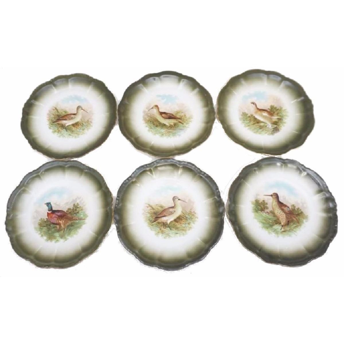 Set of six Victorian porcelain Moschendorf, Germany bird theme dessert / luncheon plates. Each 9" D. Green back stamp used from 1894 to 1910. * one plate with small chip to back.