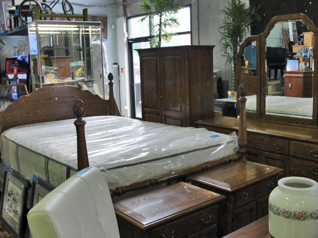 queen size 4 poster bed, armoire dresser, dresser with mirror and 2 night stands