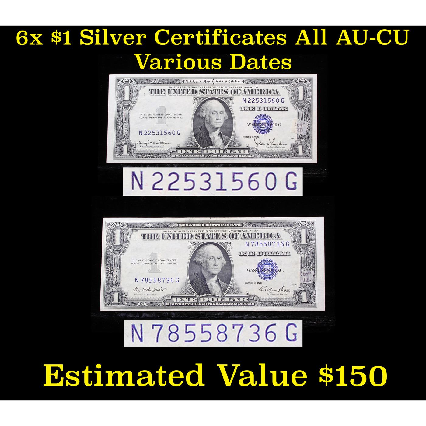 6x $1 Silver Certificates All AU-CU Various Dates.