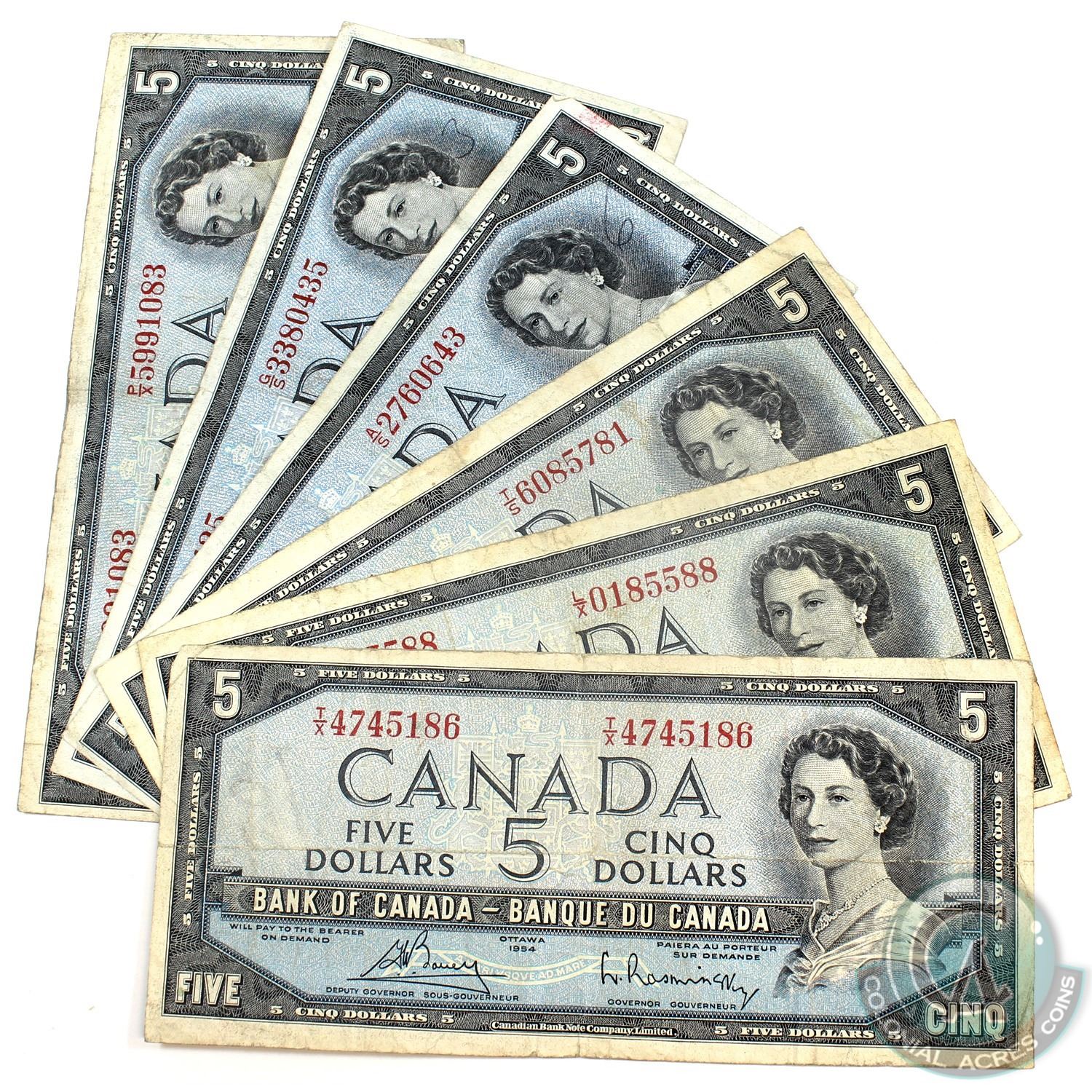 6x 1954 $5 Bank of Canada Modified Portrait Notes All Different Prefixes - 5x BC-39b & 1x BC-39c. 6pcs