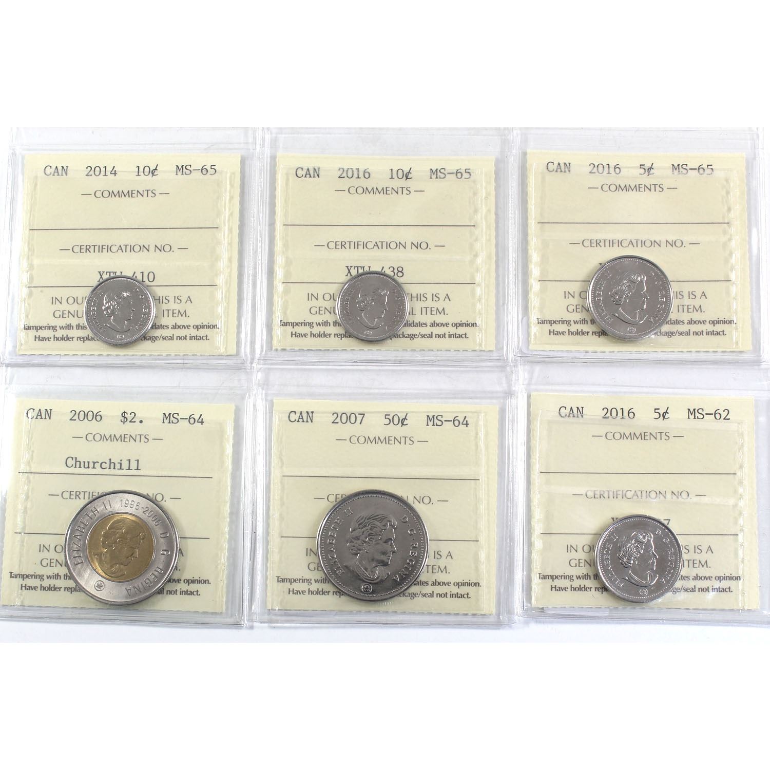 6x ICCS Certified Coins: 2006 Churchill $2 MS-64, 2007 50c MS-64, 2014 10c MS-65, 2016 5c MS-62, 2016 10c MS-65 & 2016 5c MS-65. 6pcs