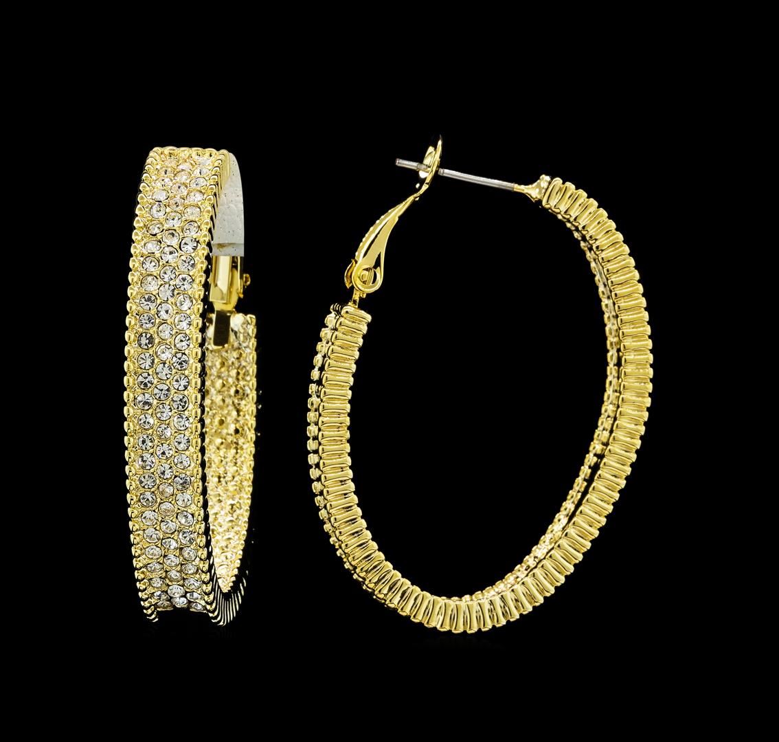 High end designer jewelry. 6x38mm Crystal Hoop Earrings - Gold Plated. Gold Plated Metal. Gold/ Clear. Hoop.