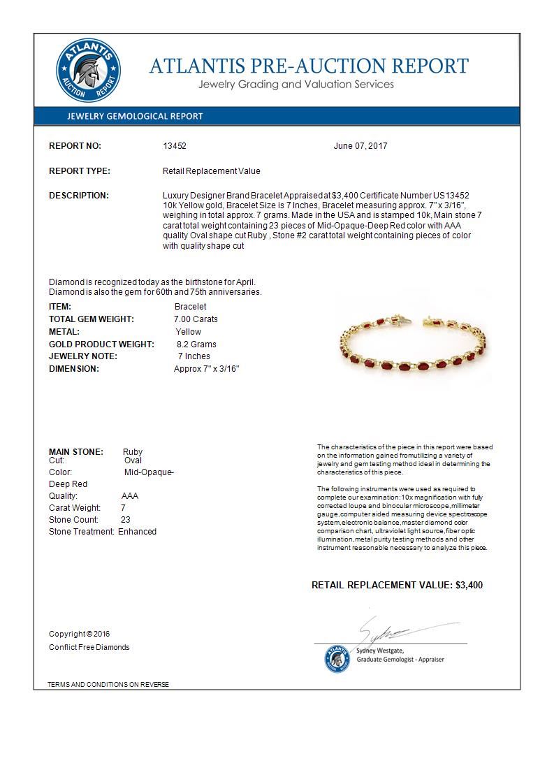 7.0 CTW Ruby Bracelet 10K Yellow Gold ---- Luxury Designer Brand Bracelet Appraised Retail Price at $3,400 ---- SKU Number US13452 10k Yellow gold Bracelet Size is 7 Inches, Bracelet measuring approx. 7" x 3/16", weighing in total approx. 7 grams. Made in the USA and is stamped 10k, Main stone 7 carat total weight containing 23 pieces of Mid-Opaque-Deep Red color with AAA quality Oval shape cut Ruby , Stone #2 carat total weight containing pieces of color with quality shape cut