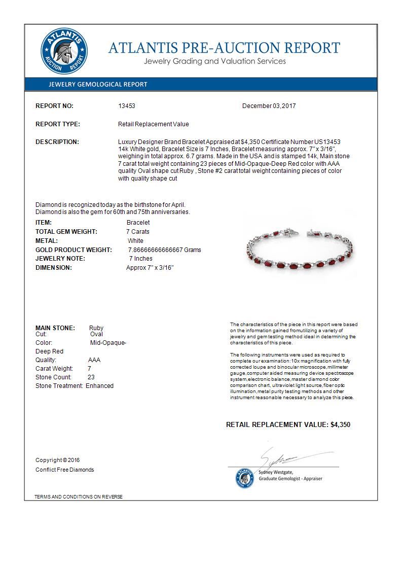 REF-60X9T -13453 ---- 7.0 CTW Ruby Bracelet 14K White Gold ---- Luxury Designer Brand Bracelet Appraised at $4,350 Certificate Number US13453 14k White gold, Bracelet Size is 7 Inches, Bracelet measuring approx. 7" x 3/16", weighing in total approx. 6.7 grams. Made in the USA and is stamped 14k, Main stone 7 carat total weight containing 23 pieces of Mid-Opaque-Deep Red color with AAA quality Oval shape cut Ruby , Stone #2 carat total weight containing pieces of color with quality shape cut