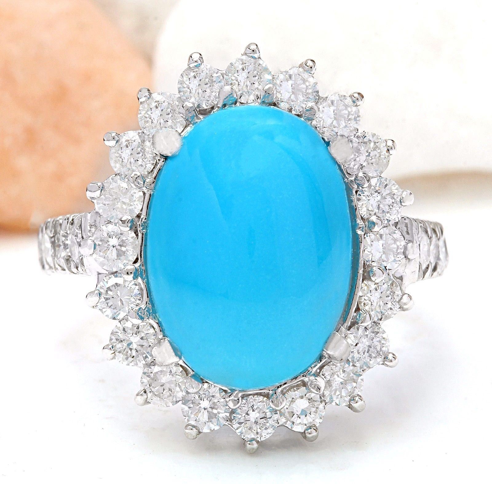 7.00 Carat Natural Turquoise 14K Solid White Gold Diamond Ring